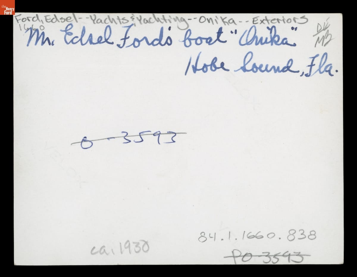 Edsel and Eleanor Ford commissioned their yacht Onika in 1930. The 115-foot-long vessel, built by Pusey & Jones of Wilmington, Delaware, contained four staterooms and was powered by two 275-horsepower diesel engines. The Fords primarily used Onika near their vacation home in Florida, but it was designed to be usable on the Great Lakes as well.