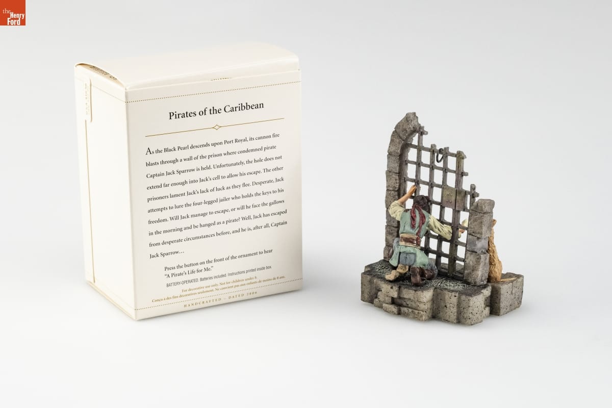 Pirates of the Caribbean / As the Black Pearl descends upon Port Royal, its cannon fire / blasts through a wall of the prison where condemned pirate / Captain Jack Sparrow is held. Unfortunately, the hole does not / extend far enough into Jack's cell to allow his escape. The other / prisoners lament Jack's lack of luck as they flee. Desperate, Jack / attempts to lure the four-legged jailer who holds the keys to his / freedom. Will Jack manage to escape, or will he face the gallows / in the morning and be hanged as a pirate? Well, Jack has escaped / from desperate circumstances before, and he is, after all, Captain / Jack Sparrow... / Press the button on the front of the ornament to hear / "A Pirate's Life for Me." / BATTERY-OPERATED. Batteries included. Instructions printed inside box. / For decorative use only. Not for children under 8. / Concue a des fins decoratives seulement. Ne convient pas aux enfants de moins de 8 ans. / HANDCRAFTED - DATED 2006