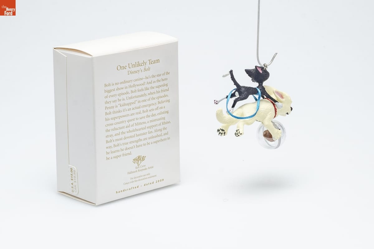 One Unlikely Team / Disney's Bolt / Bolt is no ordinary canine--he's the star of the / biggest show in Hollywood! And as the hero / of every episode, Bolt feels like the superdog / they say he is. Unfortunately, when his friend / Penny is "kidnapped" in one of the episodes, / Bolt thinks it's an actual emergency. Believing / his superpowers are real, Bolt sets off on a / cross-country quest to save the day, enlisting / the reluctant aid of Mittens, a mistrusting / stray, and the wholehearted support of Rhino, / Bolt's most devoted hamster fan. Along the / way, Bolt's true strengths are unleashed, and / he learns he doesn't have to be a superhero to / be a super friend. / Ken Crow / Hallmark Keepsake Artist / For decorative use only. / Concue a des fins decoratives seulement. / handcrafted - dated 2009