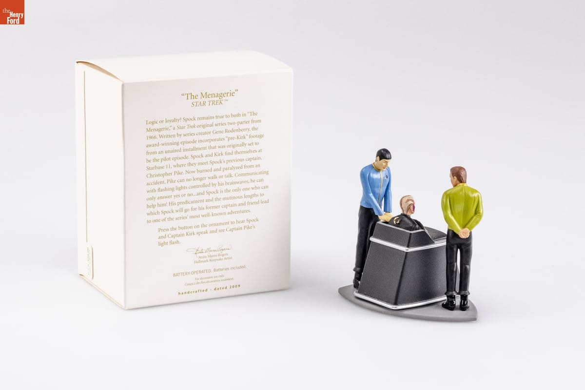 "The Menagerie" / STAR TREK / Logic or loyalty? Spock remains true to both in "The / Menagerie," a Star Trek original series two-parter from / 1966. Written by series creator Gene Rodenberry, the / award-winning episode incorporates "pre-Kirk" footage / from an unaired installment that was originally set to / be the pilot episode. Spock and Kirk find themselves at / Starbase 11, where they meet Spock's previous captain, / Christopher Pike. Now burned and paralyzed from an / accident, Pike can no longer walk or talk. Communicating / with flashing lights controlled by his brainwaves, he can / only answer yes or no...and Spock is the only one who can / help him! His predicament and the mutinous lengths to / which Spock will go for his former captain and friend lead / to one of the series' most well-known adventures. / Press the button on the ornament to hear Spock / and Captain Kirk speak and see Captain Pike's / light flash. / Anita Marra Rogers / Hallmark Keepsake Artist / BATTERY-OPERATED. Batteries included. / For decorative use only. / Concue a des fins decoratives seulement. / handcrafted - dated 2009