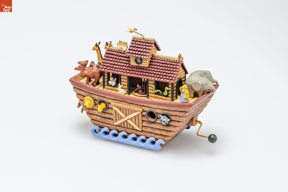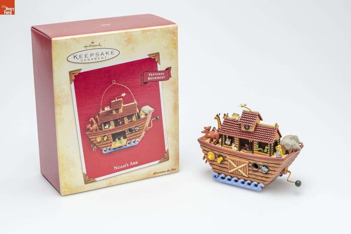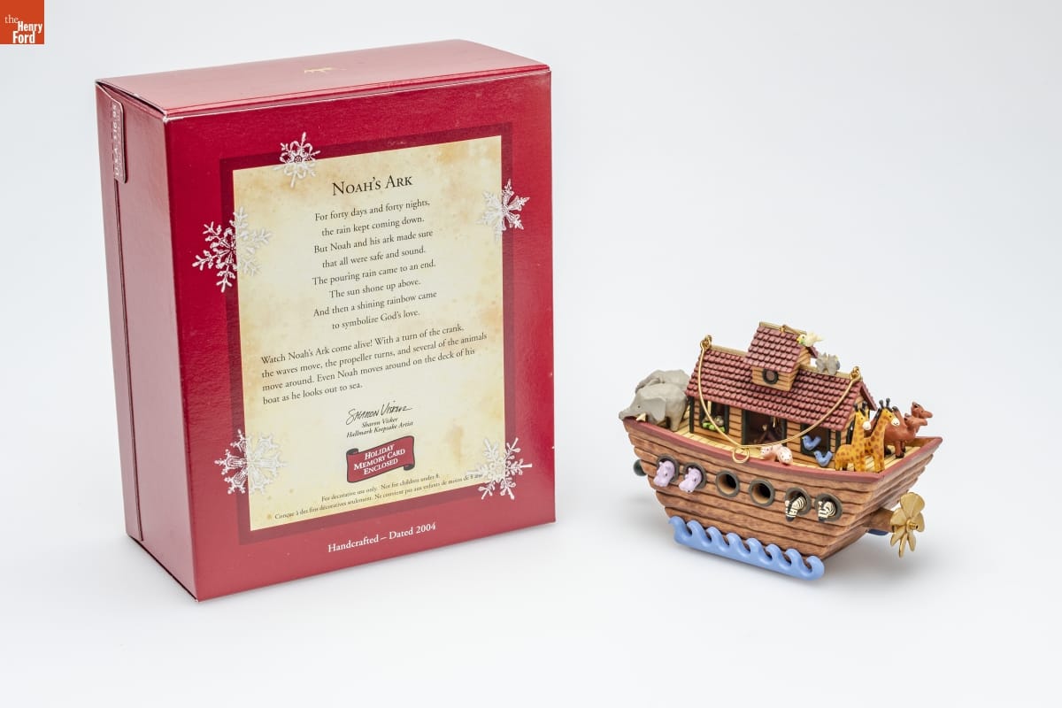on bottom of ornament: 2004 / (C) 2004 Hallmark Licensing, Inc. on front of packaging: Hallmark / KEEPSAKE / ORNAMENT / FEATURES / MOVEMENT / Christmas 2004 / NOAH'S ARK / decoration des fetes on back of packaging: NOAH'S ARK / For forty days and forty nights, / the rain kept coming down. / But Noah and his ark made sure / that all were safe and sound. / The pouring rain came to an end. / The sun shone up above. / And then a shining rainbow came / to symbolize God's love. / Watch Noah's Ark come alive! With a turn of the crank, / the waves move, the propeller turns, and several of the animals / move around. Even Noah moves around on the deck of his / boat as he looks out to sea. / Sharon Visker / Hallmark Keepsake Artist / HOLIDAY / MEMORY CARD / ENCLOSED / For decorative use only. Not for children under 8. / Concue a des fins decoratives seulement. Ne convient pas aux enfants de moins de 8 ans. / Handcrafted - Dated 2004 on bottom of packaging: (C) 2004 Hallmark Licensing, Inc. / Mfd. for Hallmark Cards, Inc., Kansas City, MO 64141 / Made in China QXG5371