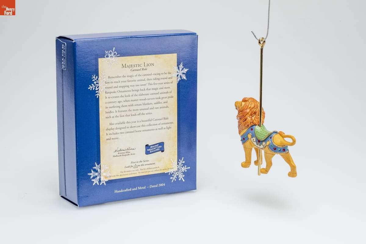 MAJESTIC LION / Carousel Ride / Remember the magic of the carousel-racing to be the / first to reach your favorite animal, then riding round and / round and stopping way too soon? This five-year series of / Keepsake Ornaments brings back that magic and more. / It re-creates the look of the elaborate carousel animals of / a century ago, when master wood-carvers took great pride / in outfitting them with ornate blankets, saddles, and / bridles. It features the more unusual and rare animals, / such as the lion that leads off the series. / Also available this year is a beautiful Carousel Ride / display designed to showcase this collection of ornaments. / It includes two carousel horse ornaments as well as light / and music. / Kristina Kline / Hallmark Keepsake Artist / HOLIDAY / MEMORY CARD / ENCLOSED / First in the Series / Look for 1 on this ornament. / For decorative use only. Not for children under 8. / Concue a des fins decoratives seulement. Ne convient pas aux enfants de moins de 8 ans. / Handcrafted and Metal - Dated 2004