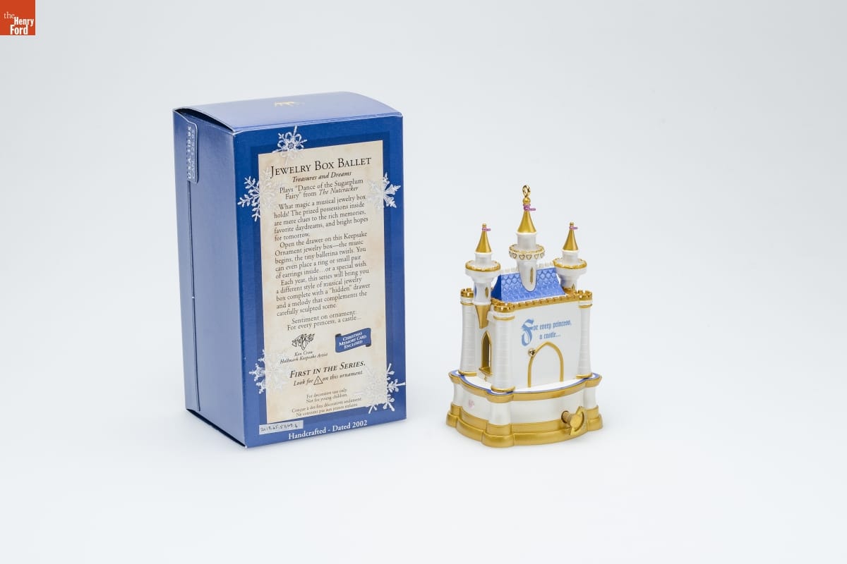 JEWELRY BOX BALLET / Treasures and Dreams. Plays "Dance of the Sugarplum / Fairy" from The Nutcracker / What magic a musical jewelry box / holds! The prized possessions inside / are mere clues to the rich memories, / favorite daydreams, and bright hopes / for tomorrow. / Open the drawer on this Keepsake / Ornament jewelry box -- the music / begins, the tiny ballerina twirls. You / can even place a ring or small pair / of earrings inside ... or a special wish. / Each year, this series will bring you / a different style of musical jewelry / box complete with a "hidden" drawer / and a melody that complements the / carefully sculpted scene. / Sentiment on ornament: / For every princess, a castle... / Ken Crow / Hallmark Keepsake Artist / CHRISTMAS / MEMORY CARD / ENCLOSED / FIRST IN THE SERIES. / Look for 1 on this ornament. / For decorative use only. / Not for young children. / Concue a des fins decoratives seulement. / Ne convient pas aux jeanes enfants. / Handcrafted - Dated 2002