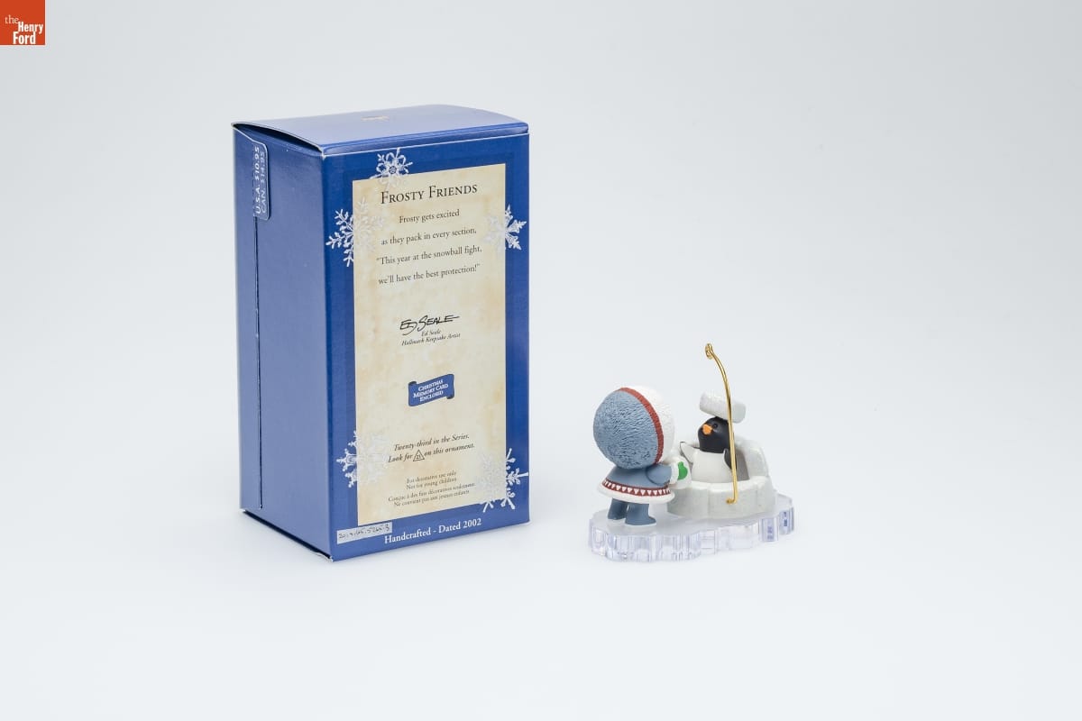 FROSTY FRIENDS / Frosty gets excited / as they pack in every section, / "This year at the snowball fight, / we'll have the best protection!" / Ed Seale / Hallmark Keepsake Artist / CHRISTMAS / MEMORY CARD / ENCLOSED / Twenty-third in this Series. / Look for 25 on this ornament. / For decorative use only. / Not for young children. / Concue a des fins decoratives seulement. / Ne convient pas aux jeunes enfants. / Handcrafted - Dated 2002