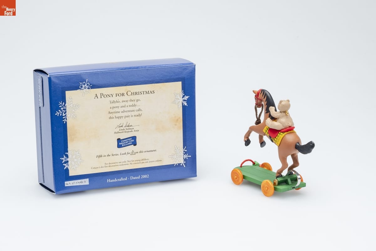 A PONY FOR CHRISTMAS / Tallyho, away they go, / a pony and a teddy ... / Anytime adventure calls, / this happy pair is ready! / Linda Sickman / Hallmark Keepsake Artist / CHRISTMAS / MEMORY CARD / ENCLOSED / Fifth in the Series. Look for 5 on this ornament. / For decorative use only. Not for young children. / Concue a des fins decoratives seulement. Ne convient pas aux jeanes enfants. / Handcrafted - Dated 2002