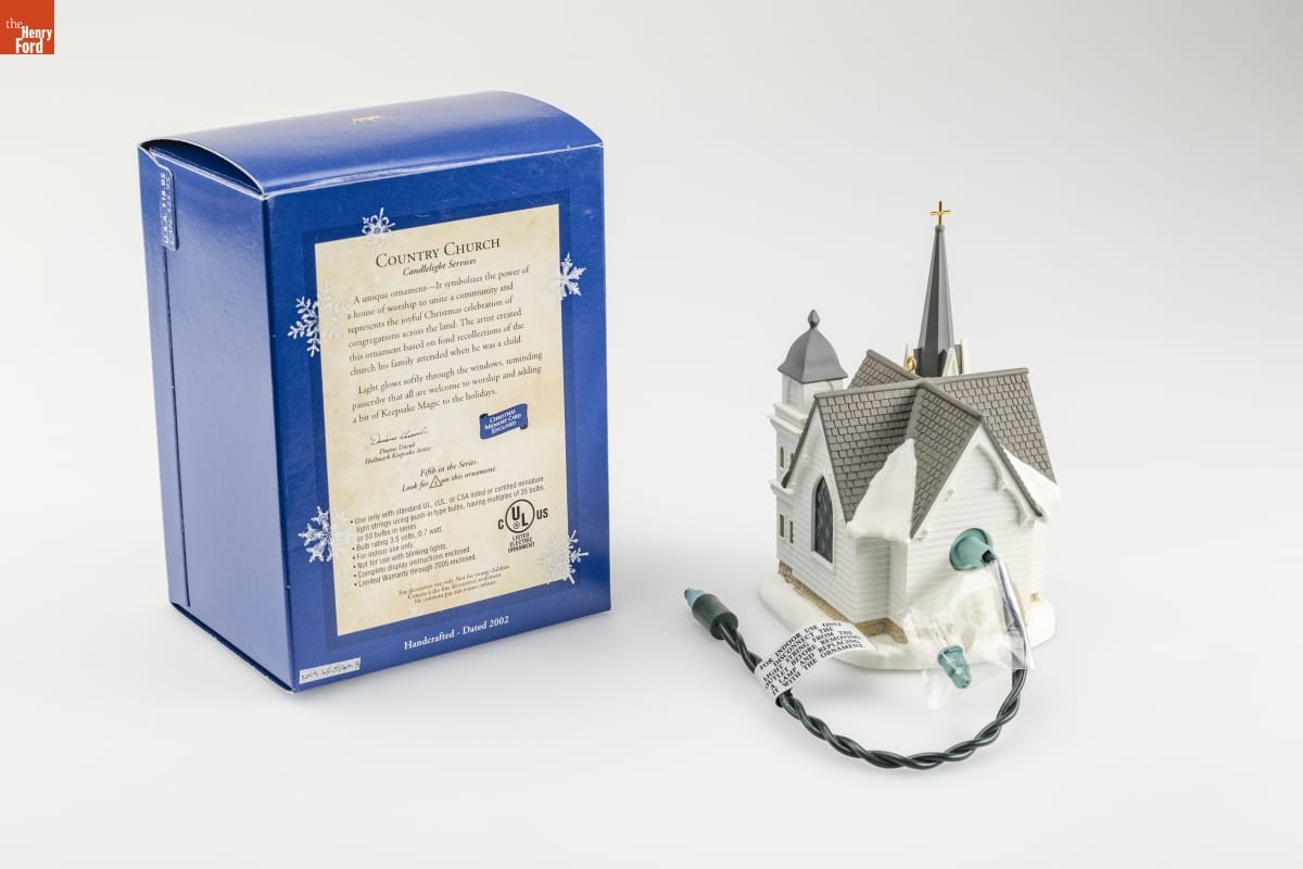 COUNTRY CHURCH / Candlelight Services / A unique ornament -- It symbolizes the power of / a house of worship to unite a community and / represents the joyful Christmas celebrations of / congregations across the land. The artist created / this ornament based on fond recollections of the / church his family attended when he was a child. / Light glows softly through the windows, reminding / passerby that all are welcome to worship and adding / a bit of Keepsake Magic to the holidays. / Duane Unruh / Hallmark Keepsake Artist / CHRISTMAS / MEMORY CARD / ENCLOSED / Fifth in the Series. / Look for 5 on this ornament / Use only with standard UL, cUL, or CSA listed or certified miniature / light strings using push-in type bulbs, having multiples of 35 bulbs / or 50 bulbs in series. / Bulb rating 3.5 volts, 0.7 watts. / For indoor use only. / Not for use with blinking lights. / Complete display instructions enclosed. / Limited Warranty through 2005 enclosed. / C UL (R) US / LISTED / ELECTRIC / ORNAMENT / For decorative use only. Not for young children. / Concue a des fins decoratives seulement. / Ne convient pas aux jeanes enfants. / Handcrafted - Dated 2002