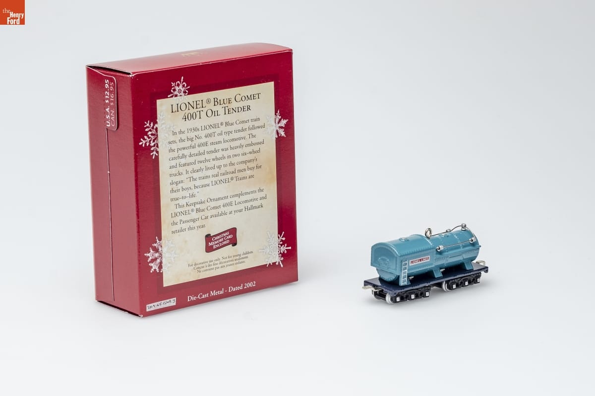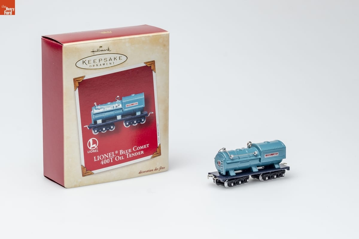 LIONEL [R] BLUE COMET / 400T OIL TENDER / In the 1930s LIONEL [R] Blue Comet train / sets, the big No. 400T oil type tender followed / the powerful 400E steam locomotive. The / carefully detailed tender was heavily embossed / and featured twelve wheels in two six-wheel / trucks. It clearly lived up to the company's / slogan: "The trains real railroad men buy for / their boys, because LIONEL [R] Trains are / true-to-life." / This Keepsake Ornament complements the / LIONEL [R] Blue Comet 400E Locomotive and / the Passenger Car available at your Hallmark / retailer this year. / CHRISTMAS / MEMORY CARD / ENCLOSED / For decorative use only. Not for young children. / Concue a des fins decoratives seulement. / Ne convient pas aux jeanes enfants. / Die-Cast Metal - Dated 2002
