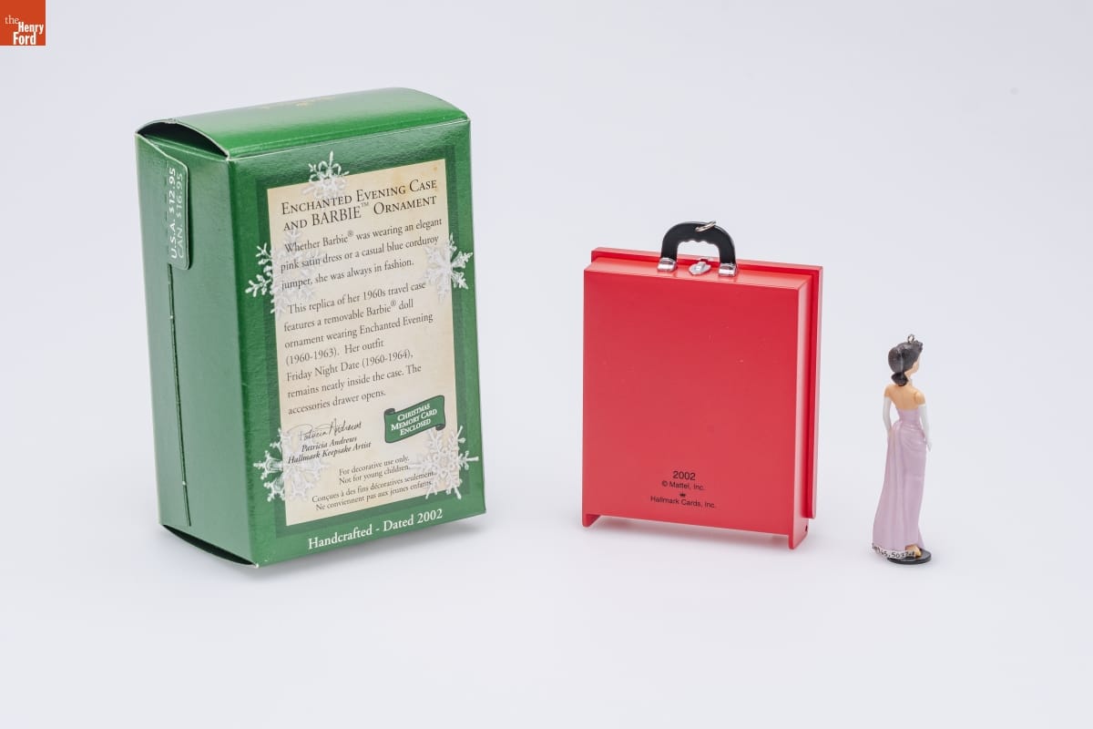 ENCHANTED EVENING CASE / AND BARBIE TM ORNAMENT / Whether Barbie(R) was wearing an elegant / pink satin dress or a casual blue corduroy / jumper, she was always in fashion. / This replica of her 1960s travel case / features a removable Barbie(R) doll / ornament wearing Enchanted Evening / (1960-1963). Her outfit / Friday Night Date (1960-1964), / remains nearly inside the case. The / accessories drawer opens. / CHRISTMAS / MEMORY CARD / ENCLOSED / Patricia Andrews / Hallmark Keepsake Artist / For decorative use only. / Not for young children. / Concues a des fins decoratives seulement. / Ne conviennent pas aux jeunes enfants. / Handcrafted - Dated 2002