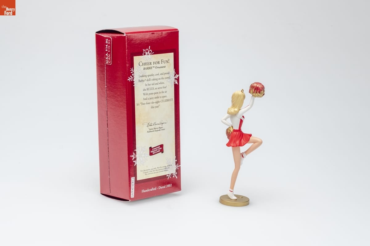 CHEER FOR FUN! / BARBIE [TM] Ornament / Looking spunky, cool, and proud, / Barbie [R] doll's taking on the crowd, / In her red and white, / she RULES, so never fear! / With pom-pom in the air / And a jazzy smile to spare, / It's "Two - four - six - eight - CELEBRATE / this year! / Anita Marra Rogers / Hallmark Keepsake Artist / CHRISTMAS / MEMORY CARD / ENCLOSED / For decorative use only. Not for young children. / Concue a des fins decoratives seulement. / Ne convient pas aux jeanes enfants. / Handcrafted - Dated 2002