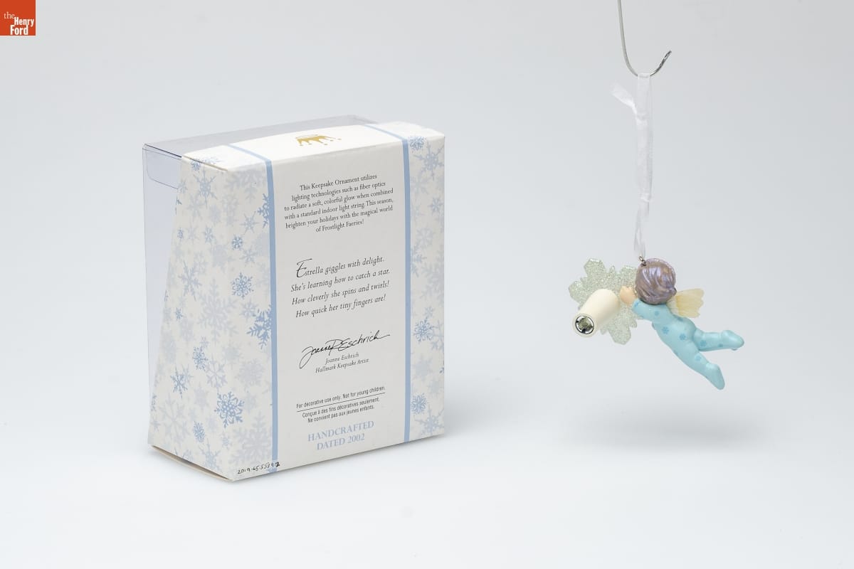 This Keepsake Ornament utilizes / lighting technologies such as fiber optics / to radiate a soft, colorful glow when combined / with a standard indoor light string. This season, / brighten your holidays with the magical world / of Frostlight Faeries! / Estrella giggles with delight. / She's learning how to catch a star. / How cleverly she spins and twirls! / How quick her tiny fingers are! / Joanne Eschrich / Hallmark Keepsake Artist / For decorative use only. / Not for young children. / Concue a des fins decoratives seulement. / Ne convient pas aux jeanes enfants. / HANDCRAFTED / DATED 2002
