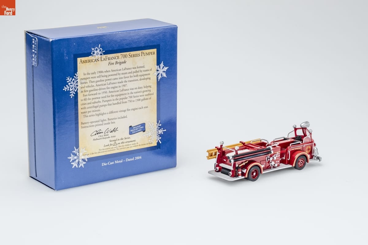AMERICAN LAFRANCE 700 SERIES PUMPER / Fire Brigade / In the early 1900s when American LaFrance was formed, / pumpers were still being powered by steam and pulled by teams of / horses. Then gasoline power came into favor for both equipment / and vehicles. American LaFrance made the transition, developing / its first gasoline-driven fire engine in 1907. / Fast-forward-to 1950. American LaFrance was on duty, helping / to fill the postwar need for fire equipment in the nation's growing / cities and suburbs. Pumpers in the popular 700 Series were outfitted / with centrifugal pumps that handled from 750 to 1500 gallons of / water per minute. / This series highlights a different vintage fire engine each year. / Battery-operated lights. Batteries included. / Instructions printed inside box. / Chris Webb / Hallmark Keepsake Artist / HOLIDAY / MEMORY CARD / ENCLOSED / Second in the Series / Look for 2 on this ornament. / For decorative use only. Not for children under 8. / Concue a des fins decoratives seulement. Ne convient pas aux enfants de moins de 8 ans. / Die-Cast Metal - Dated 2004