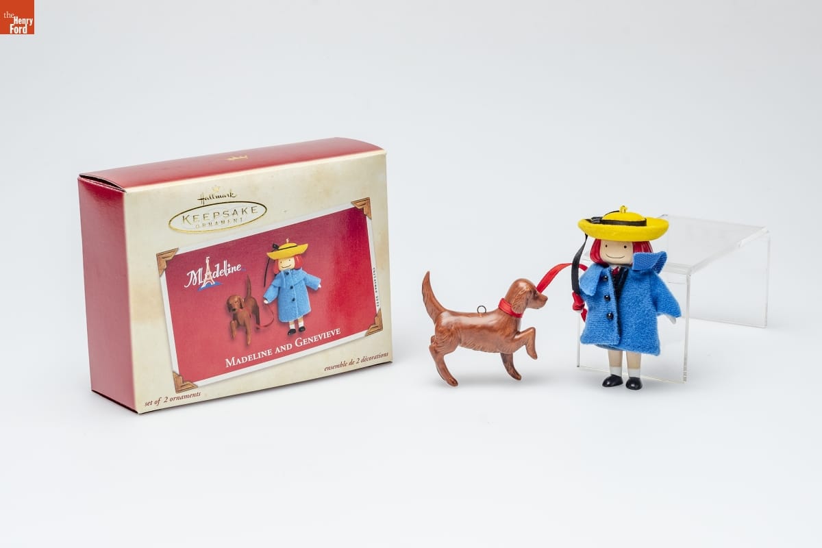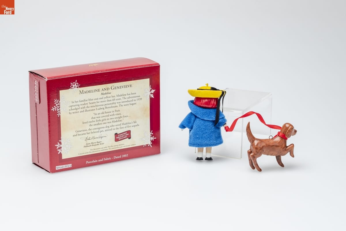 MADELINE AND GENEVIEVE / Madeline / In her familiar blue coat and yellow hat, Madeline has been / capturing readers' hearts for more than 60 years. The adventurous / schoolgirl with the mischievous personality was introduced in 1939 / by writer and illustrator Ludwig Bemelmans. The story began: / "In an old house in Paris / that was covered with vines, / lived twelve little girls in two straight lines ... / the smallest one was Madeline." / Genevieve, the courageous dog who saved Madeline's life / and became her beloved pet, arrived in the first of five sequels. / Anita Marra Rogers / Hallmark Keepsake Artist / CHRISTMAS / MEMORY CARD / ENCLOSED / For decorative use only. Not for young children. / Concues a des fins decoratives seulement. Ne conviennent pas aux jeanes enfants. / Porcelain and Fabric - Dated 2002