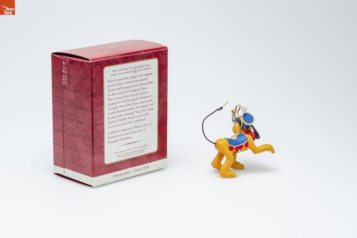 Fifth in the Mickey's Holiday Parade Series. / Look for series verification 5 on this ornament. / How do you teach a happy, tail-wagging / pooch to play a musical instrument? / Mickey and the gang solved that problem / for their loyal, fun-loving pal Pluto. / They've given him a special uniform / equipped to hold a musical instrument-- / a triangle. Now when Pluto wags his tail, / a small drumstick strikes the triangle with / an important-sounding "Ting!" No wonder / Mickey's Holiday Parade is such a hit... / everyone is part of the celebration! / A different character of Mickey & Co. is / featured each year in this series of / Keepsake Ornaments. / For decorative use only. Not for young children. / Concue a des fins decoratives seulement. / Ne convient pas aux jeunes enfants. / Handcrafted - Dated 2001