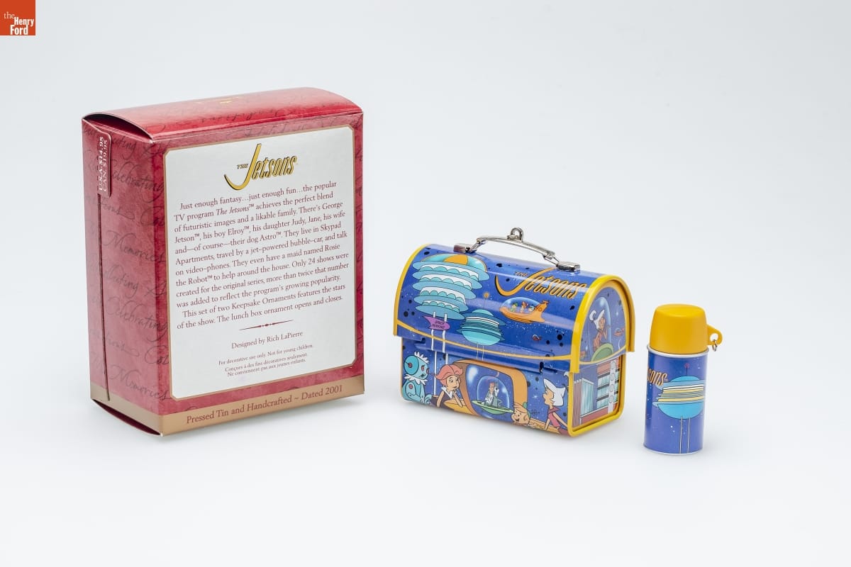 THE JETSONS / Just enough fantasy...just enough fun...the popular / TV program The Jetsons TM achieves the perfect blend / of futuristic images and a likable family. There's George / Jetson TM, his boy Elroy TM, his daughter Judy, Jane, his wife / and--of course--their dog Astro TM. They live in Skypad / Apartments, travel by jet-powered bubble-car, and talk / on video-phones. They even have a maid named Rosie / the Robot TM to help around the house.Only 24 shows were / created for the original series, more than twice that number/ were added to reflect the program's growing popularity. / This set of two Keepsake Ornaments features the stars / of the show. The lunch box ornament opens and closes. / Designed by Rich LaPierre / For decorative use only. Not for young children. / Concue a des fins decoratives seulement. / Ne convient pas aux jeunes enfants. / Pressed Tin and Handcrafted - Dated 2001