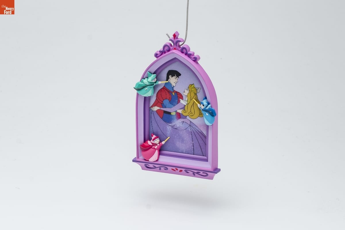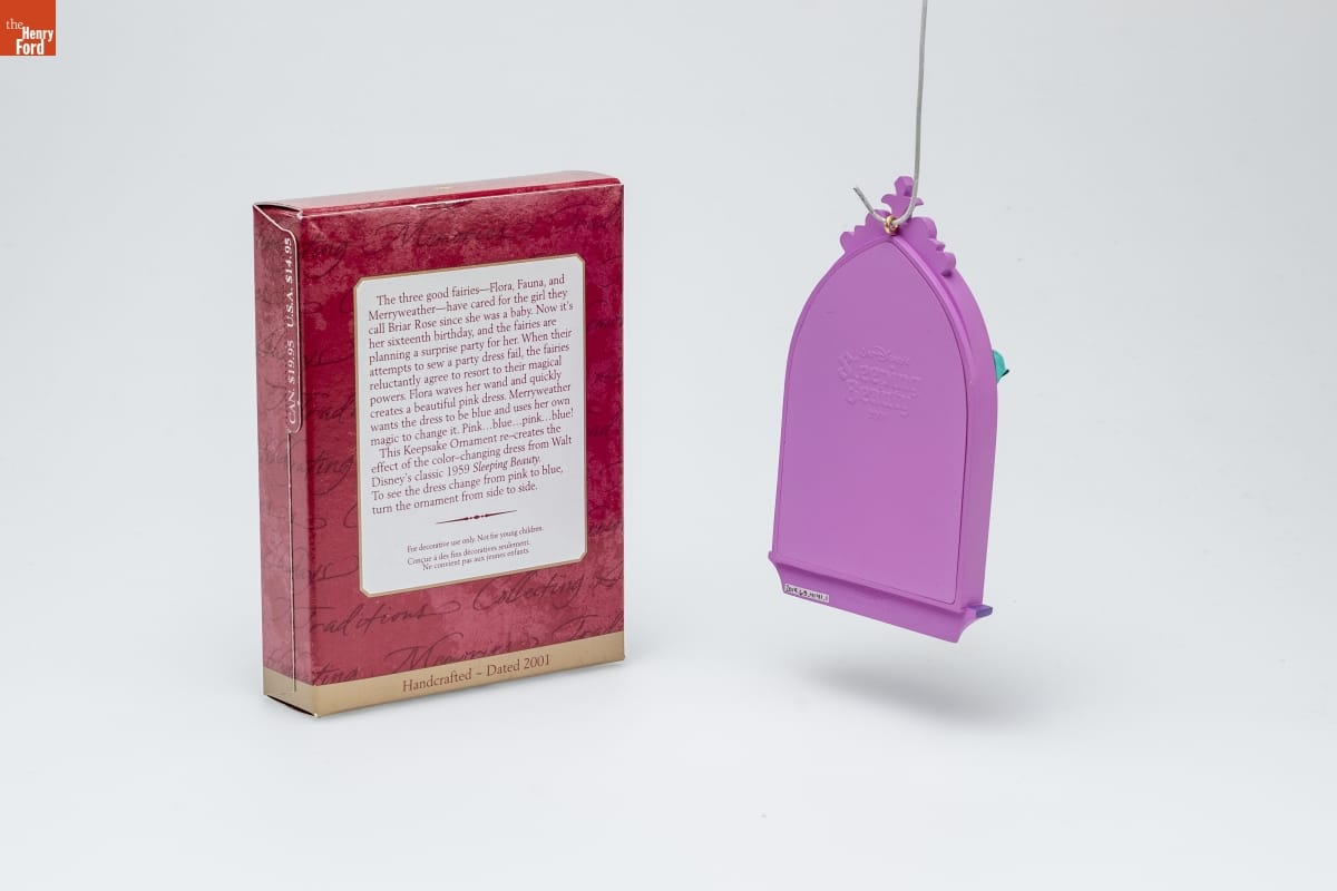 The three good fairies--Flora, Fauna, and / Merryweather--have cared for the girl they / call Briar Rose since she was a baby. Now it's / her sixteenth birthday, and the fairies are / planning a surprise party for her. When their / attempts to sew a party dress fail, the fairies / reluctantly agree to resort to their magical / powers. Flora waves her wand and quickly / creates a beautiful pink dress. Merryweather / wants the dress to be blue and uses her own / magic to change it. Pink...blue...pink...blue! / This Keepsake Ornament re-creates the / effect of the color-changing dress from Walt / Disney's classic 1959 Sleeping Beauty. / To see the dress change from pink to blue, / turn the ornament from side to side. / For decorative use only. Not for young children. / Concue a des fins decoratives seulement. / Ne convient pas aux jeunes enfants. / Handcrafted - Dated 2001