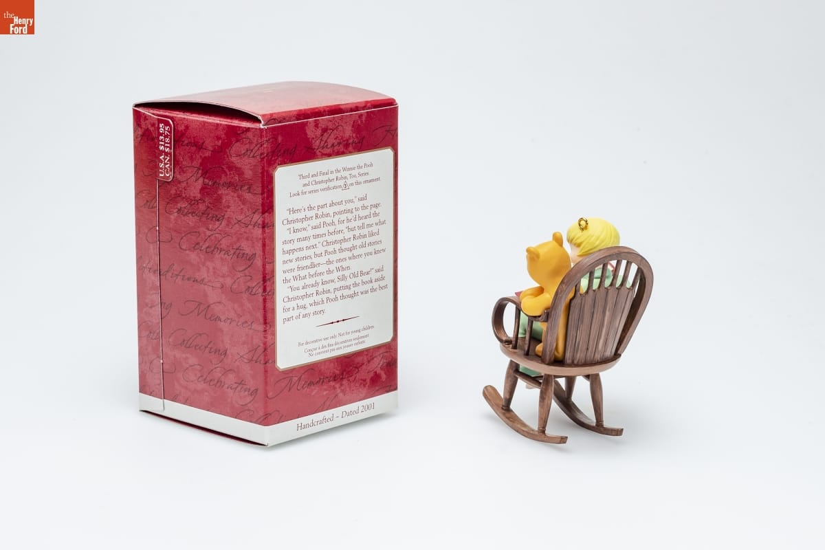 Third and Final in the Winnie the Pooh / and Christopher Robin, Too, Series. / Look for series verification 3 on this ornament. / "Here's the part about you," said / Christopher Robin, pointing to the page. / "I know," said Pooh, for he'd heard the / story many times before, "but tell me what / happens next." Christopher Robin liked / new stories, but Pooh thought old stories / were friendlier--the ones where you knew / the What before the When. / "You already know, Silly Old Bear!" said / Christopher Robin, putting the book aside / for a hug, which Pooh thought was the best / part of any story. / For decorative use only. Not for young children. / Concue a des fins decoratives seulement. / Ne convient pas aux jeunes enfants. / Handcrafted - Dated 2001