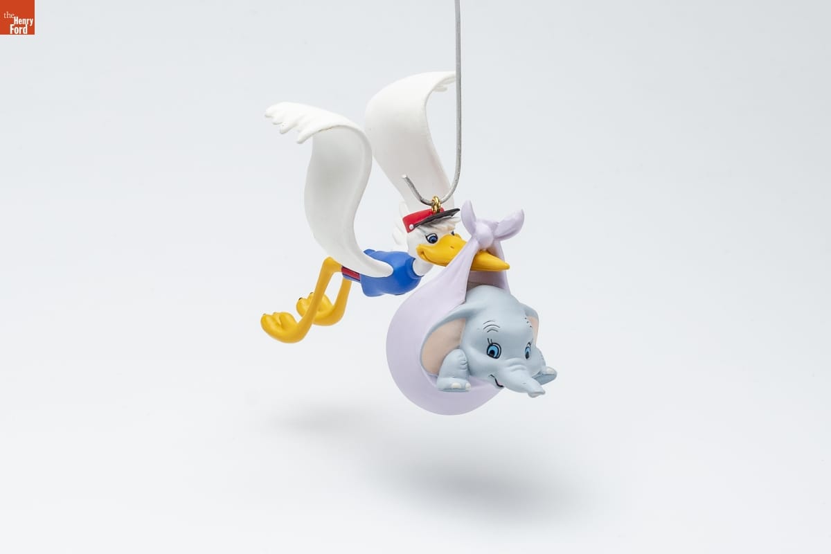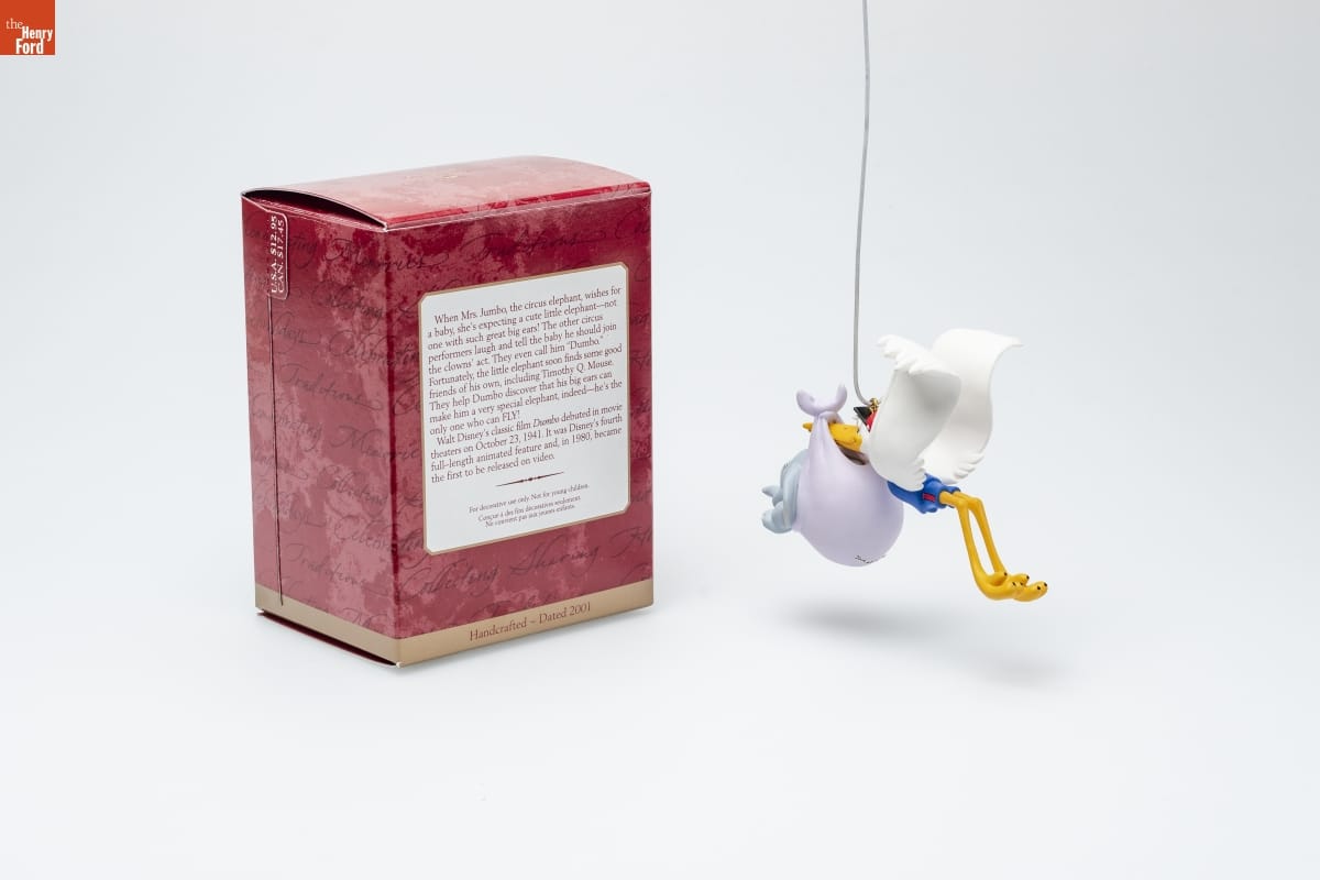 When Mrs. Jumbo, the circus elephant, wishes for / a baby, she's expecting a cute little elephant--not / one with such great big ears! The other circus / performers laugh and tell the baby he should join / the clowns' act. They even call him "Dumbo." / Fortunately, the little elephant soon finds some good / friends of his own, including Timothy Q. Mouse. / They help Dumbo discover that his big ears can / make him a very special elephant, indeed, he's the / only one who can FLY! / Walt Disney's classic film Dumbo debuted in movie / theaters on October 23, 1941. It was Disney's fourth / full-length animated feature, and in 1980, became / the first to be released on video. / For decorative use only. Not for young children. / Concue a des fins decoratives seulement. / Ne convient pas aux jeunes enfants. / Handcrafted - Dated 2001