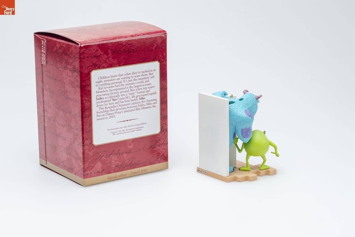 Children know that when they're tucked in at / night, monsters are waiting to scare them. But / it's nothing personal. It's just the monsters' job. / Kid screams fuel the monster world, and / Monsters, Incorporated is the largest scream- / processing factory around. But when top scarer / Sulley accidentally lets a "toxic" human girl / (nicknamed "Boo") into M.I., life gets turned upside / down for him and his best buddy Mike. / This Keepsake Ornament captures the charming / friendship that develops between Sulley, Mike and / Boo in Disney/Pixar's animated film Monsters, Inc., / issued in 2001. / For decorative use only. Not for young children. / Concue a des fins decoratives seulement. / Ne convient pas aux jeunes enfants. / Handcrafted - Dated 2001