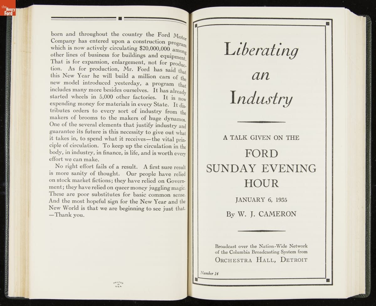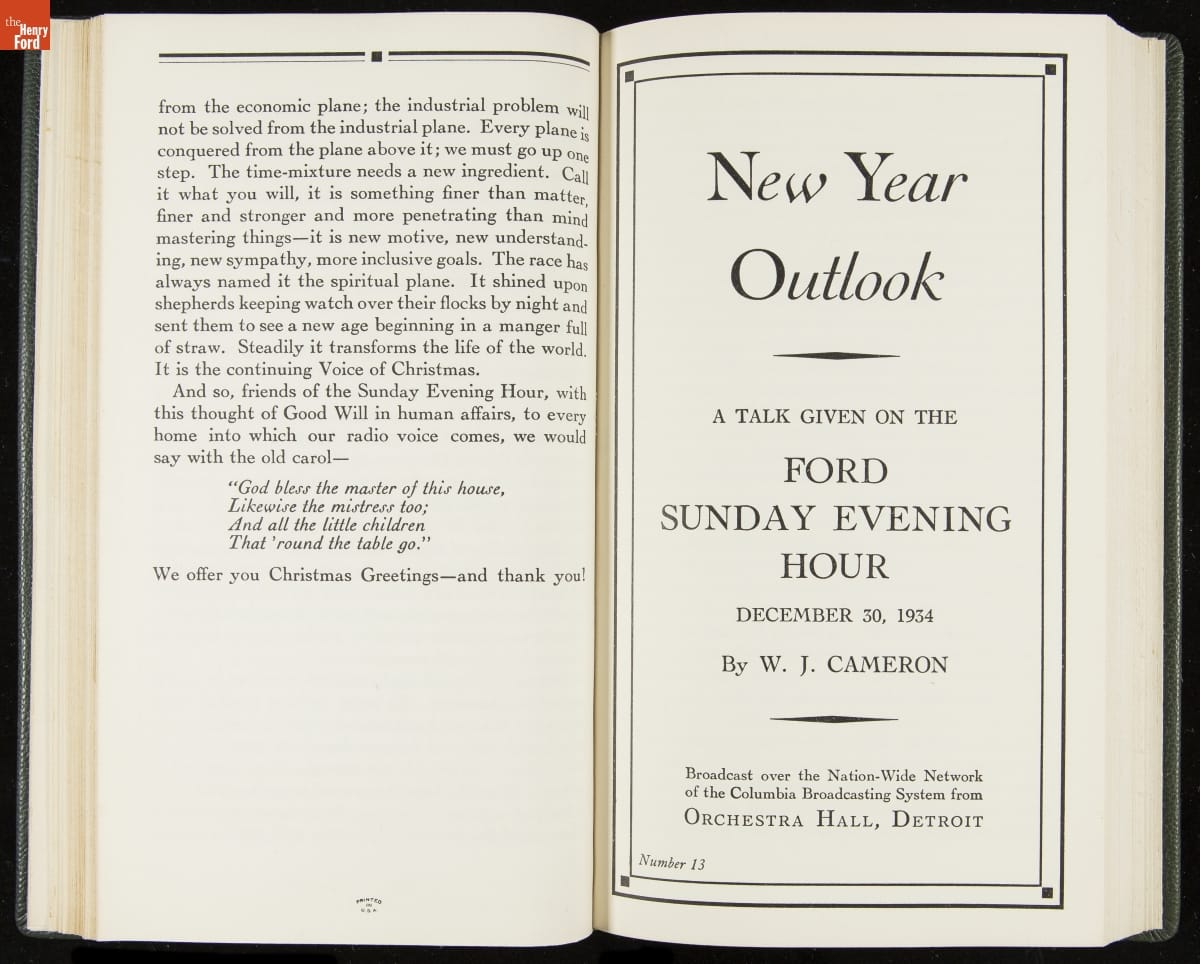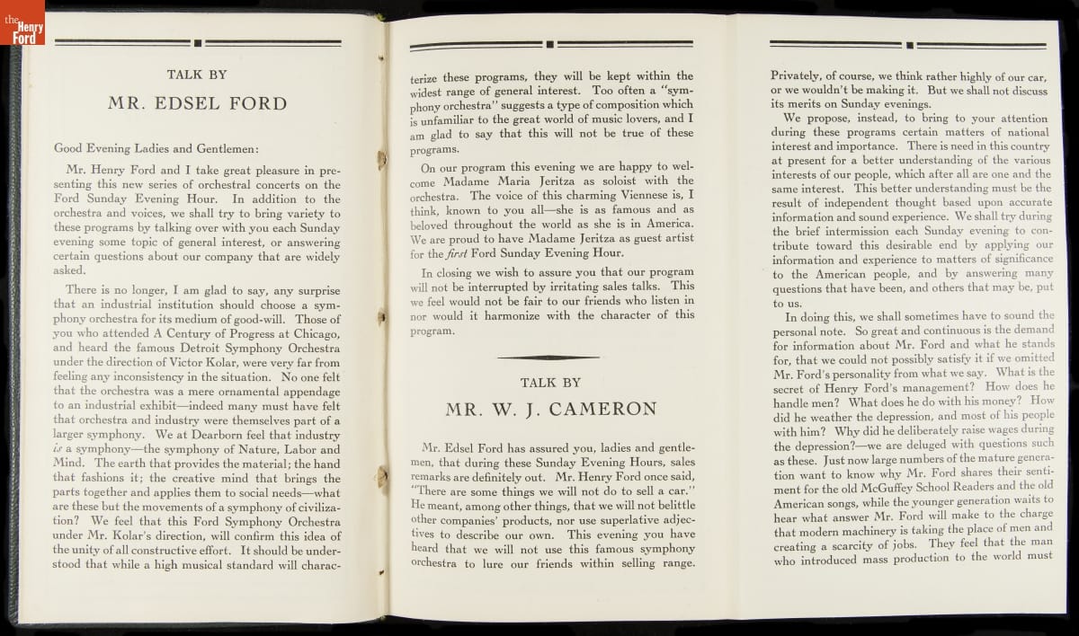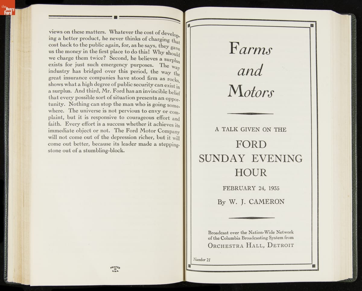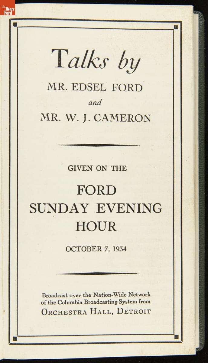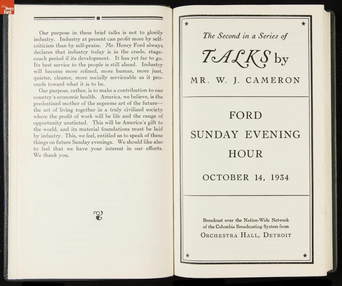 Launched in 1934, the Ford Sunday Evening Hour radio program featured classical music, guest soloists and conductors, and a weekly talk during intermission. Henry Ford asked his friend and advisor William J. Cameron to write and deliver these messages. Cameron, who composed the anti-Semitic articles for The Dearborn Independent, now peddled softer populist views--avoiding extremes and any direct attacks on politicians, ethnic groups, or Wall Street financiers.