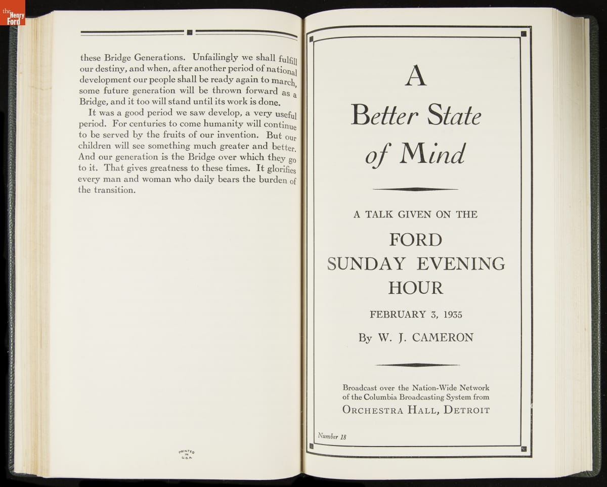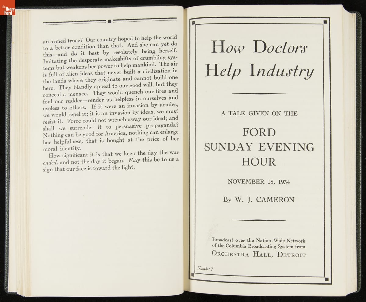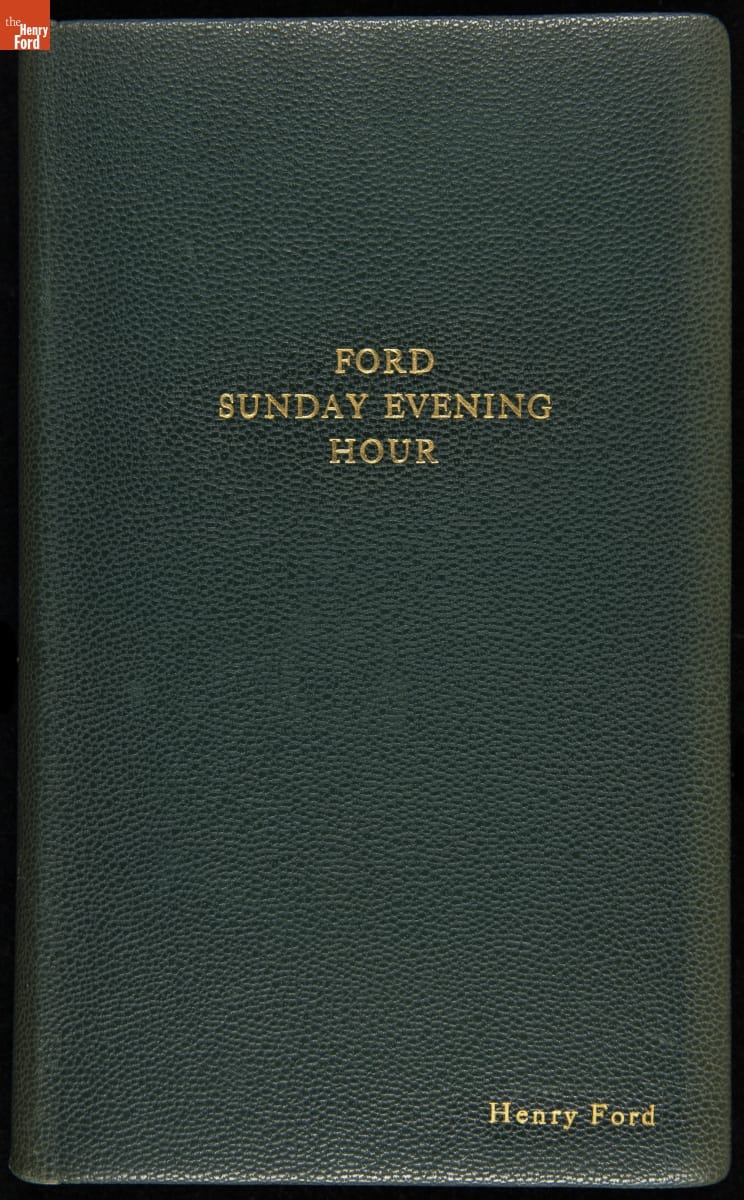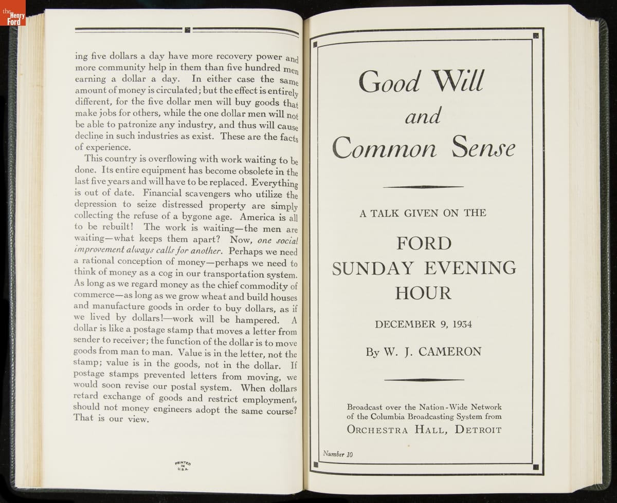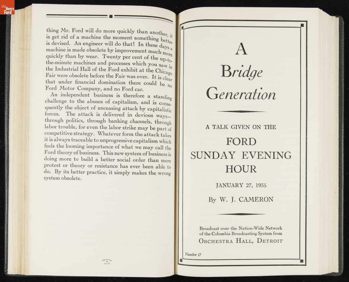 Launched in 1934, the Ford Sunday Evening Hour radio program featured classical music, guest soloists and conductors, and a weekly talk during intermission. Henry Ford asked his friend and advisor William J. Cameron to write and deliver these messages. Cameron, who composed the anti-Semitic articles for The Dearborn Independent, now peddled softer populist views--avoiding extremes and any direct attacks on politicians, ethnic groups, or Wall Street financiers.