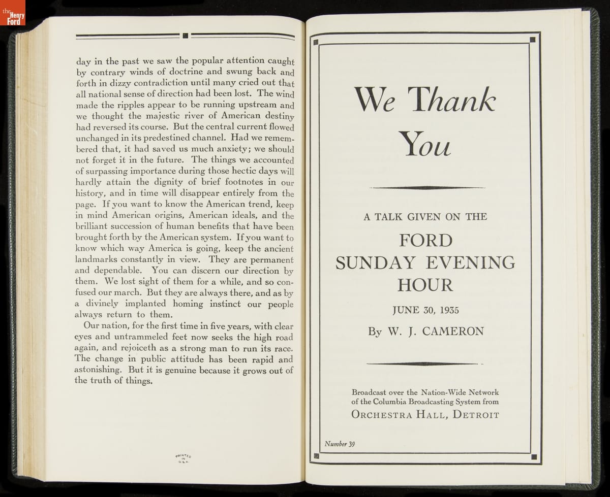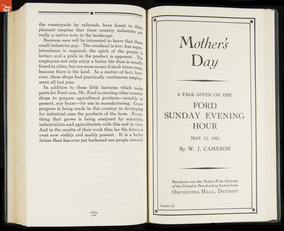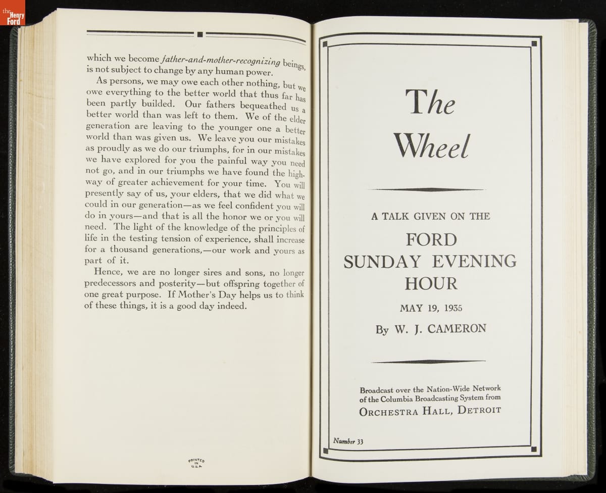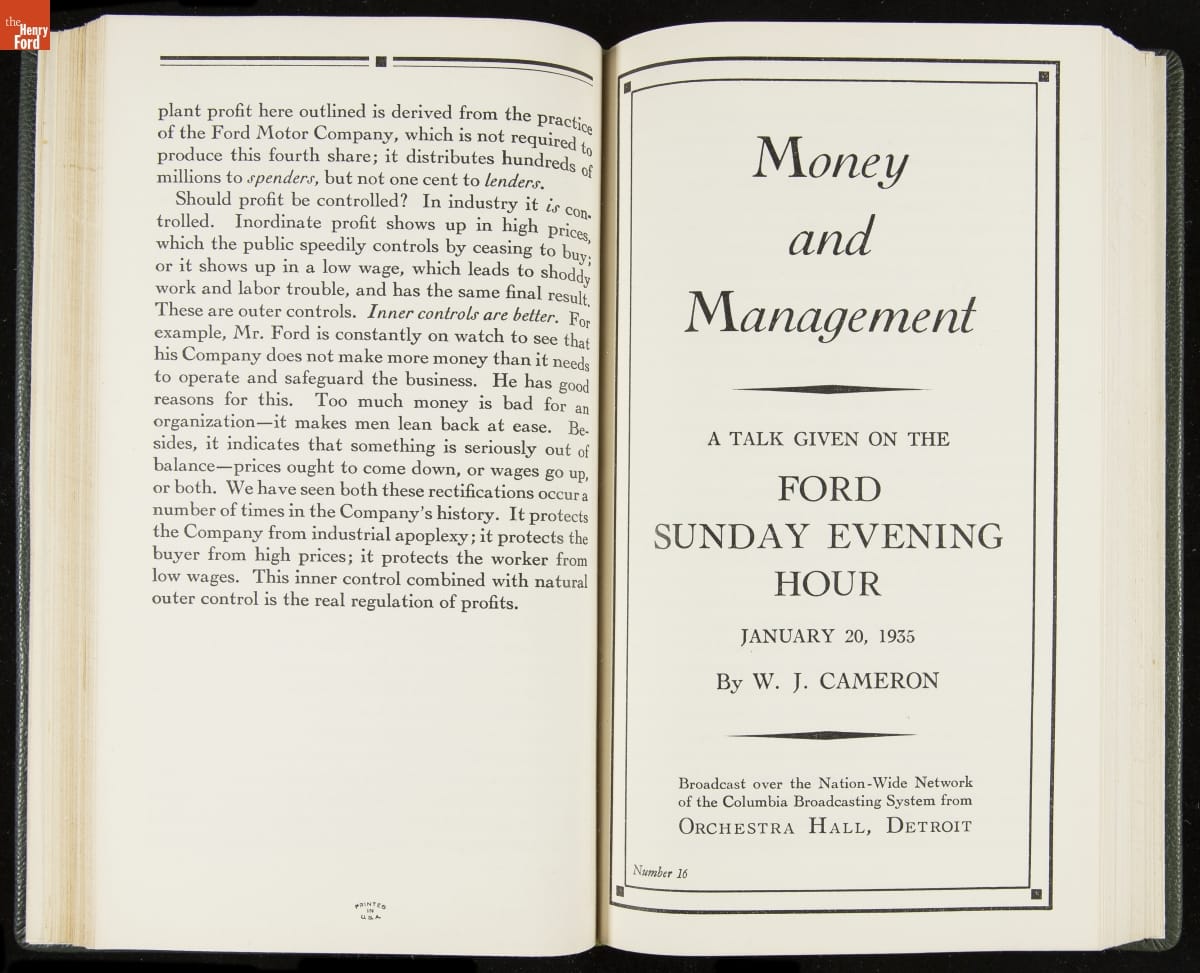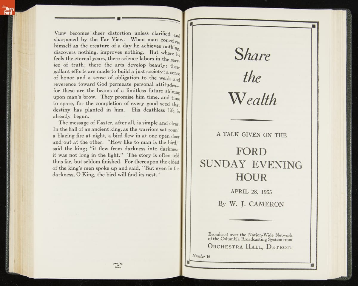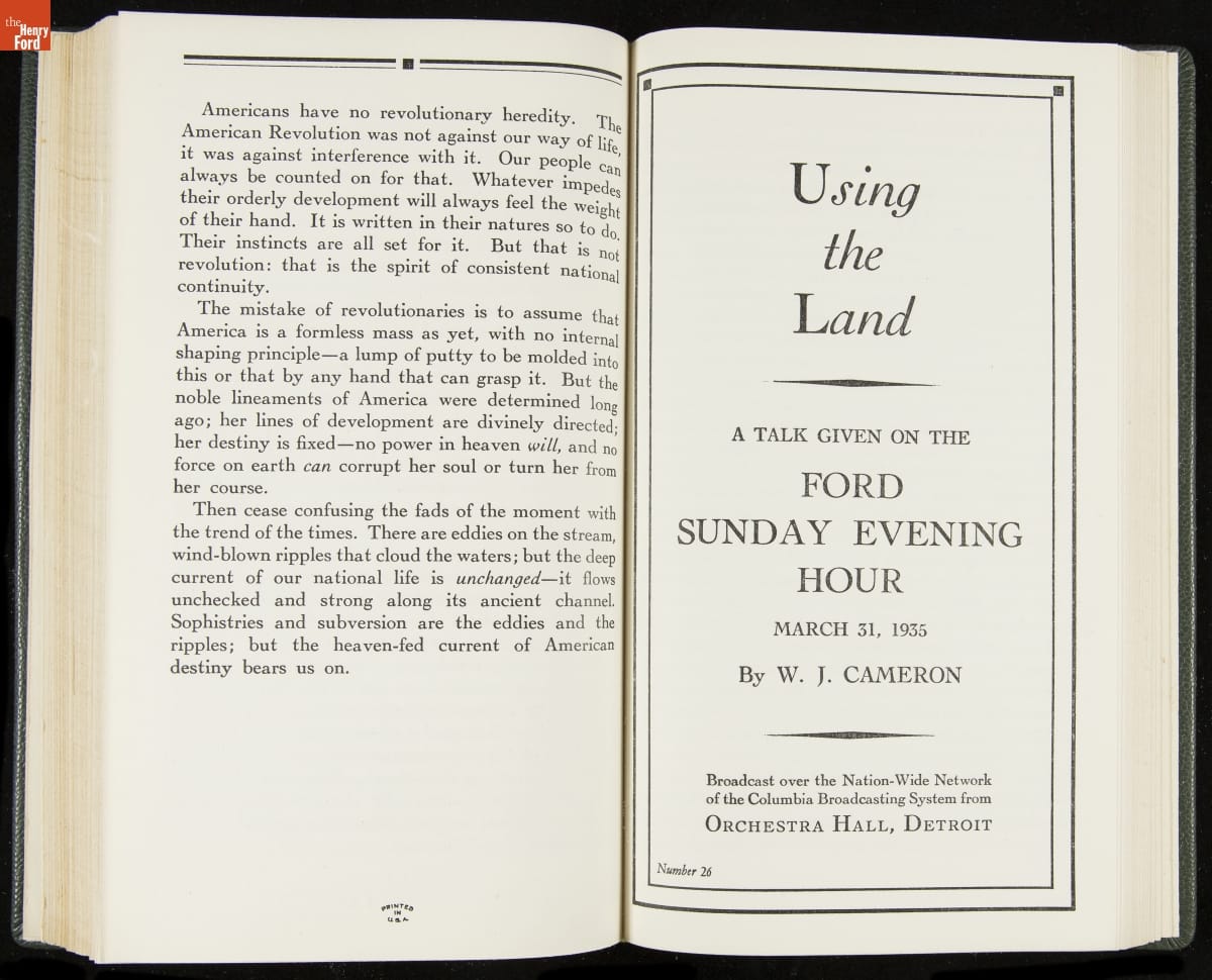 Launched in 1934, the Ford Sunday Evening Hour radio program featured classical music, guest soloists and conductors, and a weekly talk during intermission. Henry Ford asked his friend and advisor William J. Cameron to write and deliver these messages. Cameron, who composed the anti-Semitic articles for The Dearborn Independent, now peddled softer populist views--avoiding extremes and any direct attacks on politicians, ethnic groups, or Wall Street financiers.