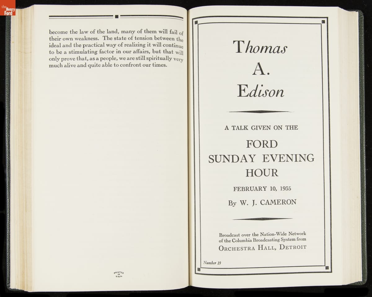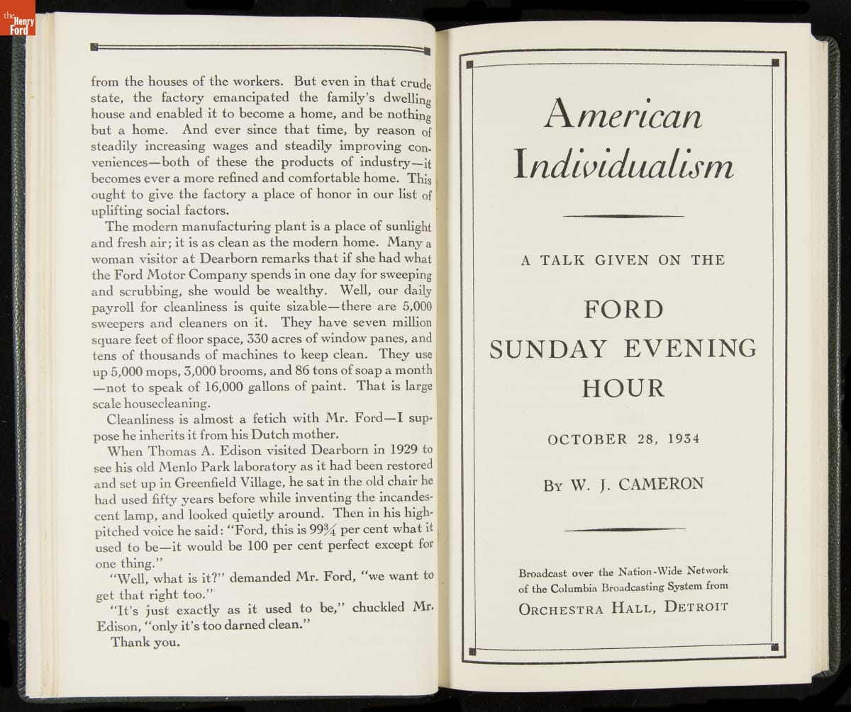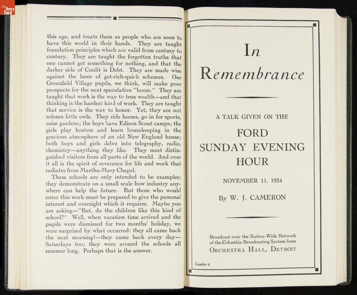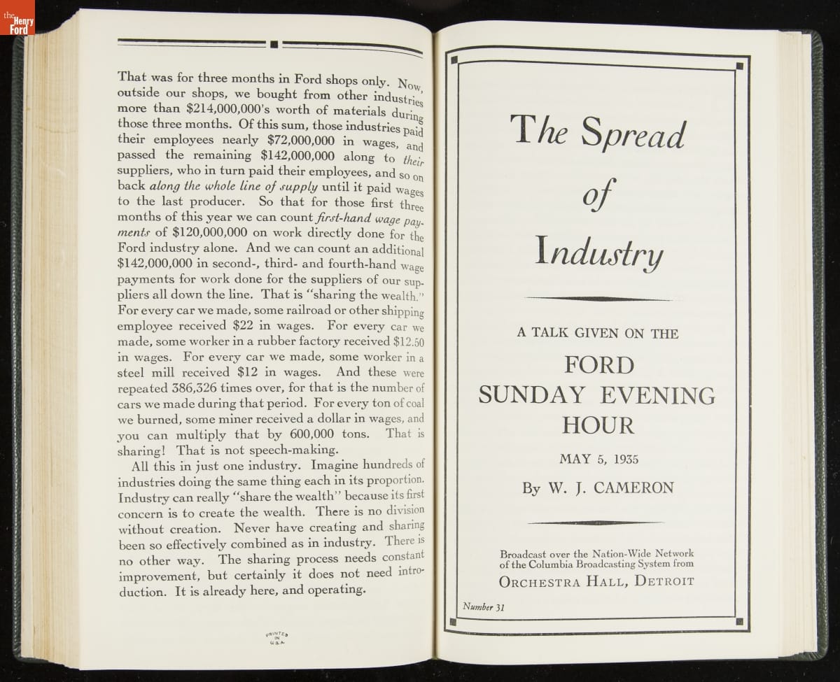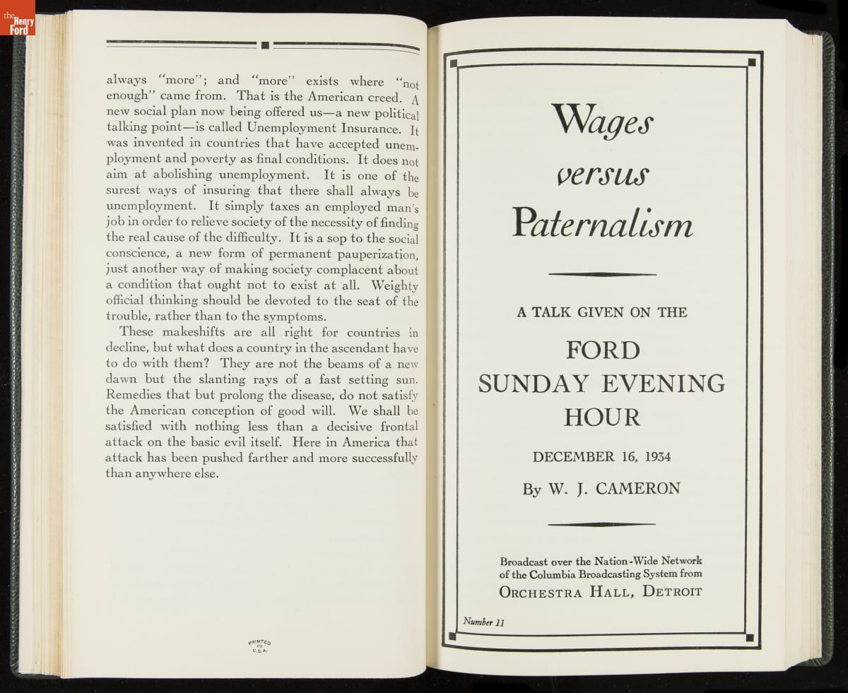 Launched in 1934, the Ford Sunday Evening Hour radio program featured classical music, guest soloists and conductors, and a weekly talk during intermission. Henry Ford asked his friend and advisor William J. Cameron to write and deliver these messages. Cameron, who composed the anti-Semitic articles for The Dearborn Independent, now peddled softer populist views--avoiding extremes and any direct attacks on politicians, ethnic groups, or Wall Street financiers.