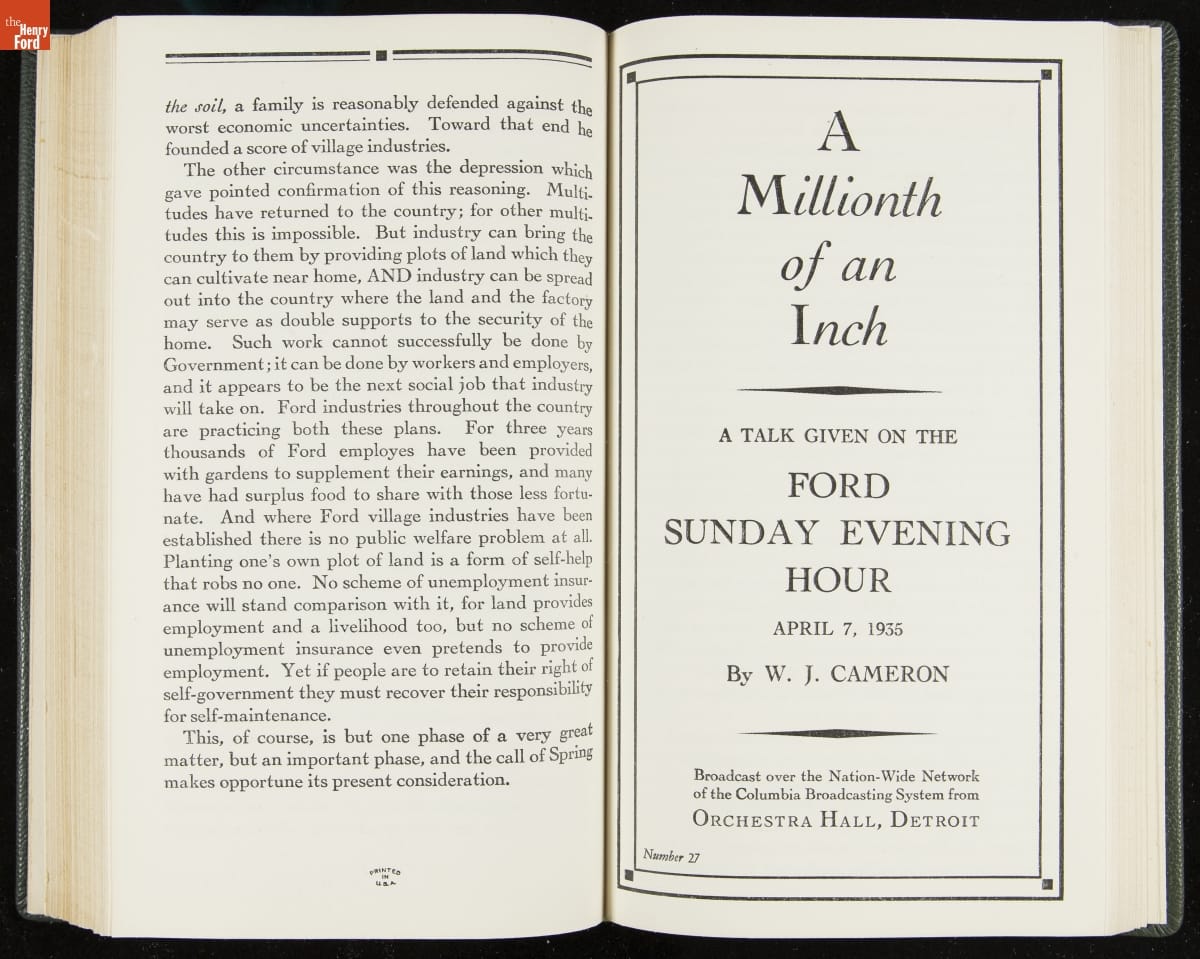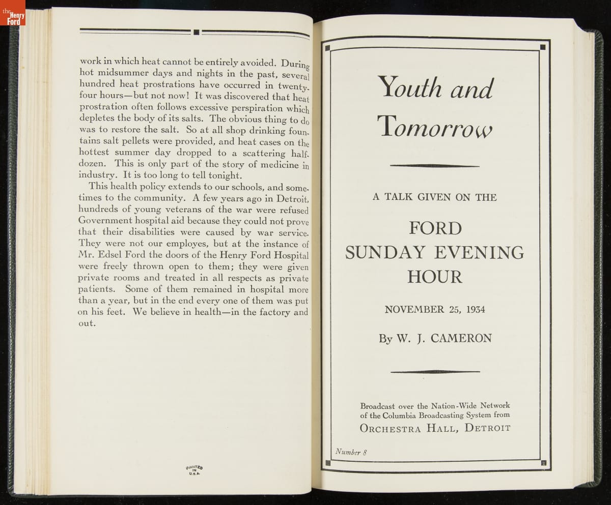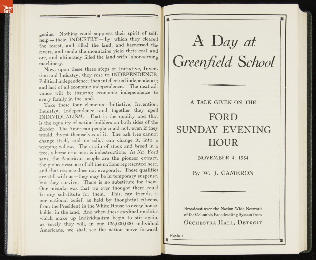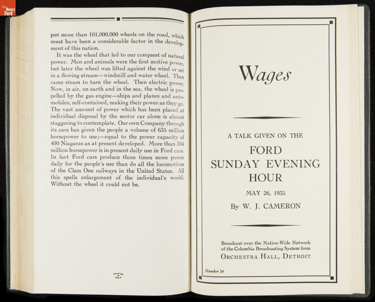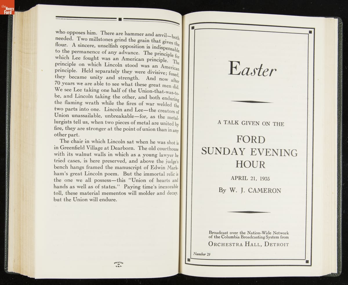 Launched in 1934, the Ford Sunday Evening Hour radio program featured classical music, guest soloists and conductors, and a weekly talk during intermission. Henry Ford asked his friend and advisor William J. Cameron to write and deliver these messages. Cameron, who composed the anti-Semitic articles for The Dearborn Independent, now peddled softer populist views--avoiding extremes and any direct attacks on politicians, ethnic groups, or Wall Street financiers.