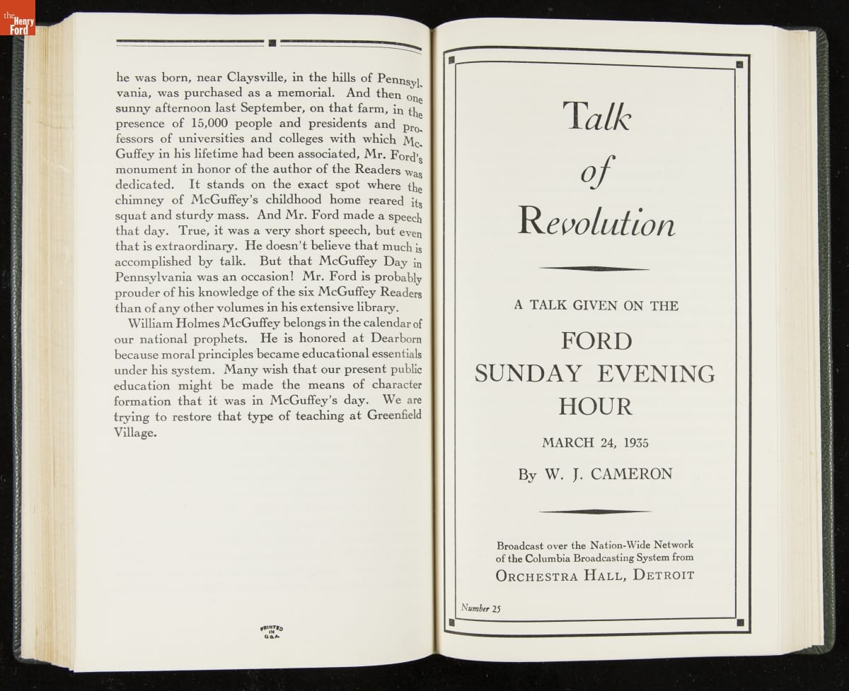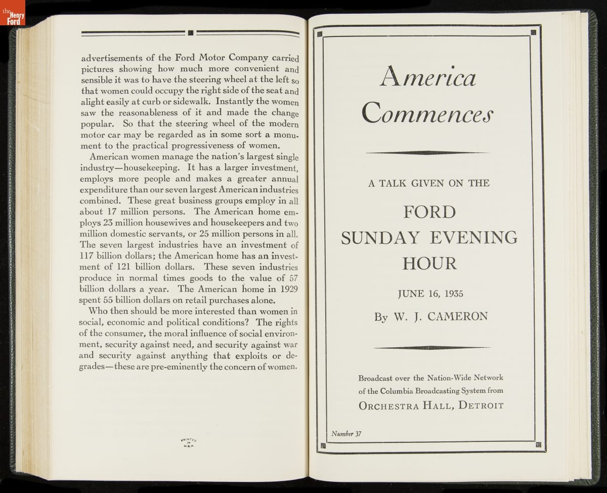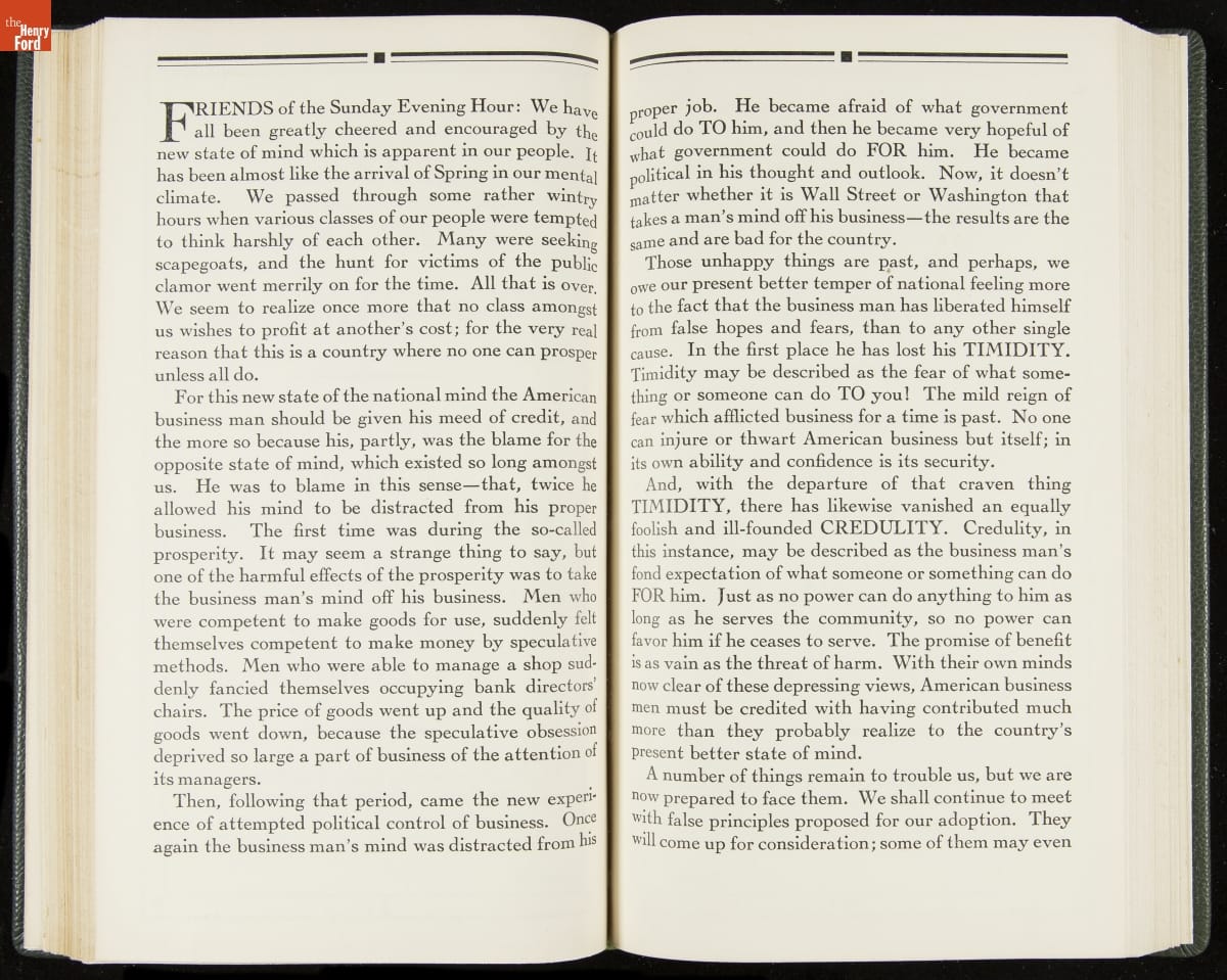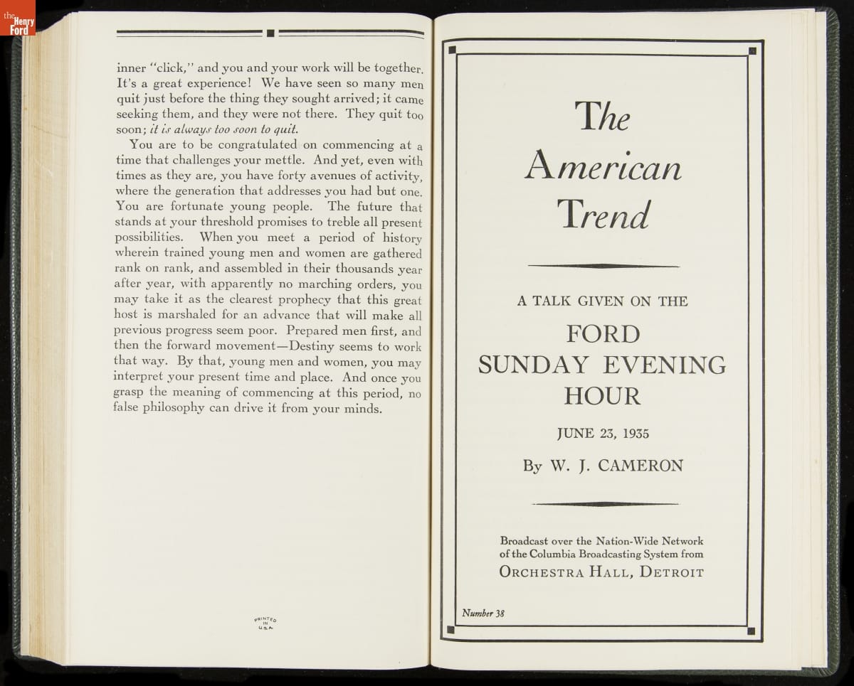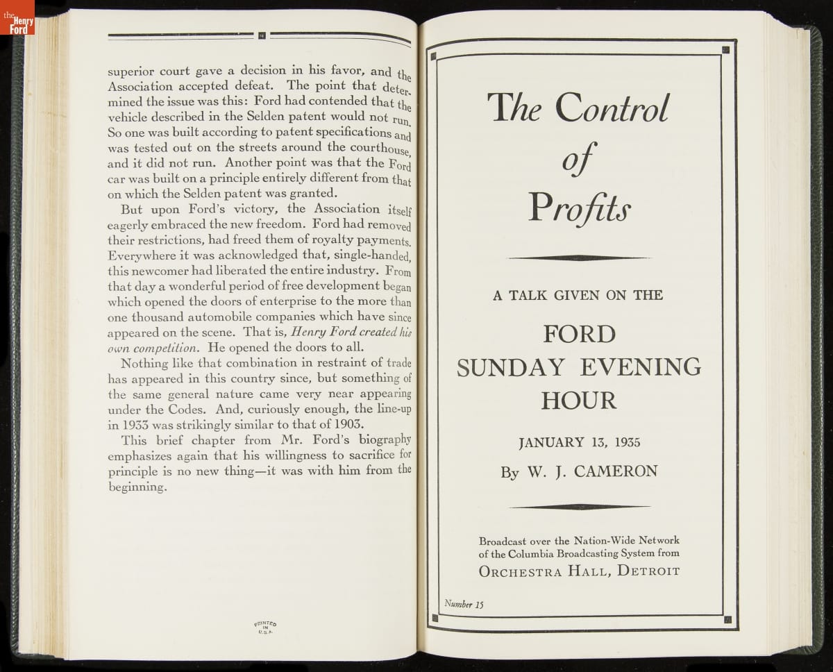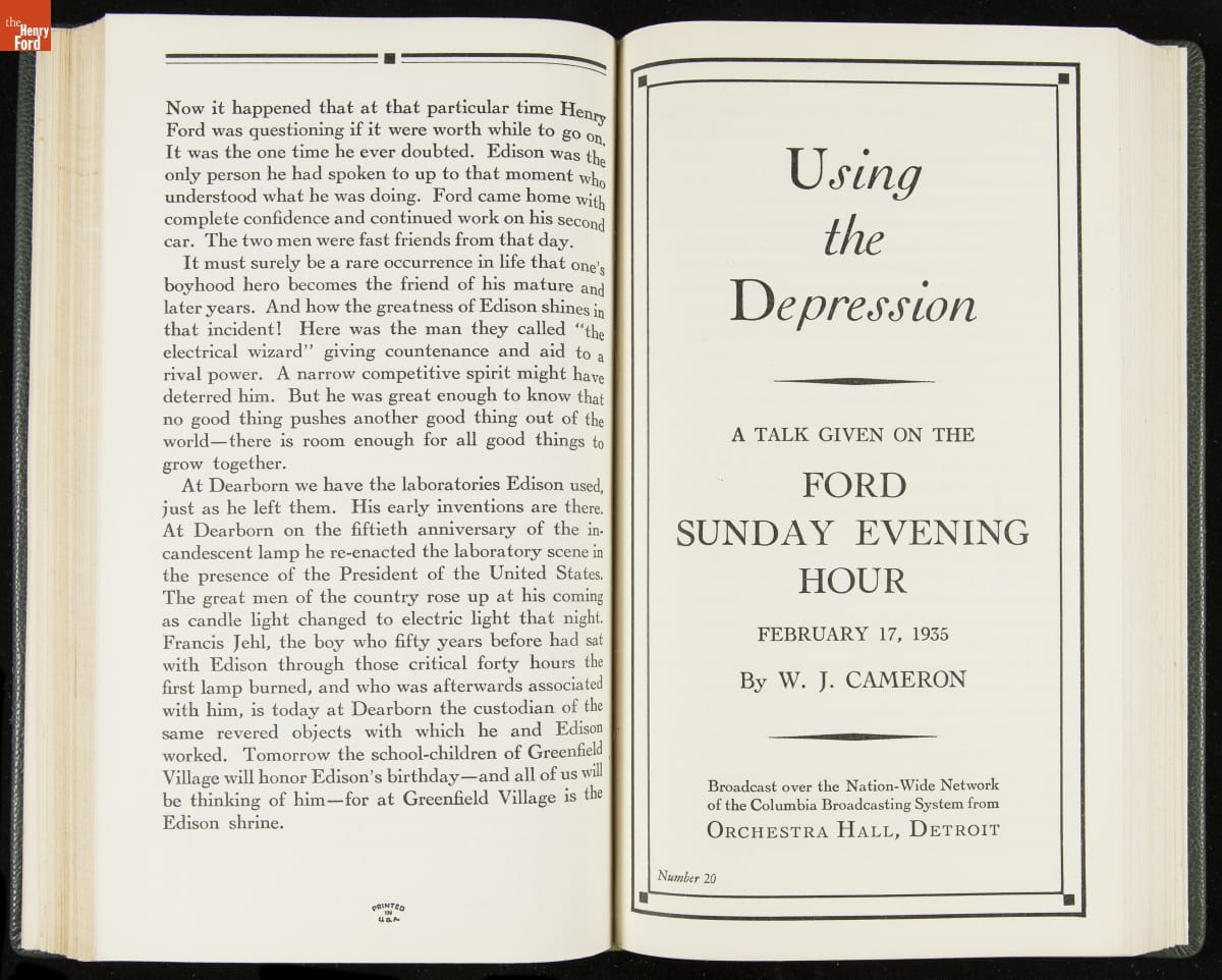 Launched in 1934, the Ford Sunday Evening Hour radio program featured classical music, guest soloists and conductors, and a weekly talk during intermission. Henry Ford asked his friend and advisor William J. Cameron to write and deliver these messages. Cameron, who composed the anti-Semitic articles for The Dearborn Independent, now peddled softer populist views--avoiding extremes and any direct attacks on politicians, ethnic groups, or Wall Street financiers.
