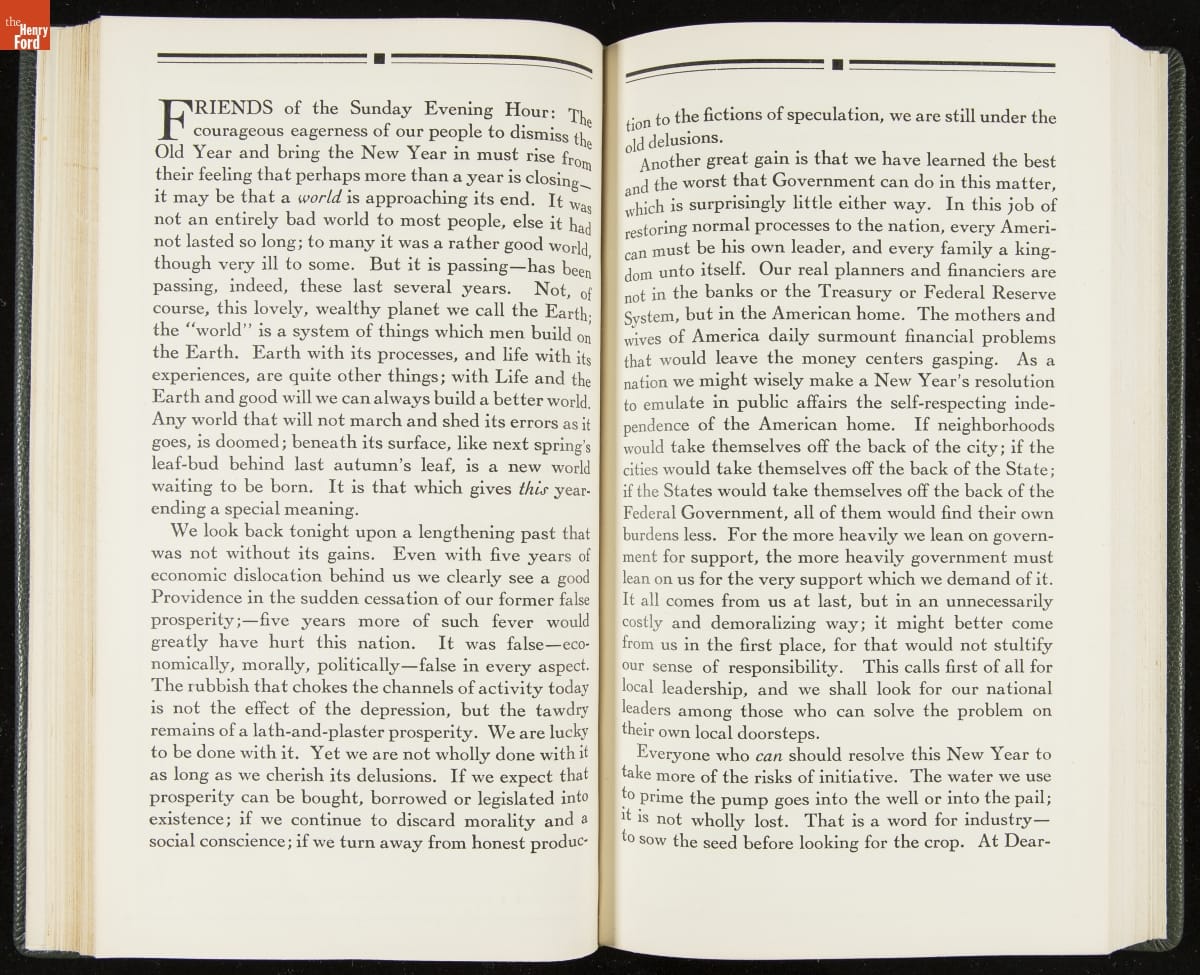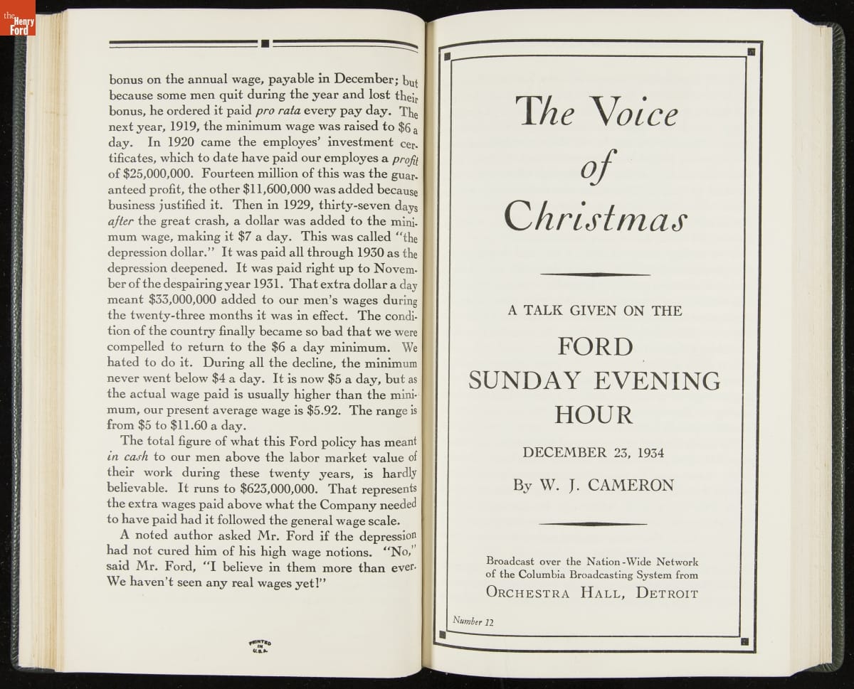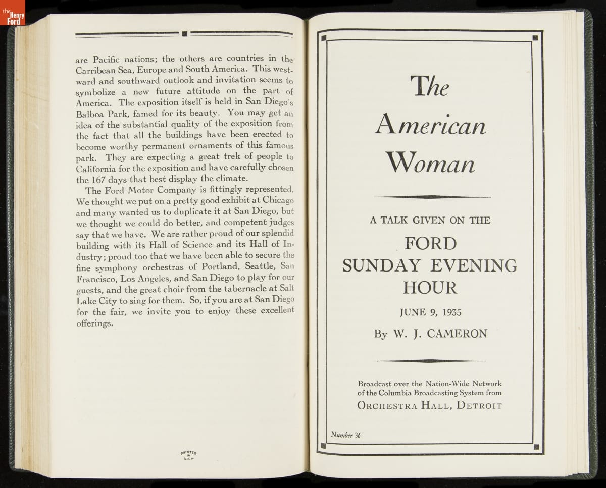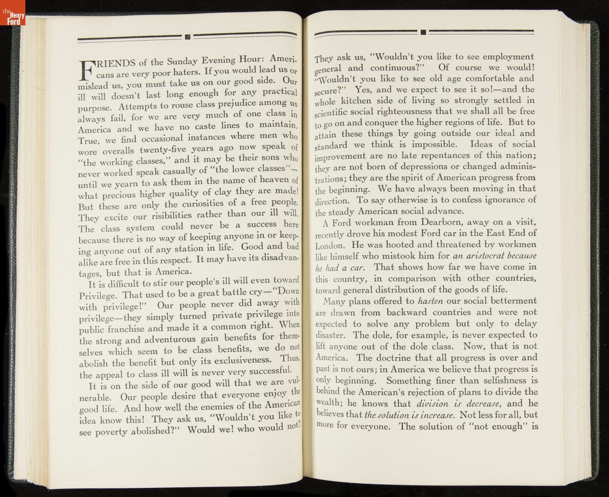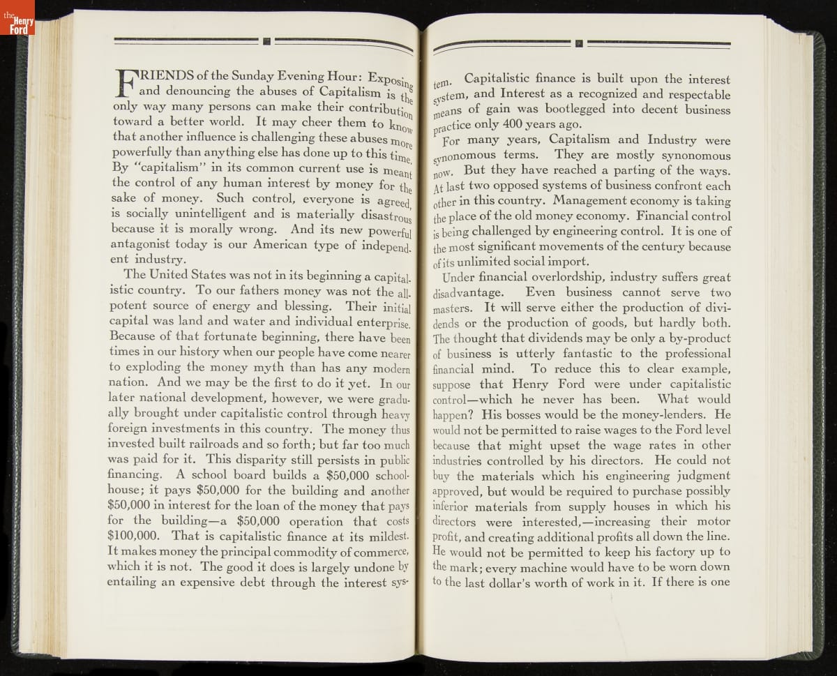 Launched in 1934, the Ford Sunday Evening Hour radio program featured classical music, guest soloists and conductors, and a weekly talk during intermission. Henry Ford asked his friend and advisor William J. Cameron to write and deliver these messages. Cameron, who composed the anti-Semitic articles for The Dearborn Independent, now peddled softer populist views--avoiding extremes and any direct attacks on politicians, ethnic groups, or Wall Street financiers.