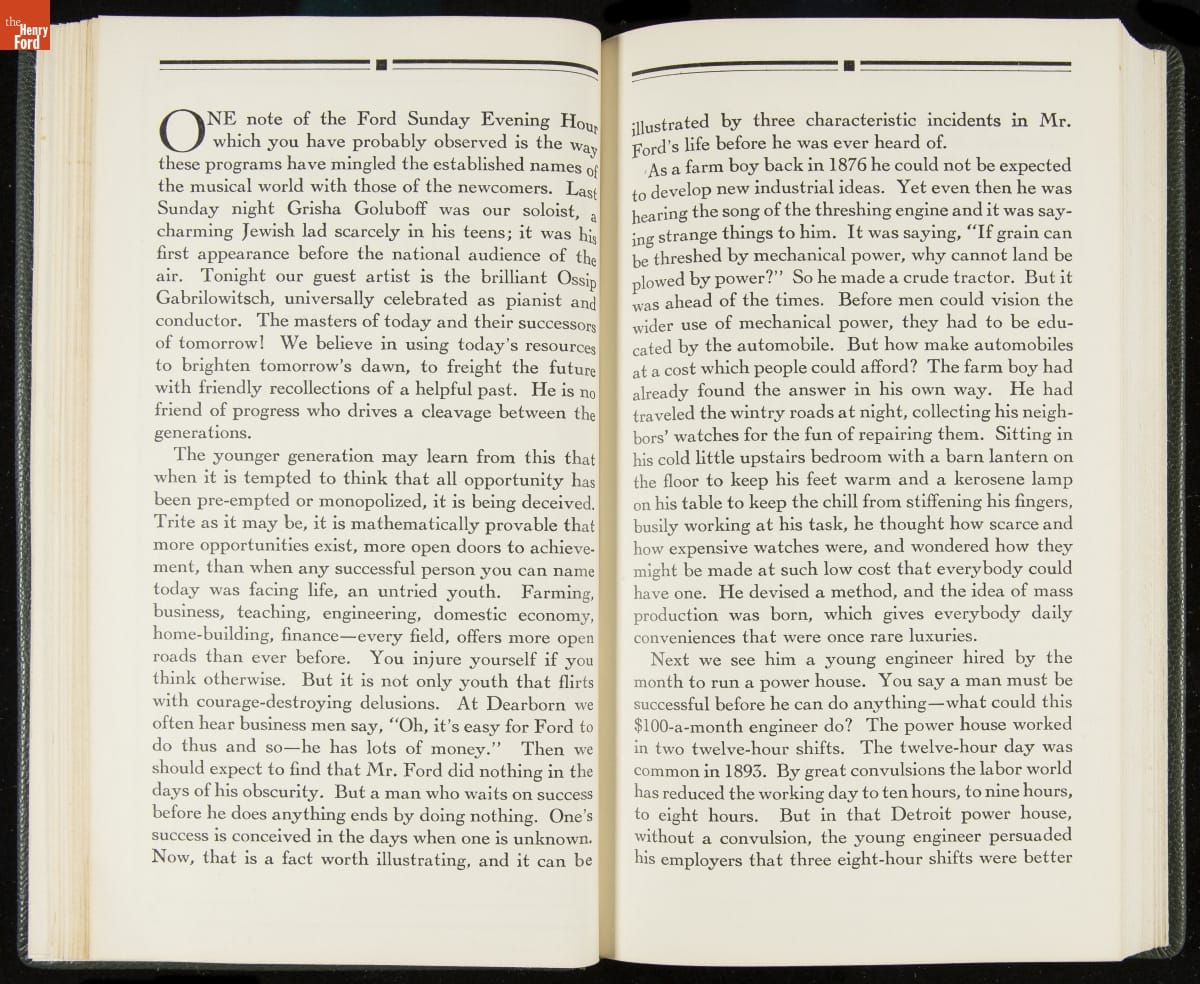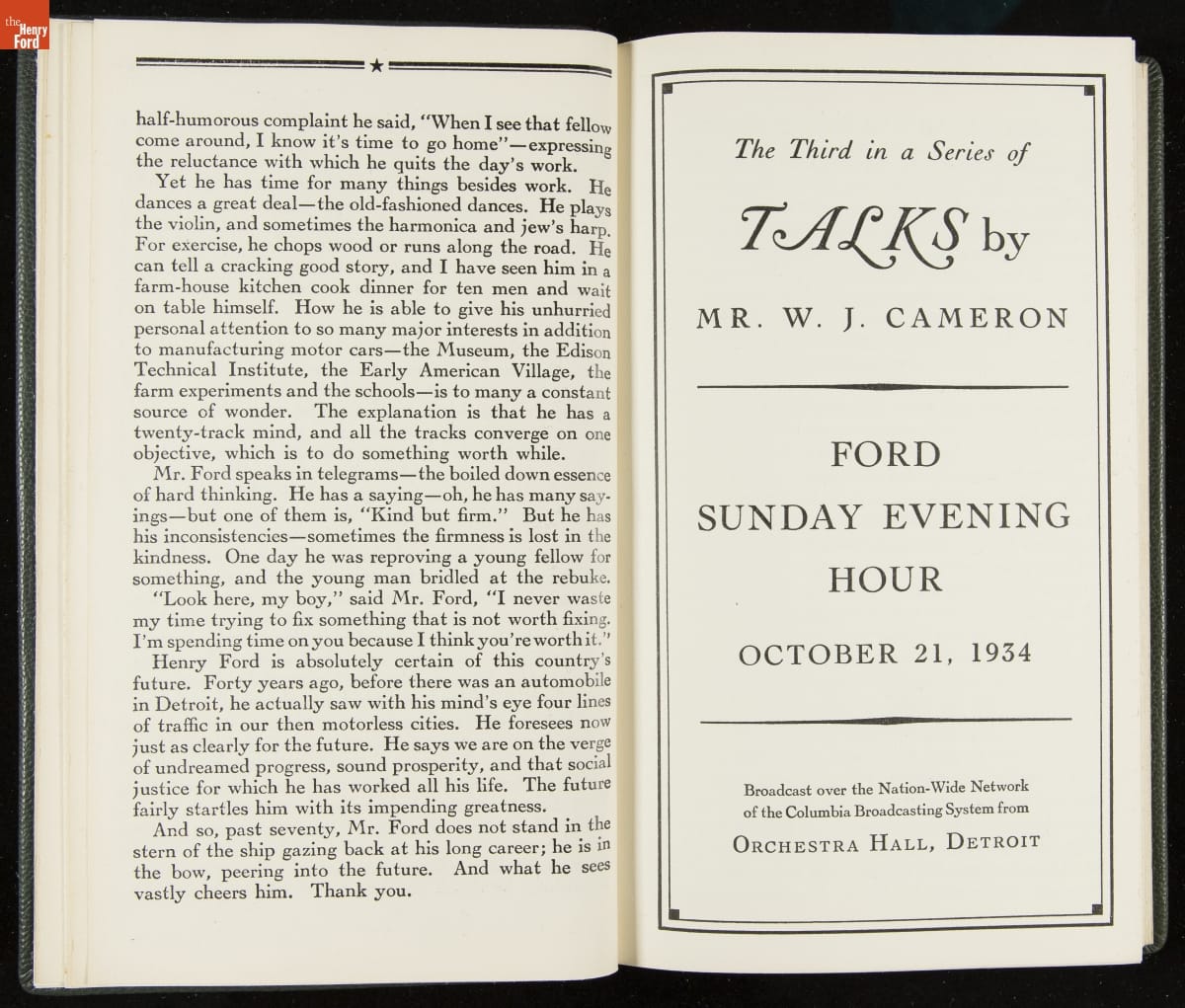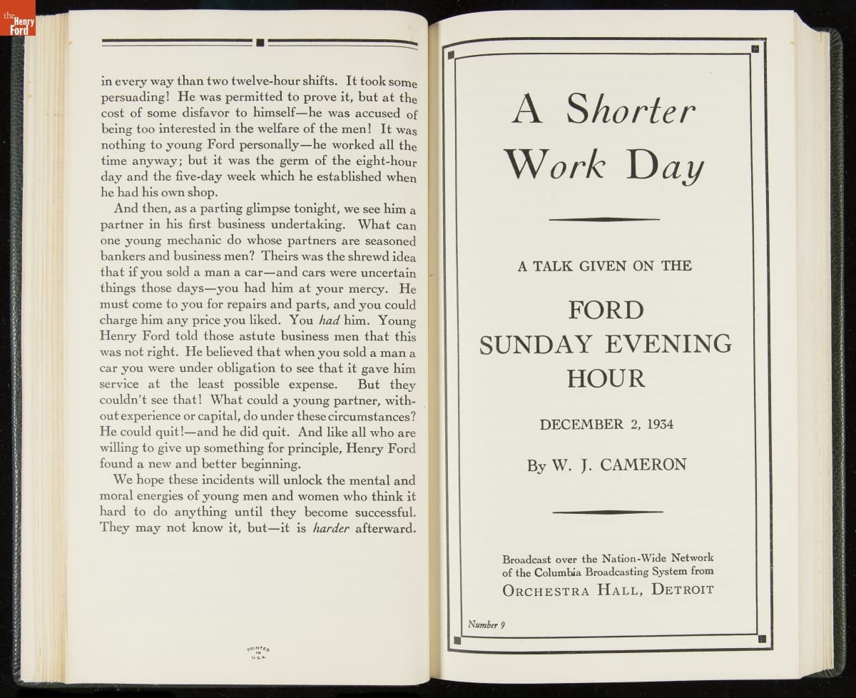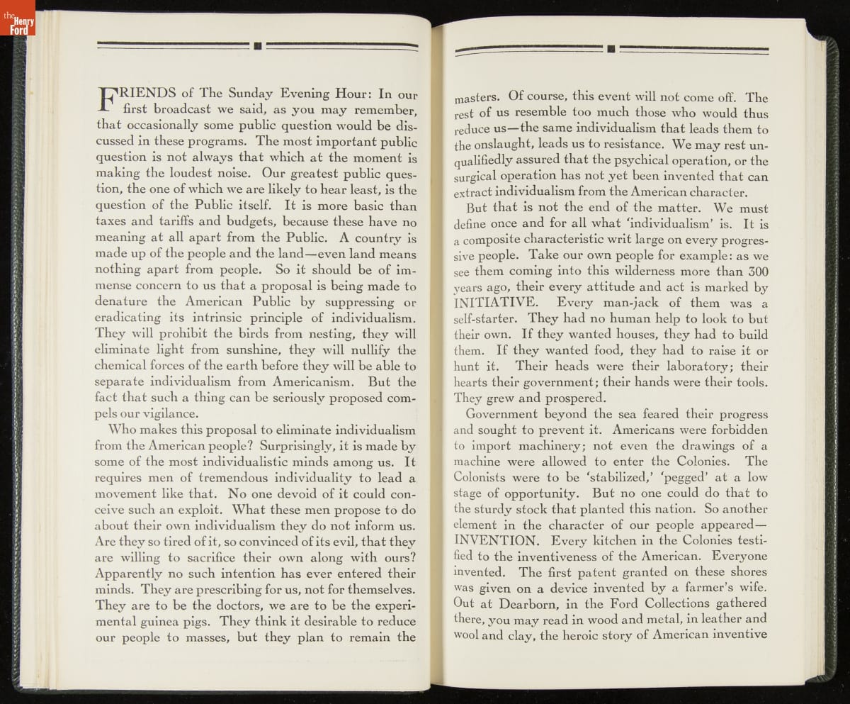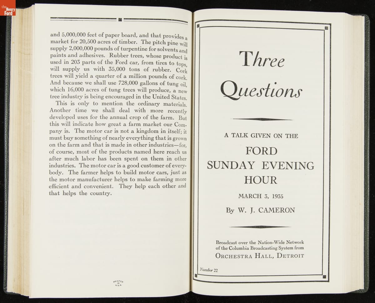 Launched in 1934, the Ford Sunday Evening Hour radio program featured classical music, guest soloists and conductors, and a weekly talk during intermission. Henry Ford asked his friend and advisor William J. Cameron to write and deliver these messages. Cameron, who composed the anti-Semitic articles for The Dearborn Independent, now peddled softer populist views--avoiding extremes and any direct attacks on politicians, ethnic groups, or Wall Street financiers.