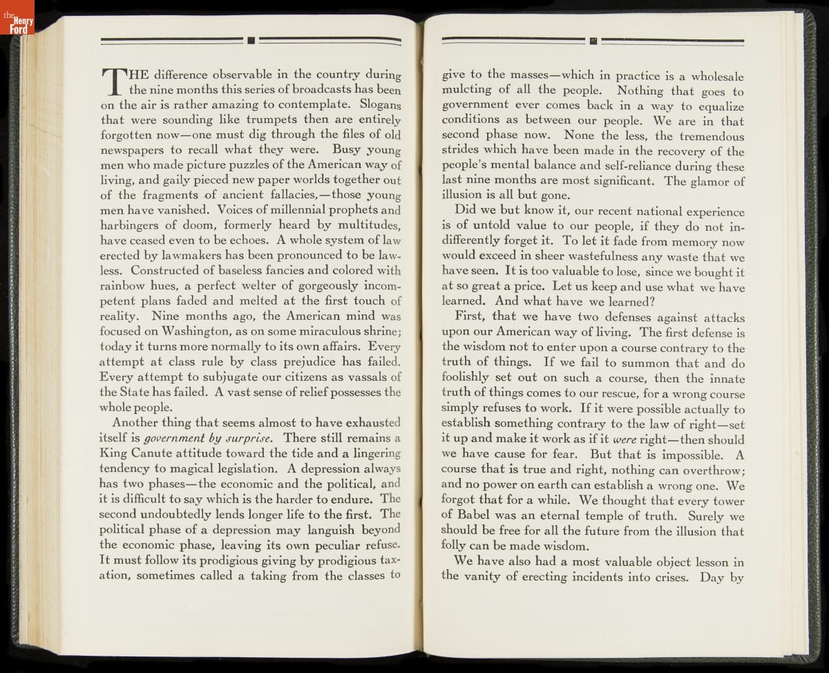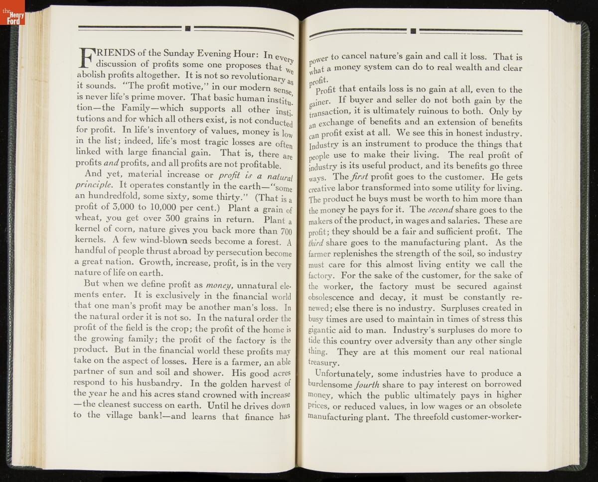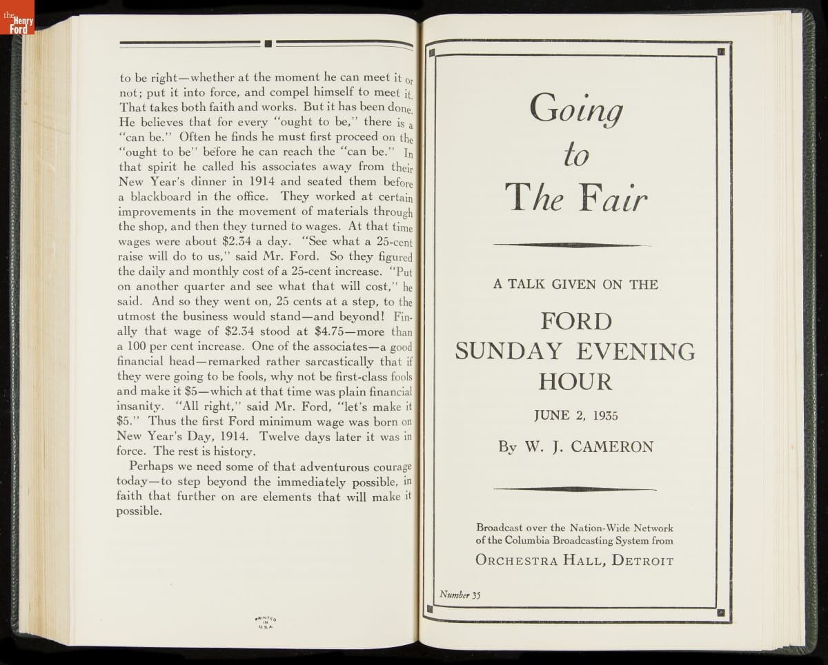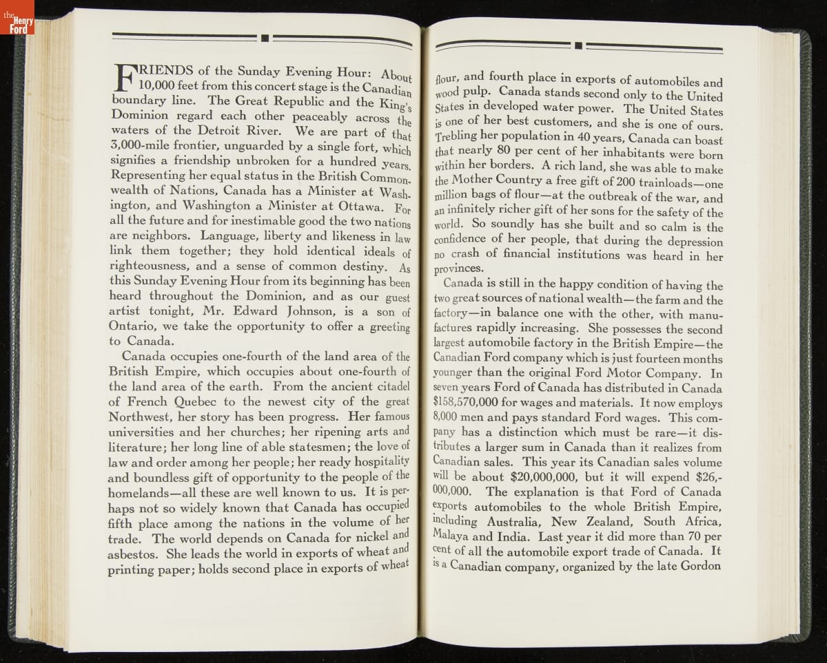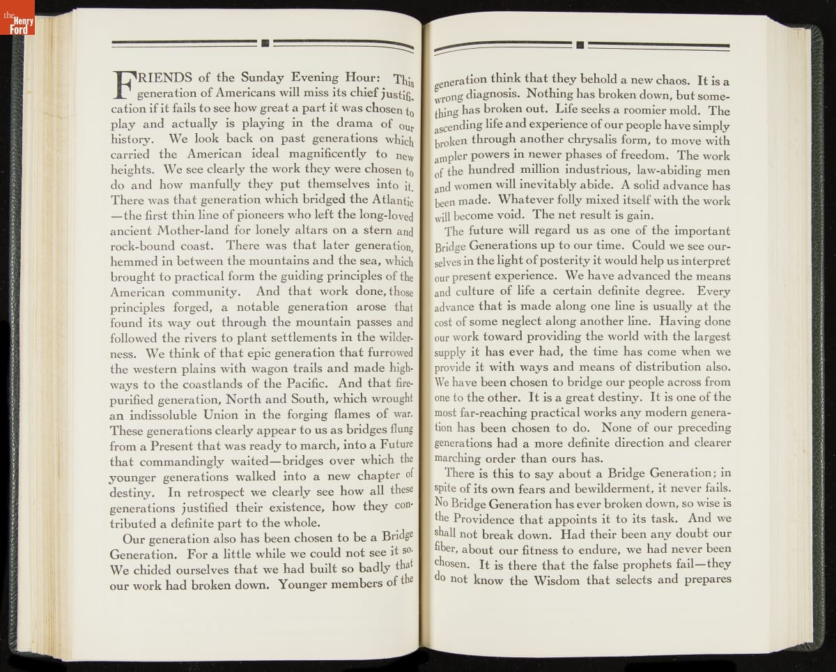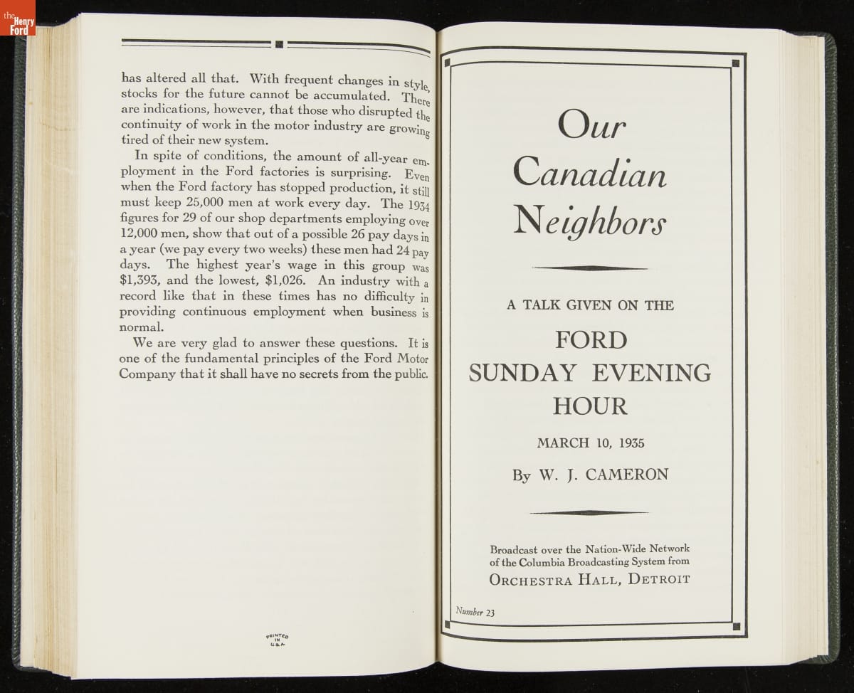 Launched in 1934, the Ford Sunday Evening Hour radio program featured classical music, guest soloists and conductors, and a weekly talk during intermission. Henry Ford asked his friend and advisor William J. Cameron to write and deliver these messages. Cameron, who composed the anti-Semitic articles for The Dearborn Independent, now peddled softer populist views--avoiding extremes and any direct attacks on politicians, ethnic groups, or Wall Street financiers.