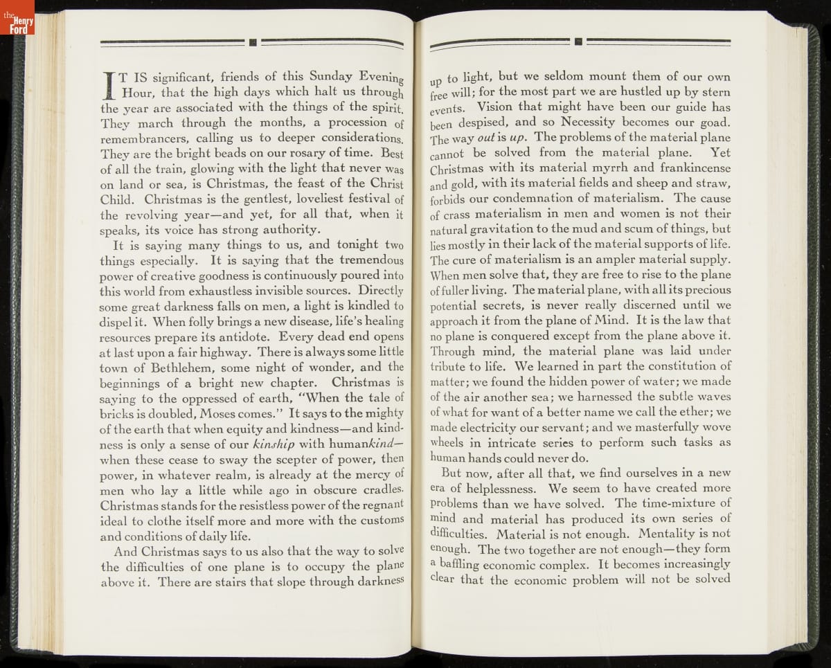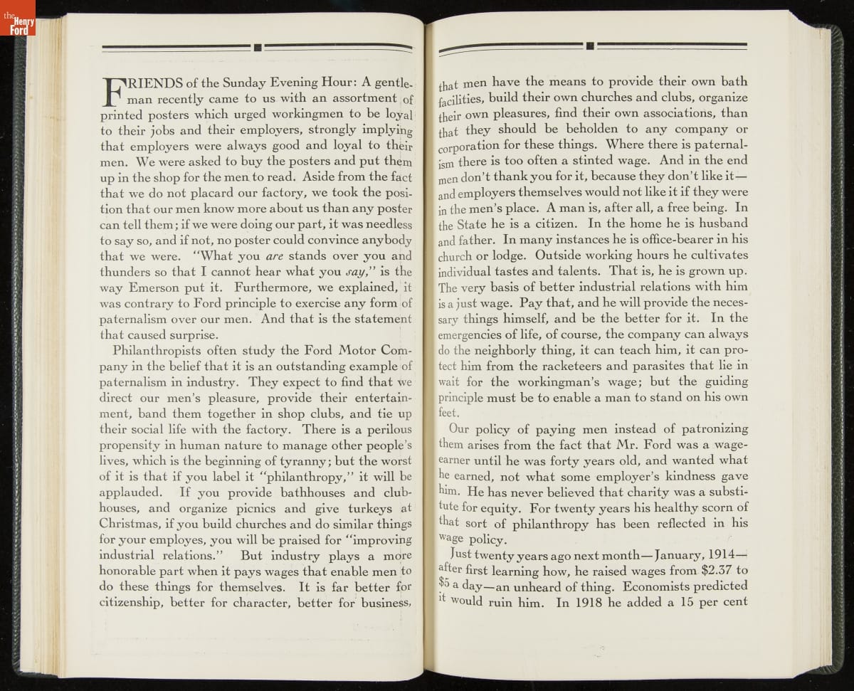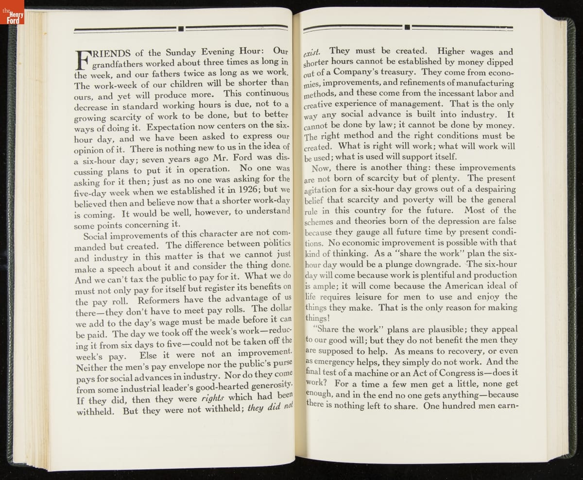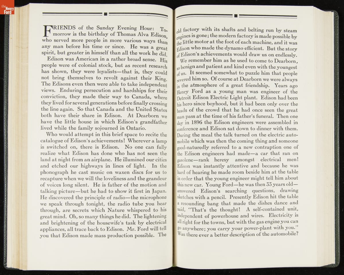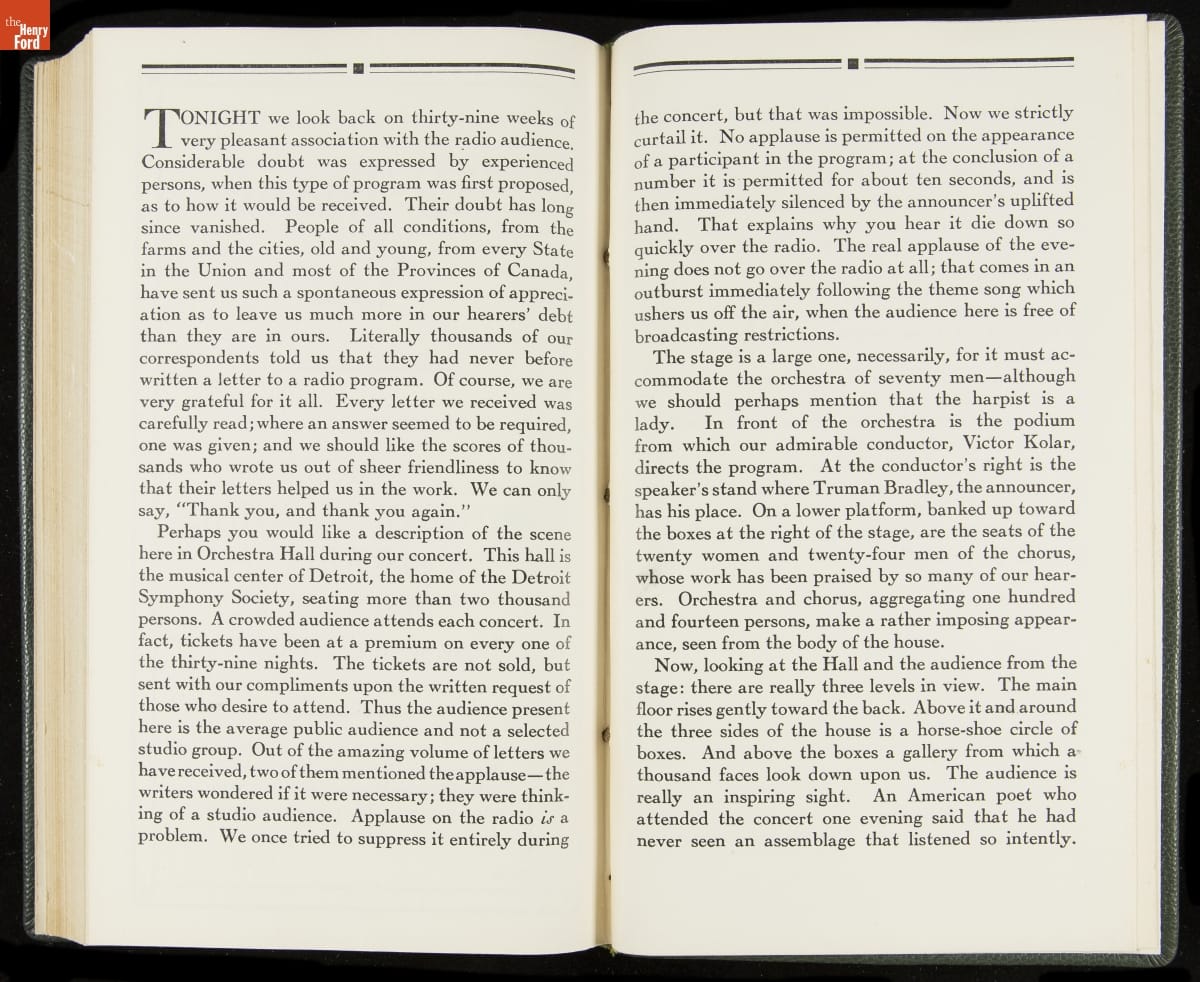 Launched in 1934, the Ford Sunday Evening Hour radio program featured classical music, guest soloists and conductors, and a weekly talk during intermission. Henry Ford asked his friend and advisor William J. Cameron to write and deliver these messages. Cameron, who composed the anti-Semitic articles for The Dearborn Independent, now peddled softer populist views--avoiding extremes and any direct attacks on politicians, ethnic groups, or Wall Street financiers.
