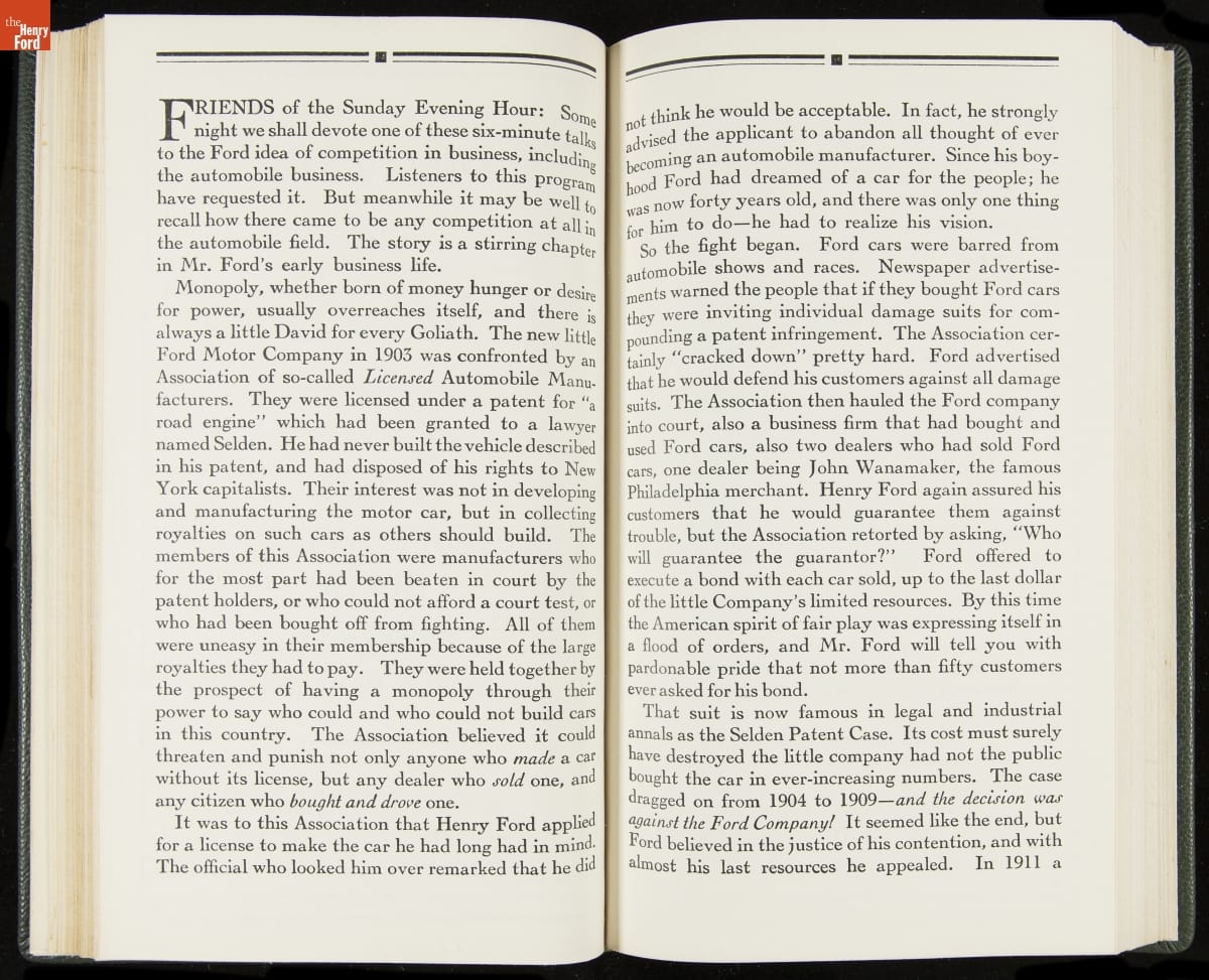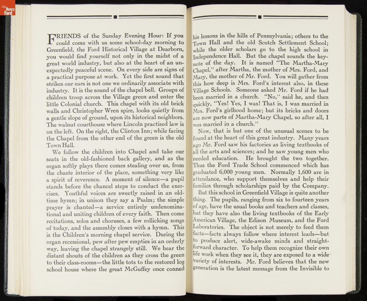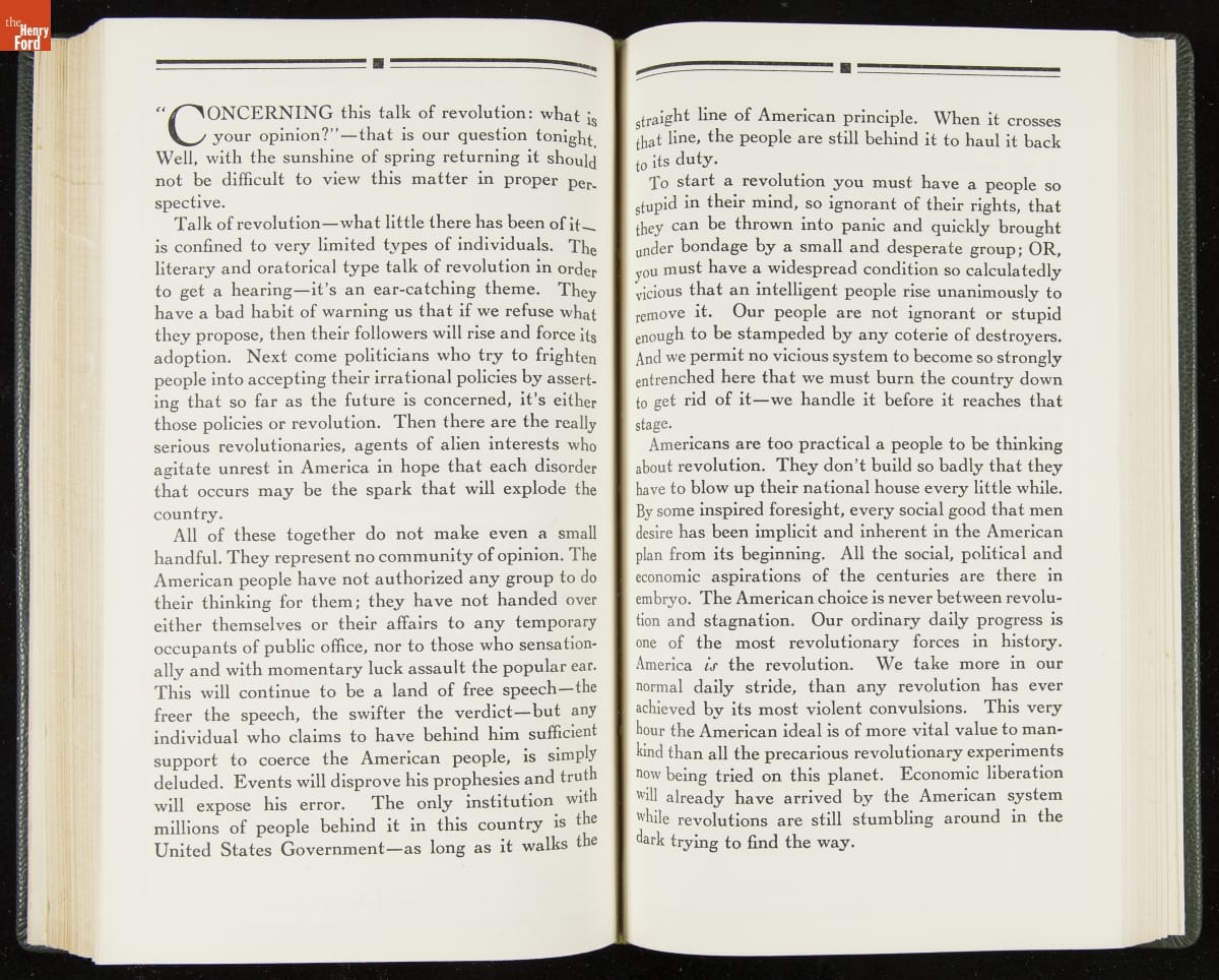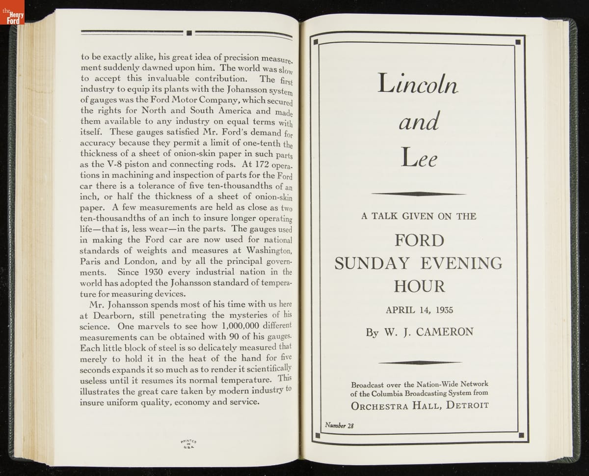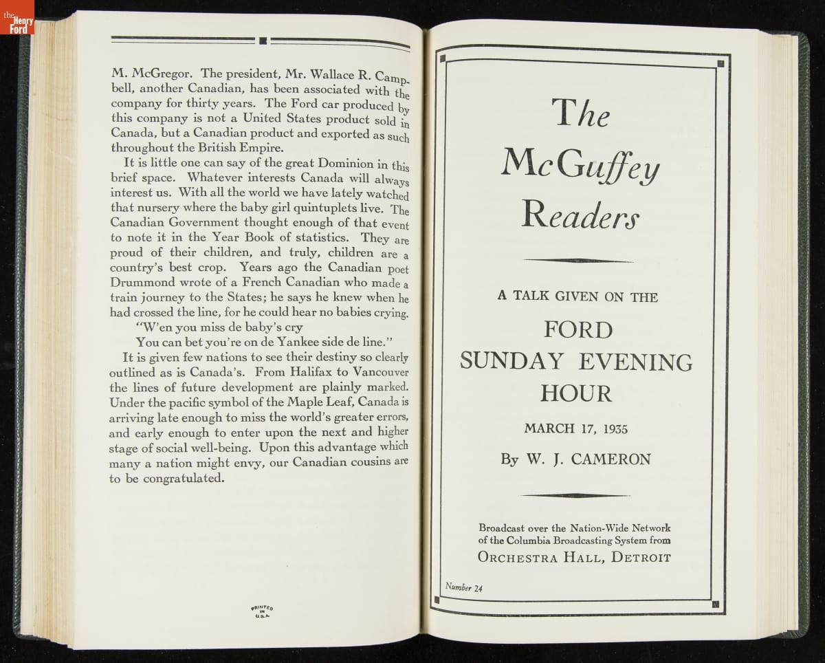 Launched in 1934, the Ford Sunday Evening Hour radio program featured classical music, guest soloists and conductors, and a weekly talk during intermission. Henry Ford asked his friend and advisor William J. Cameron to write and deliver these messages. Cameron, who composed the anti-Semitic articles for The Dearborn Independent, now peddled softer populist views--avoiding extremes and any direct attacks on politicians, ethnic groups, or Wall Street financiers.