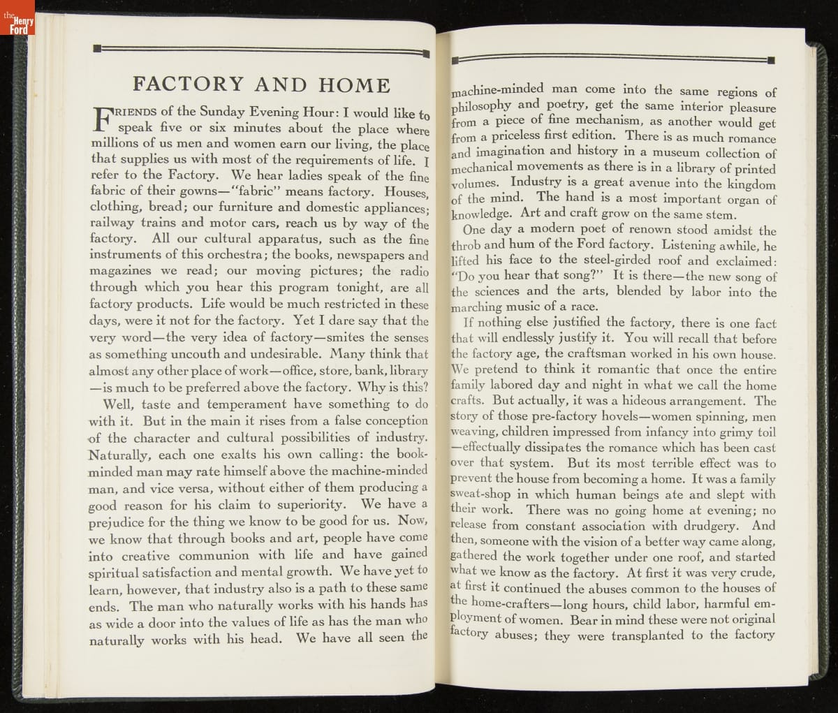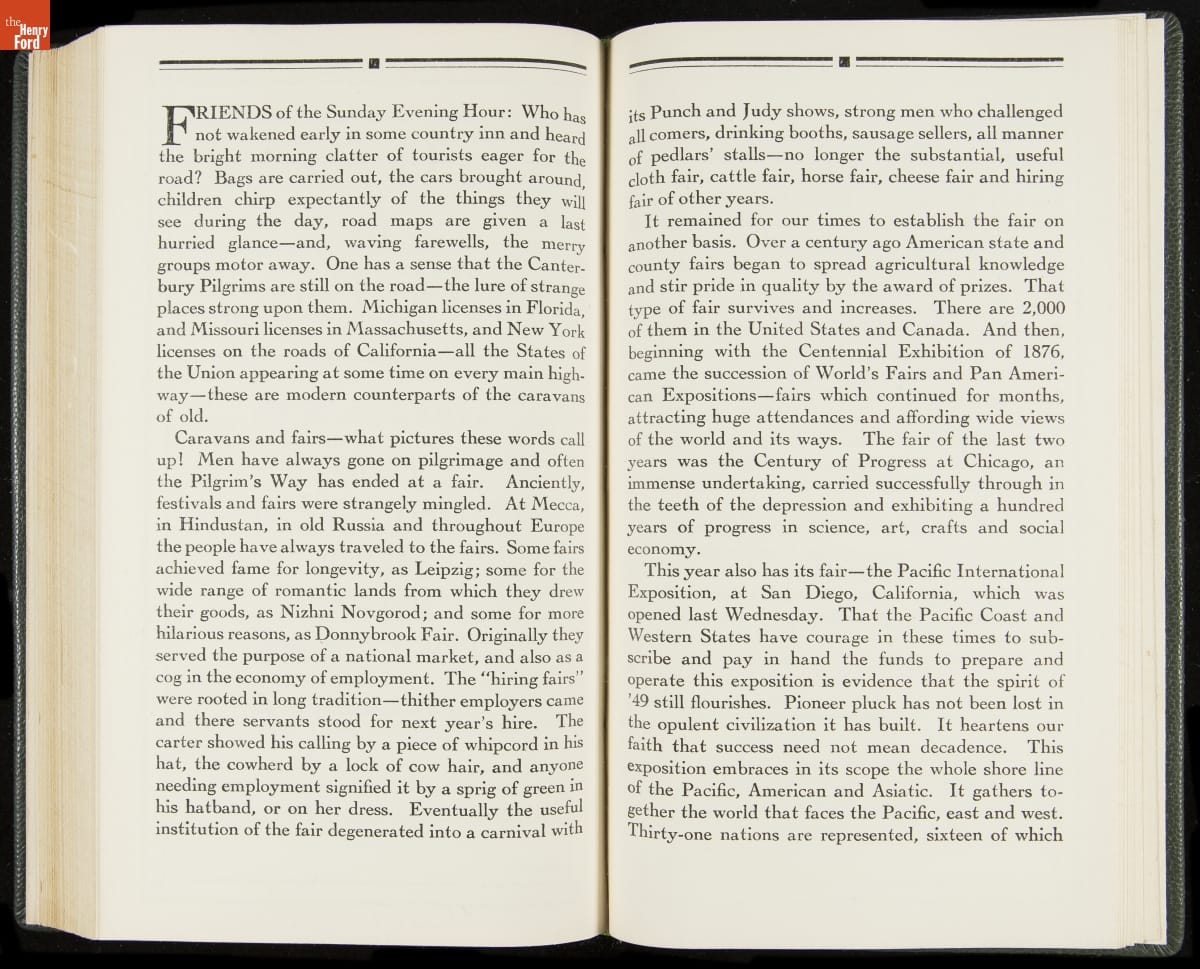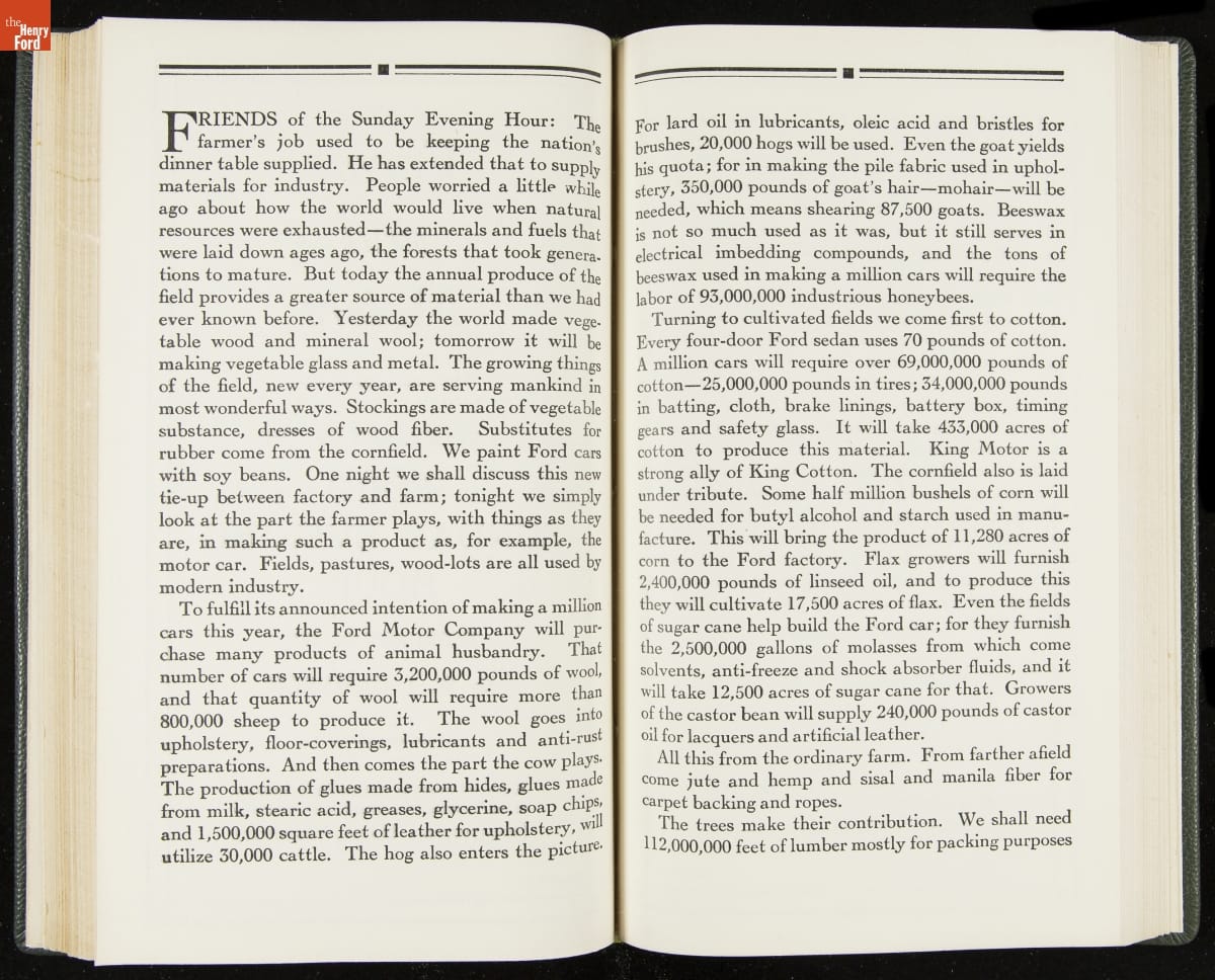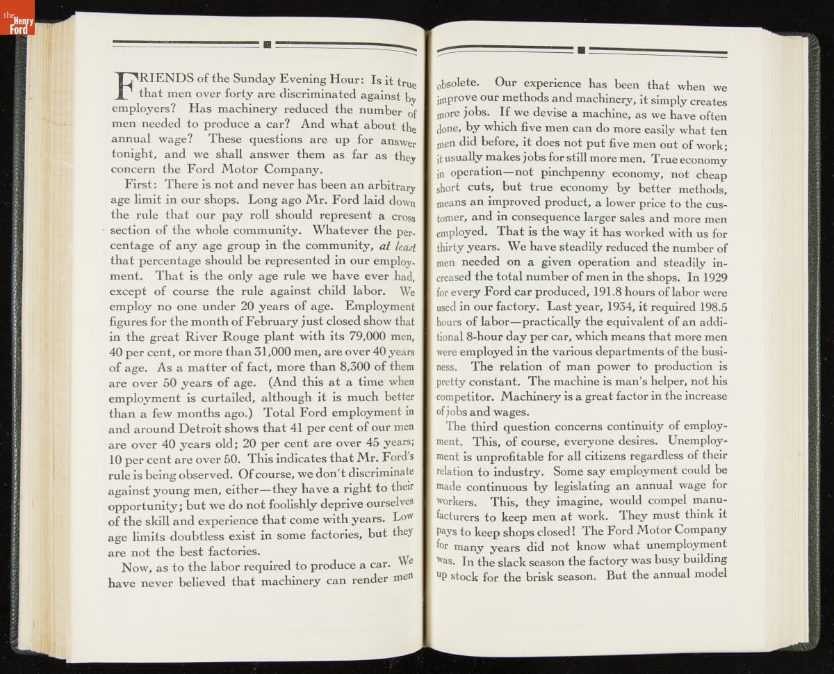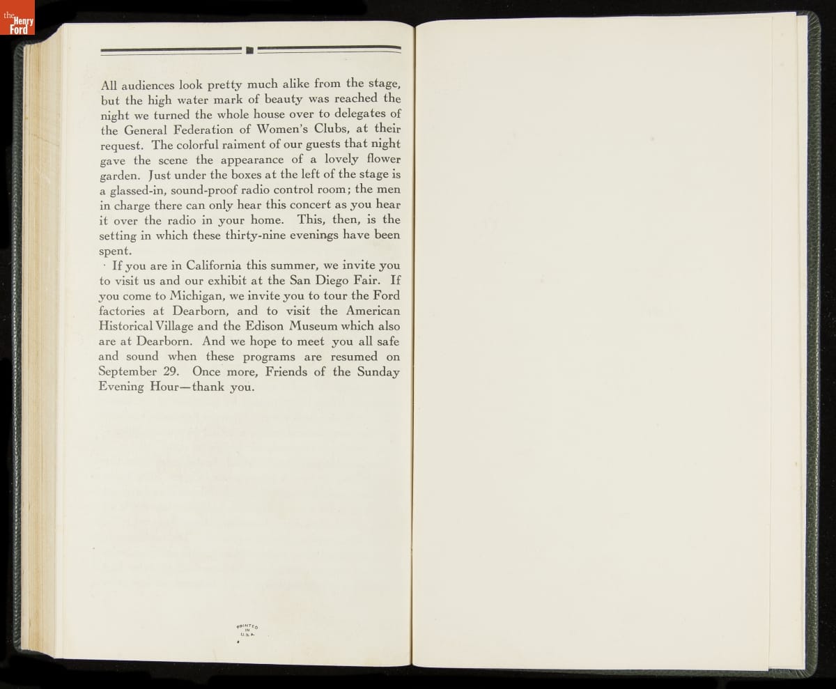 Launched in 1934, the Ford Sunday Evening Hour radio program featured classical music, guest soloists and conductors, and a weekly talk during intermission. Henry Ford asked his friend and advisor William J. Cameron to write and deliver these messages. Cameron, who composed the anti-Semitic articles for The Dearborn Independent, now peddled softer populist views--avoiding extremes and any direct attacks on politicians, ethnic groups, or Wall Street financiers.