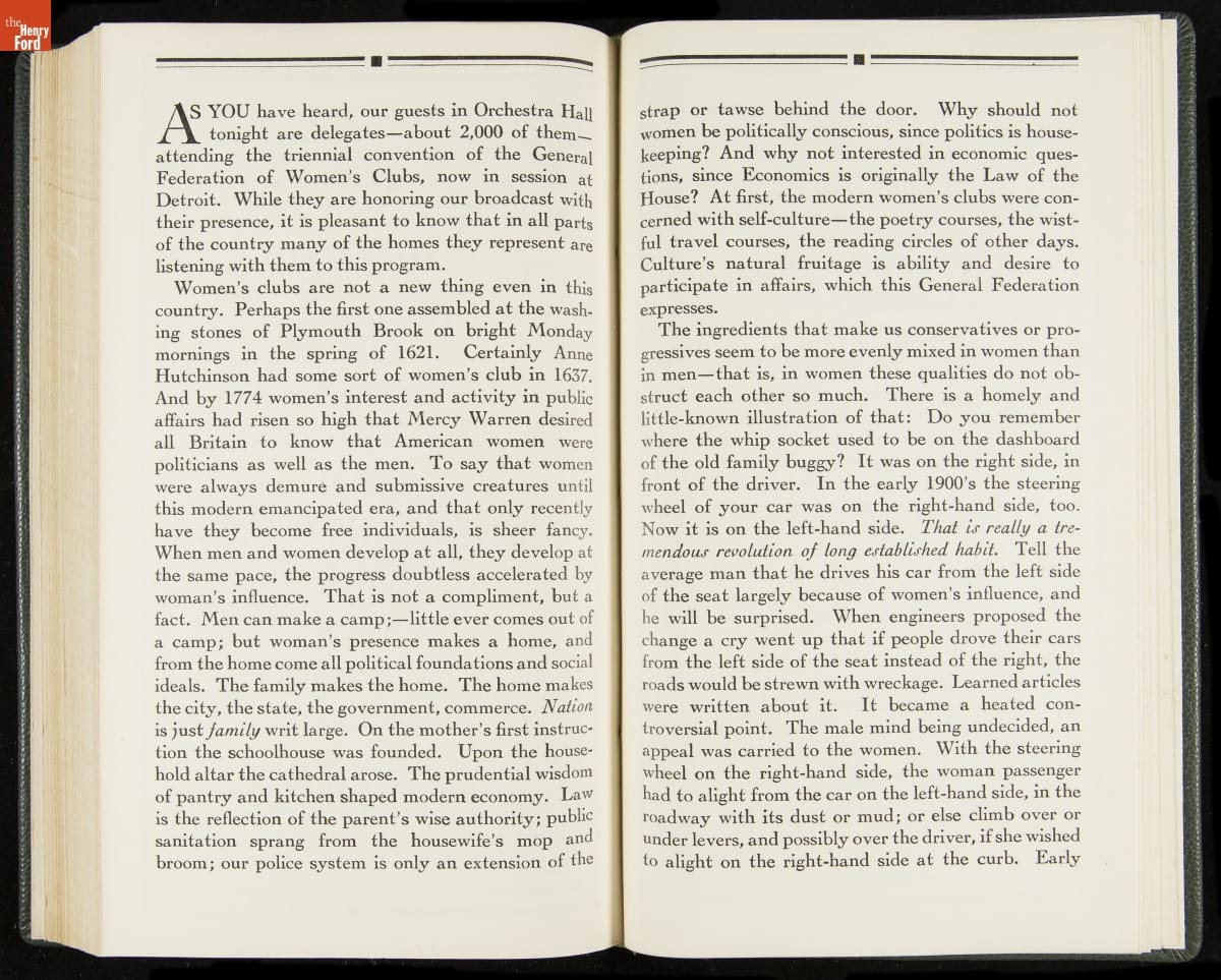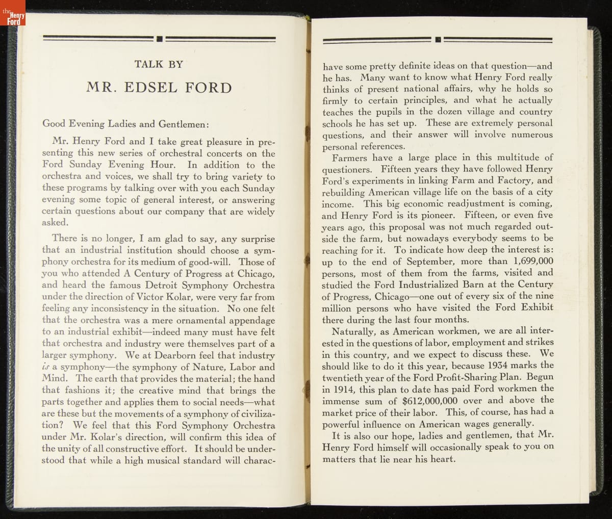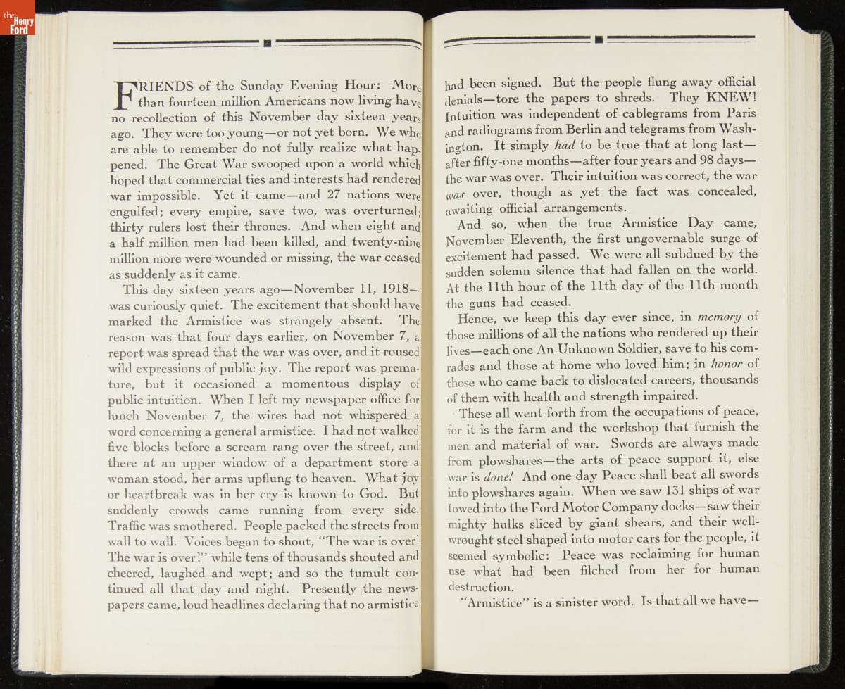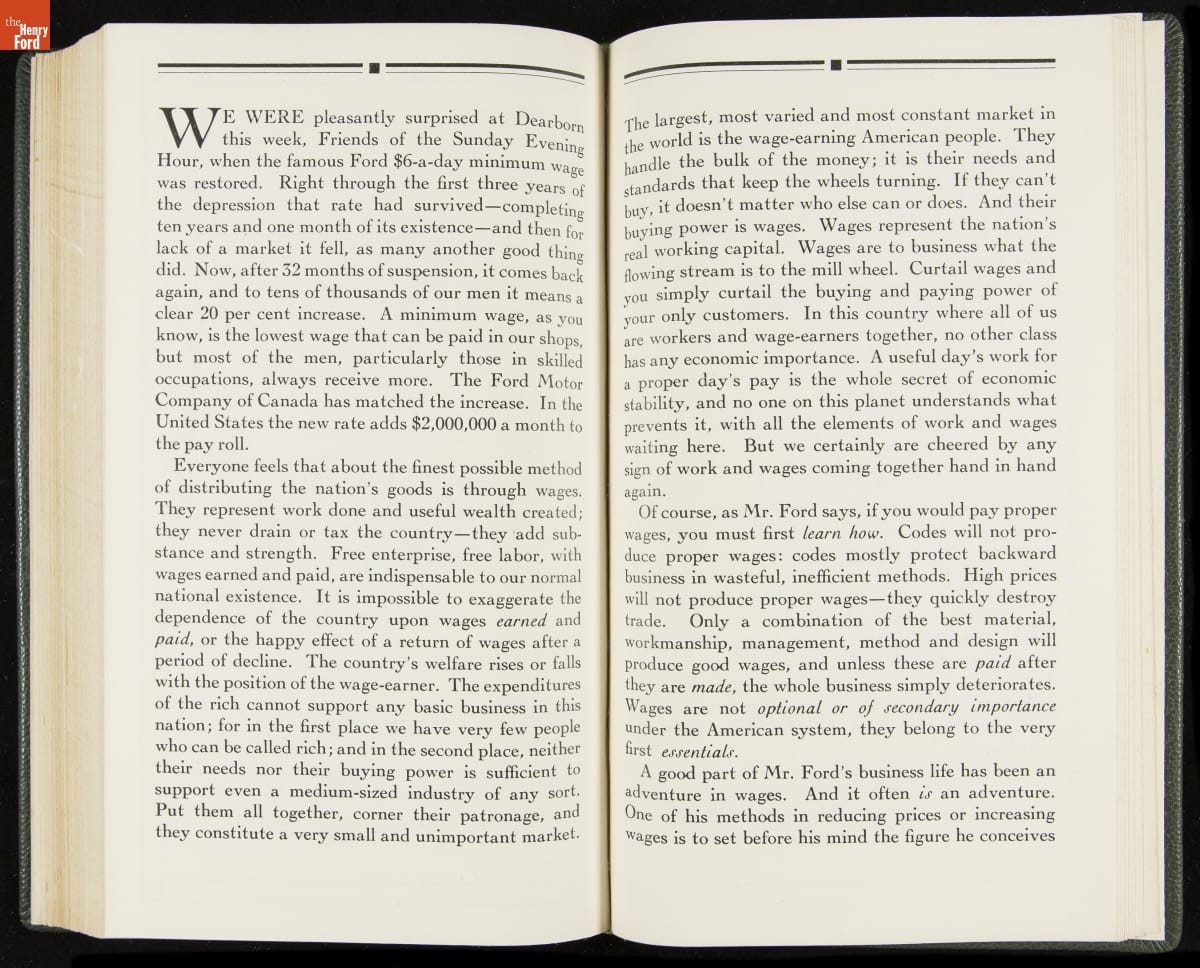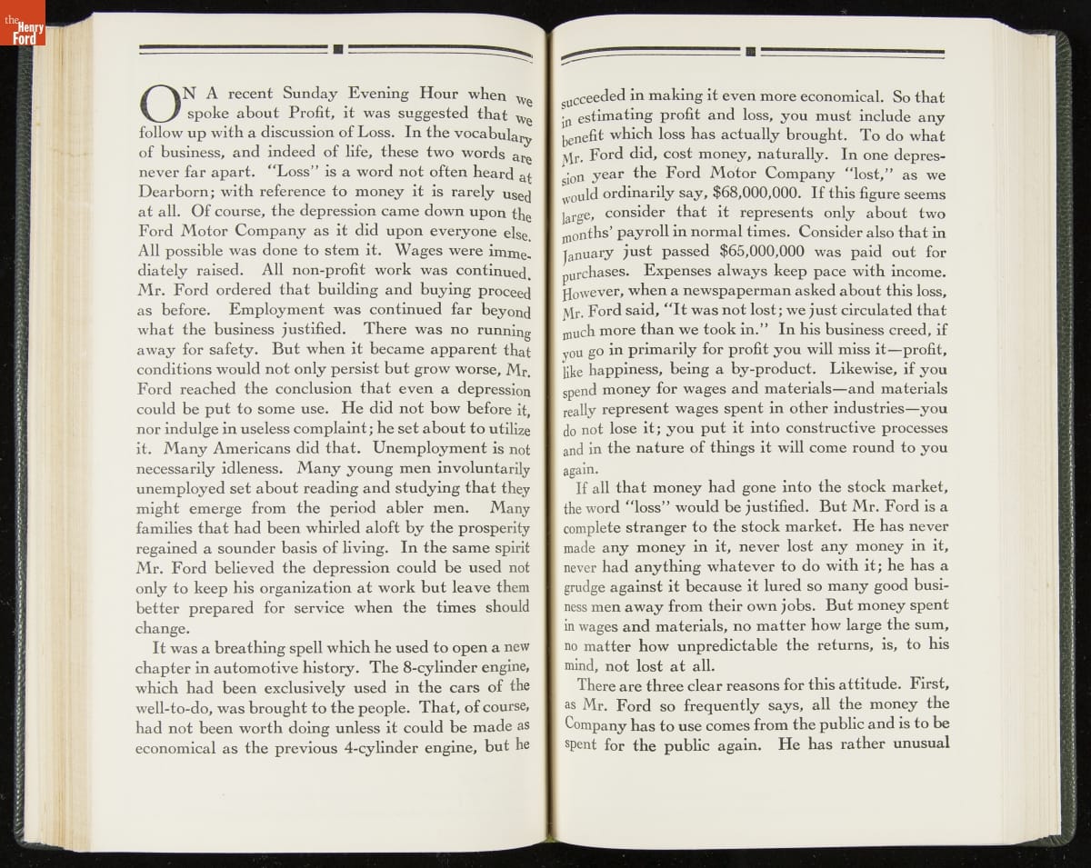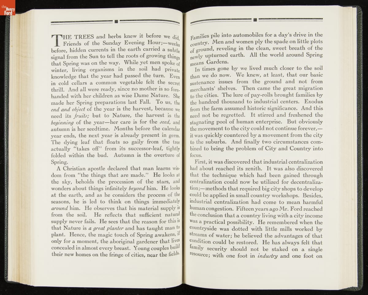 Launched in 1934, the Ford Sunday Evening Hour radio program featured classical music, guest soloists and conductors, and a weekly talk during intermission. Henry Ford asked his friend and advisor William J. Cameron to write and deliver these messages. Cameron, who composed the anti-Semitic articles for The Dearborn Independent, now peddled softer populist views--avoiding extremes and any direct attacks on politicians, ethnic groups, or Wall Street financiers.