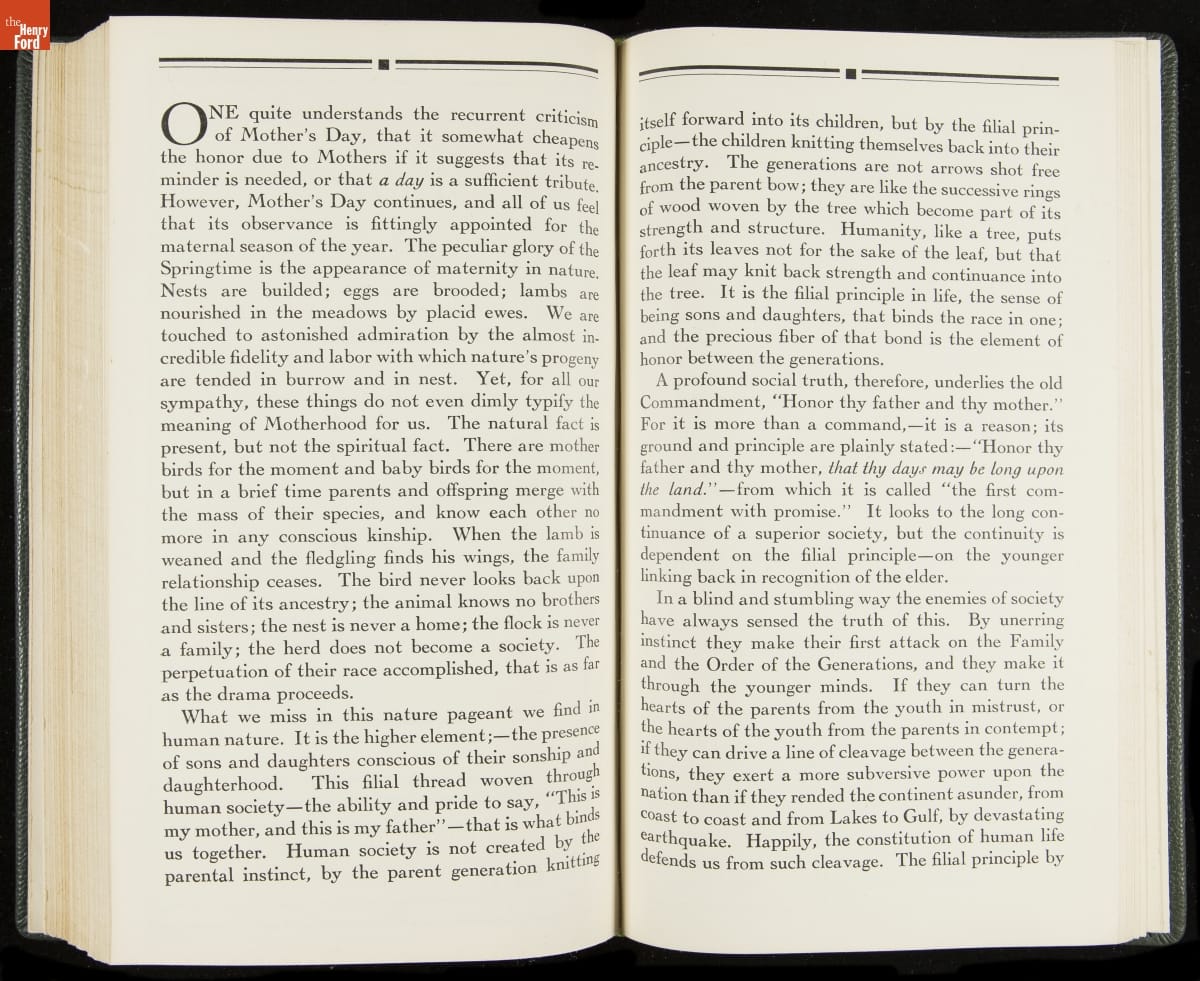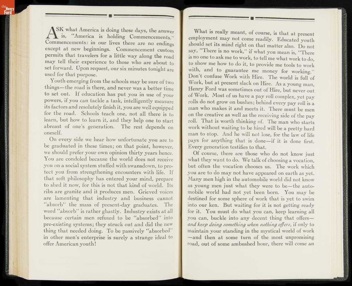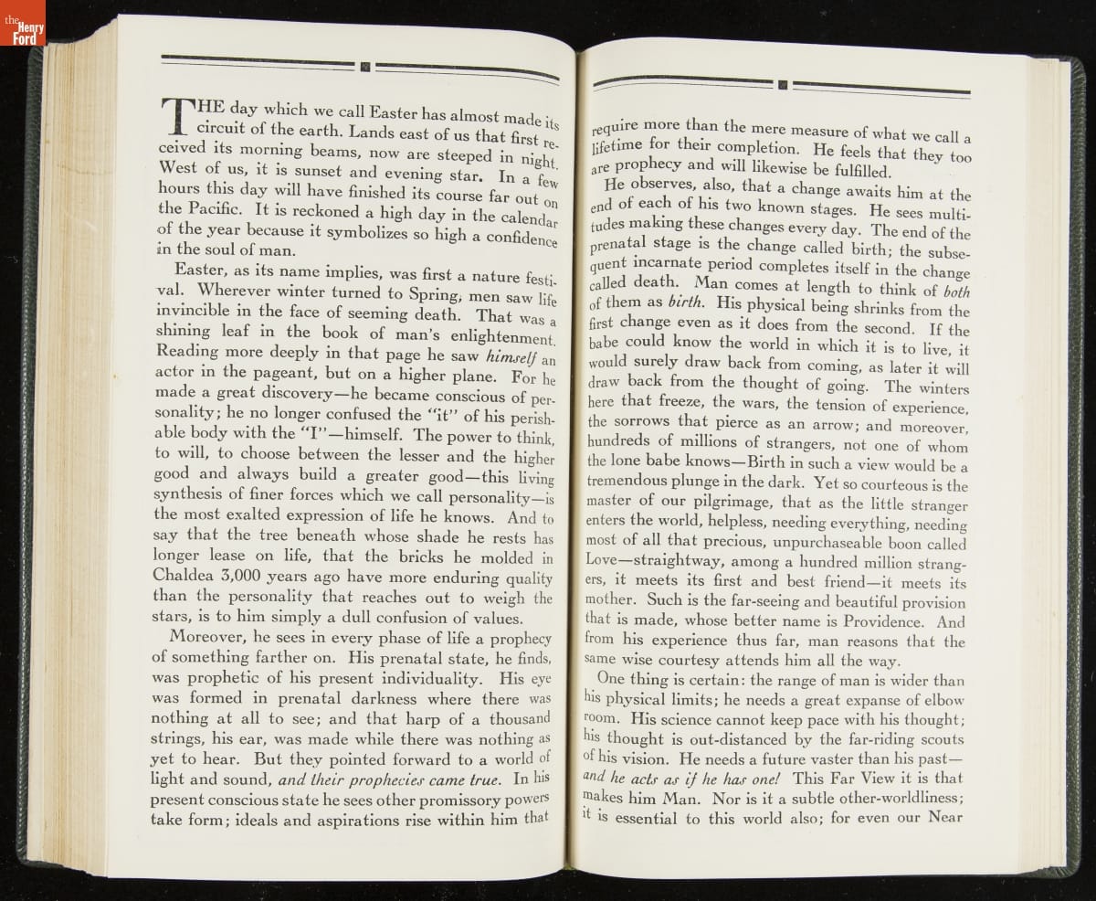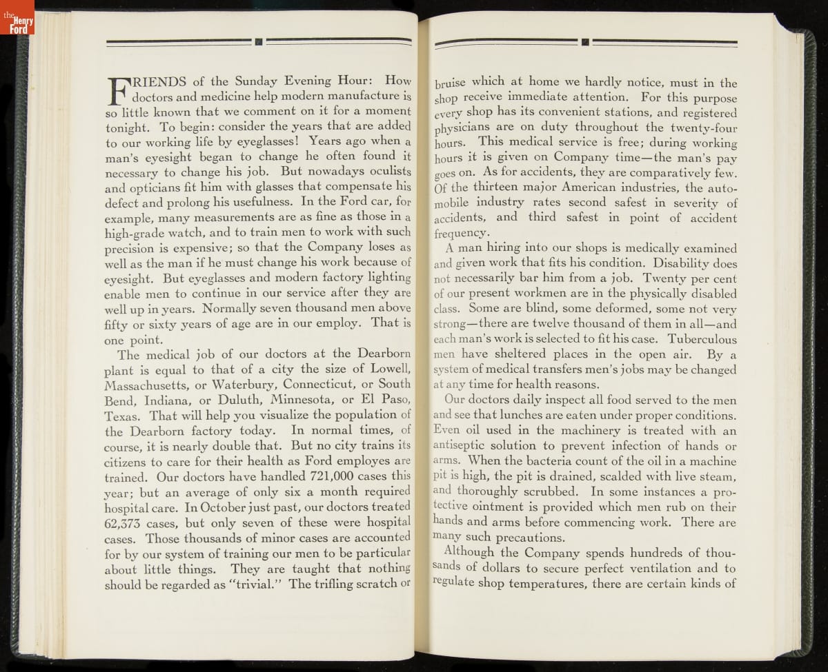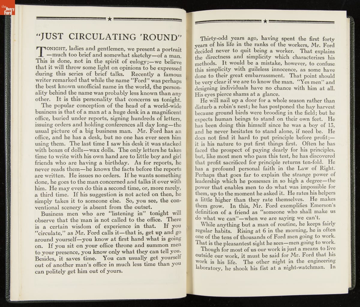 Launched in 1934, the Ford Sunday Evening Hour radio program featured classical music, guest soloists and conductors, and a weekly talk during intermission. Henry Ford asked his friend and advisor William J. Cameron to write and deliver these messages. Cameron, who composed the anti-Semitic articles for The Dearborn Independent, now peddled softer populist views--avoiding extremes and any direct attacks on politicians, ethnic groups, or Wall Street financiers.