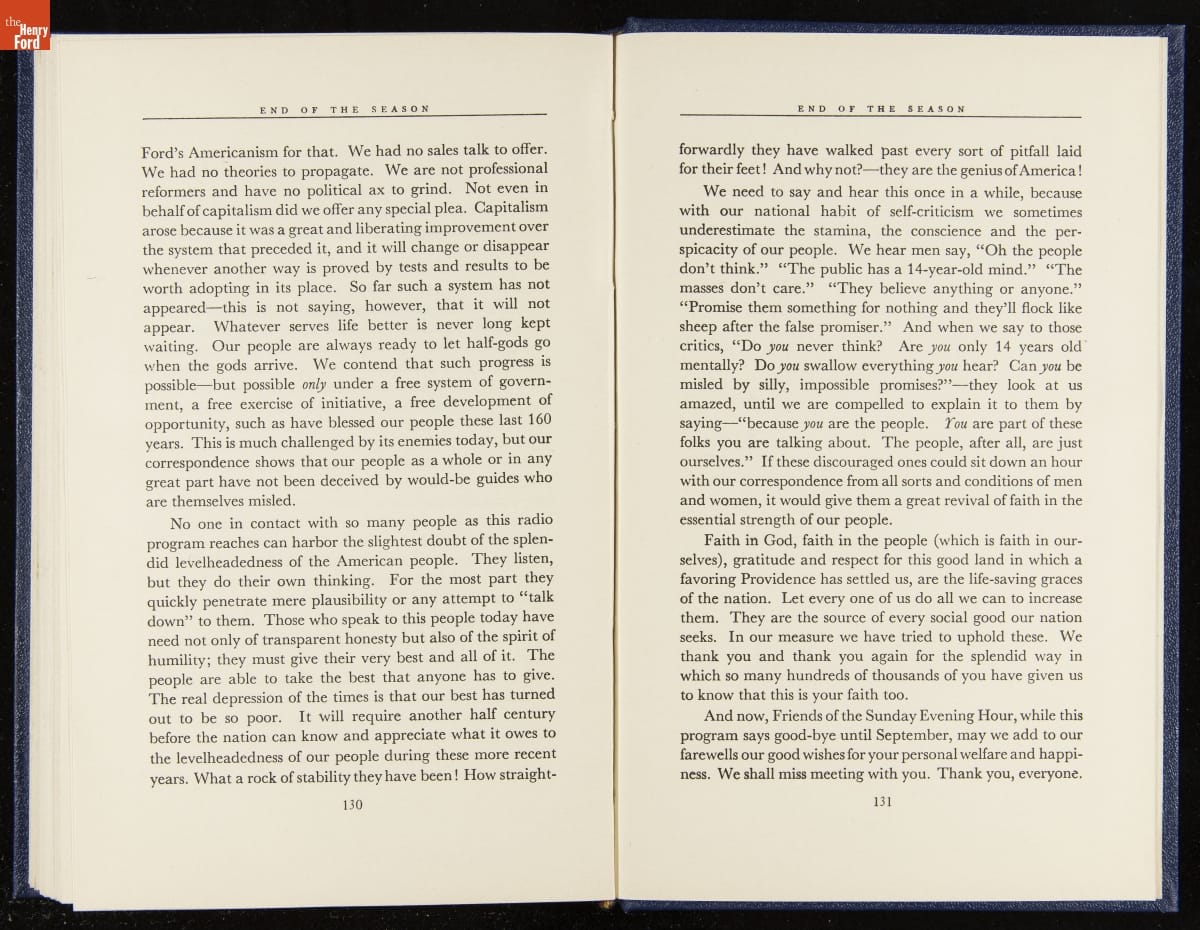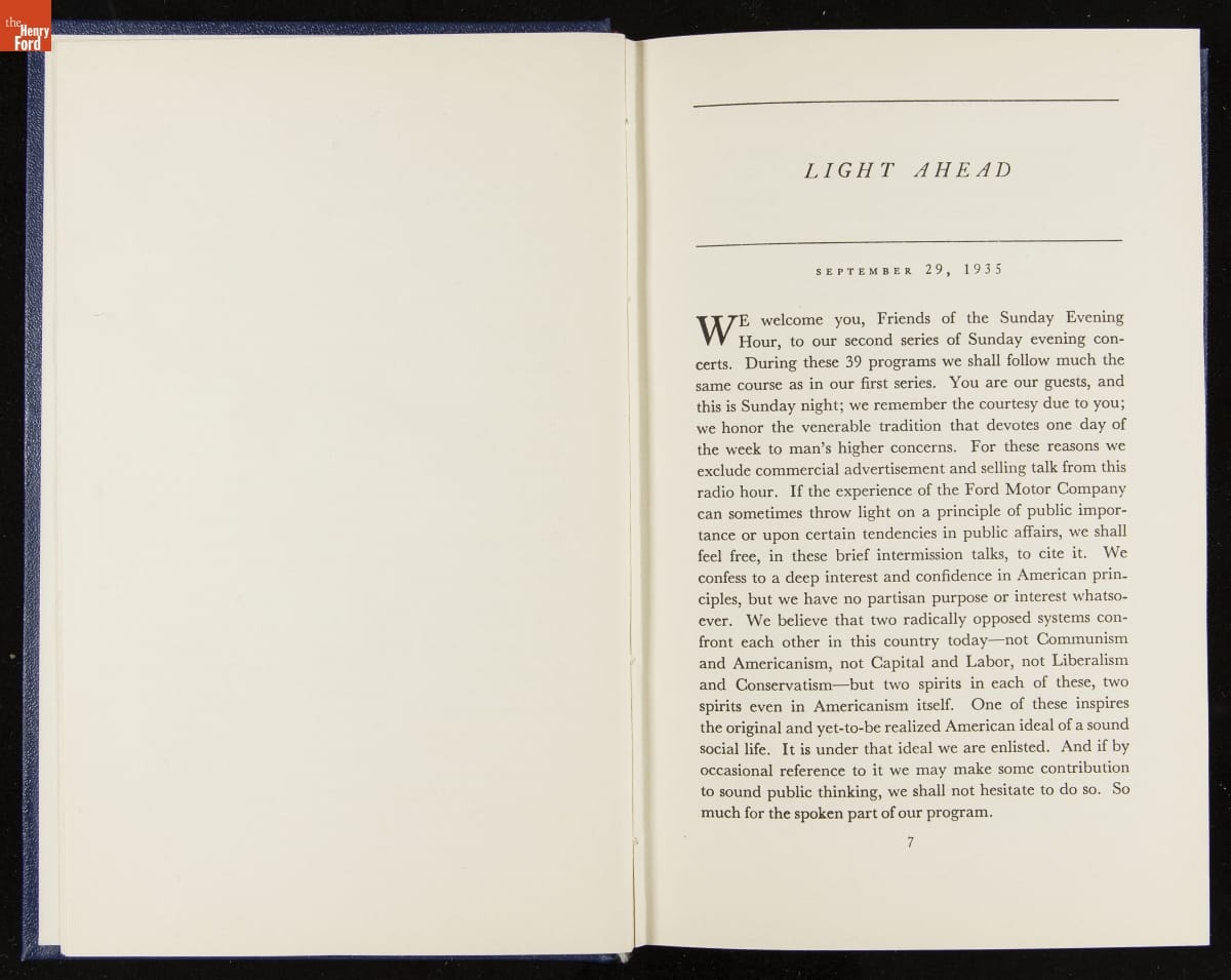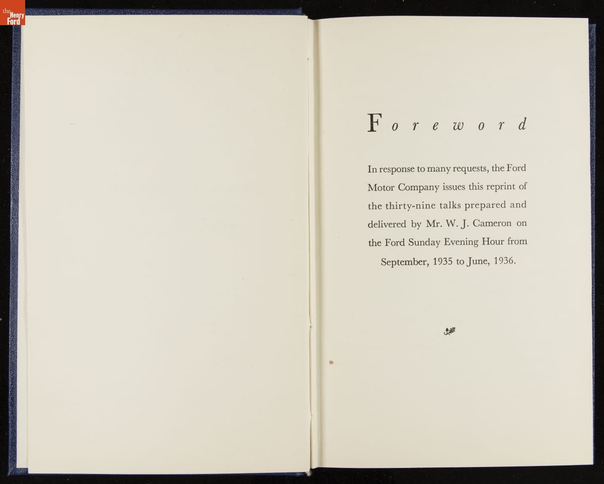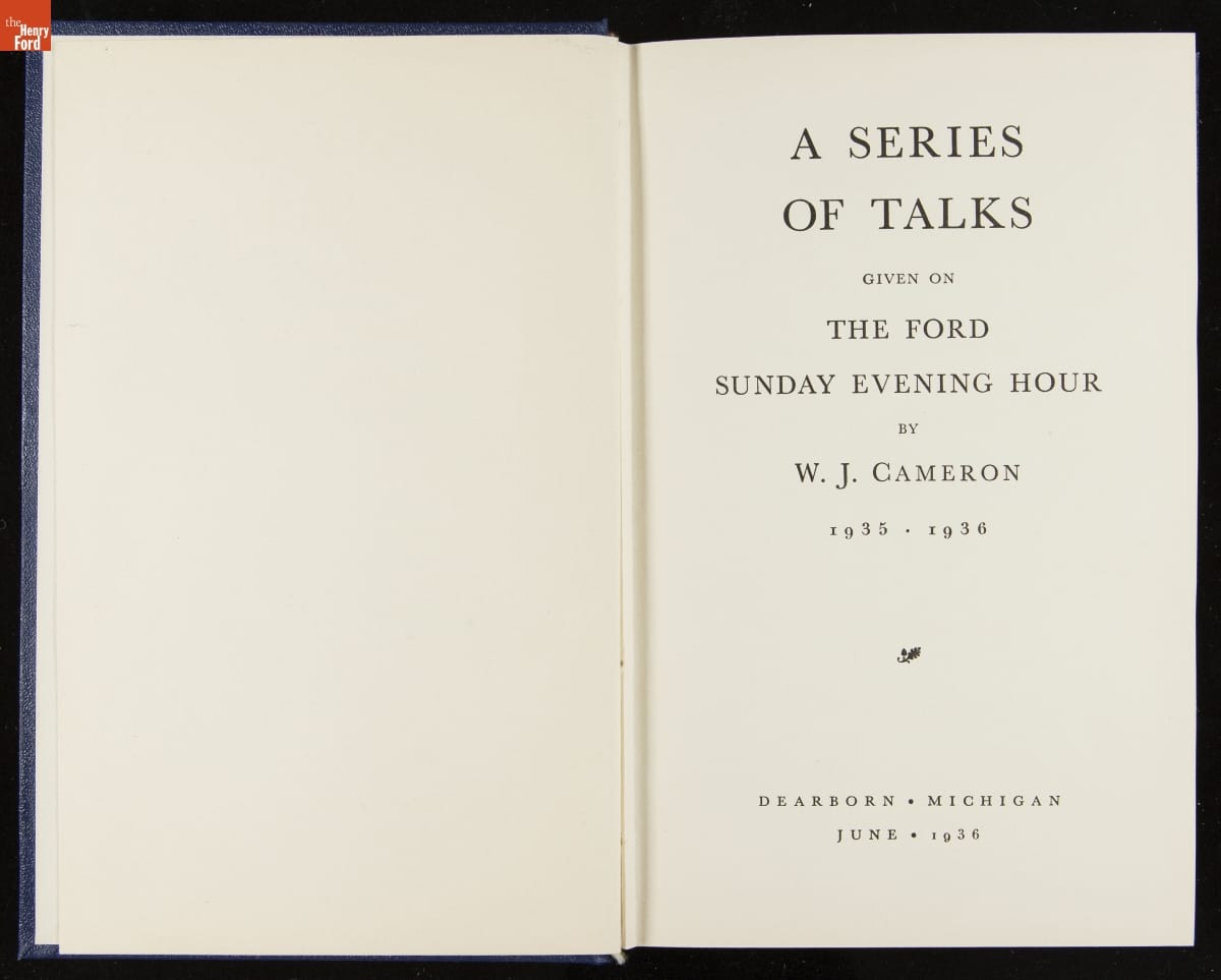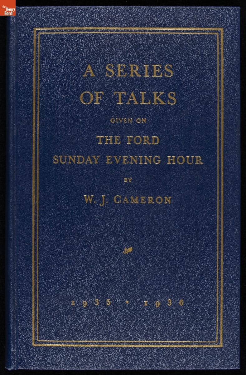 Launched in 1934, the Ford Sunday Evening Hour radio program featured classical music, guest soloists and conductors, and a weekly talk during intermission. Henry Ford asked his friend and advisor William J. Cameron to write and deliver these messages. Cameron, who composed the anti-Semitic articles for The Dearborn Independent, now peddled softer populist views--avoiding extremes and any direct attacks on politicians, ethnic groups, or Wall Street financiers.