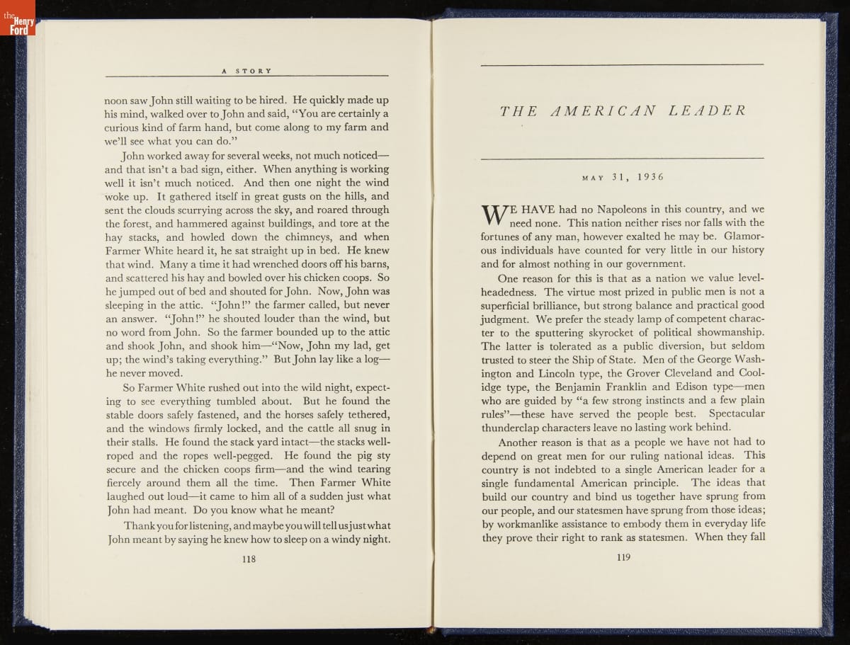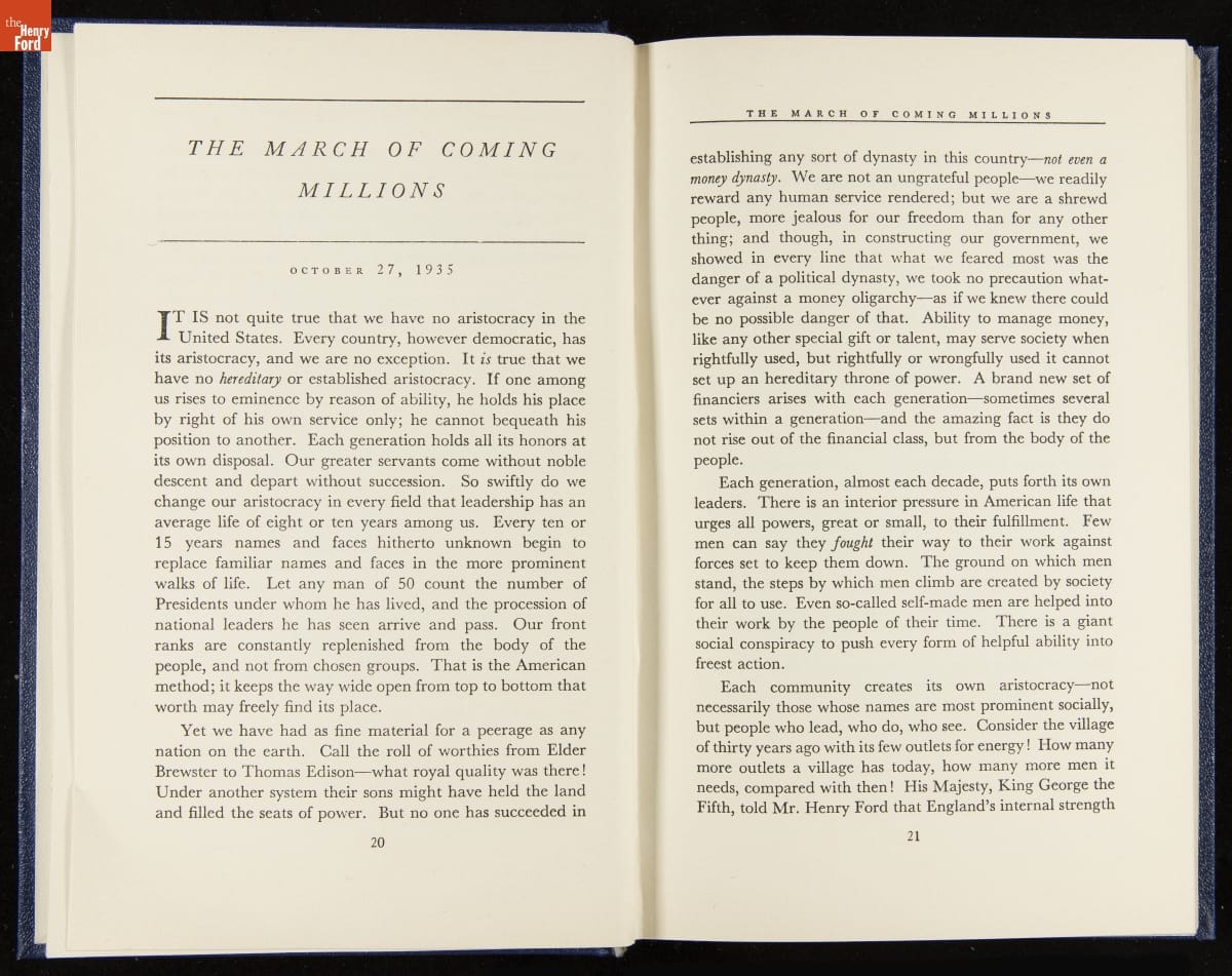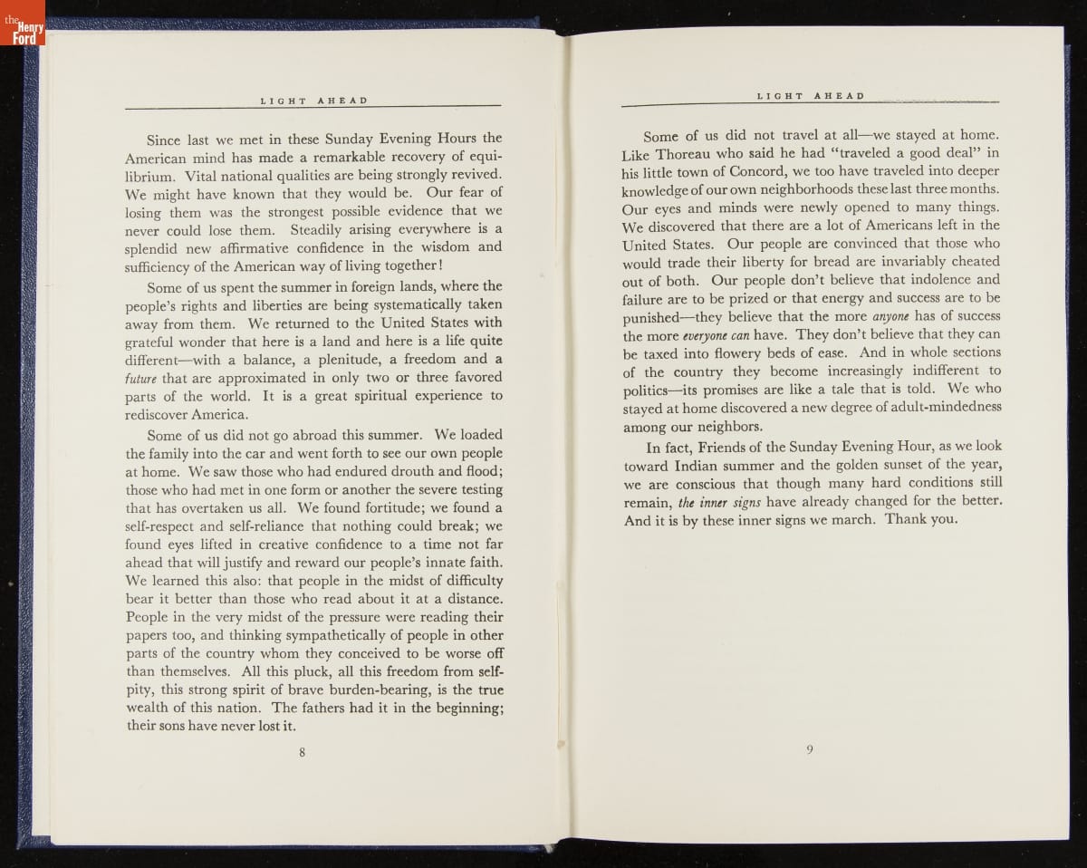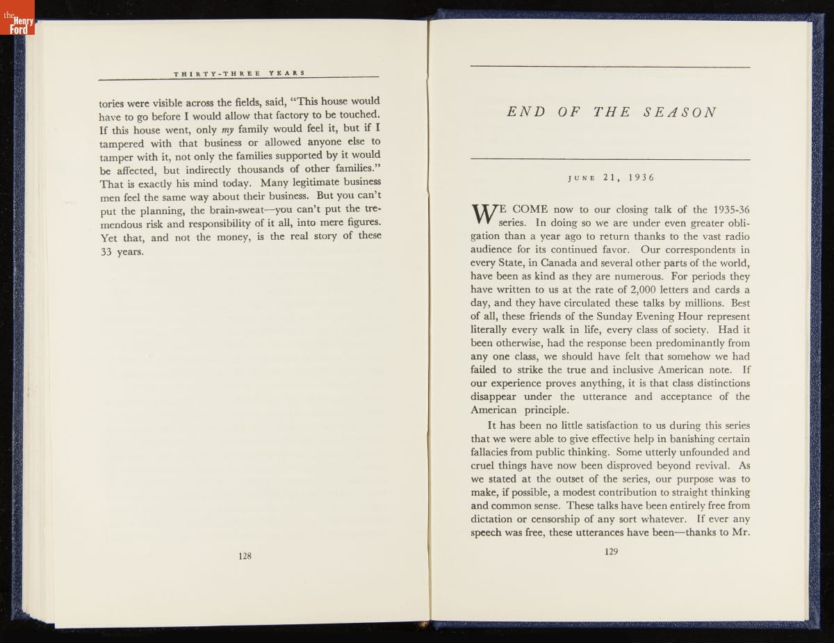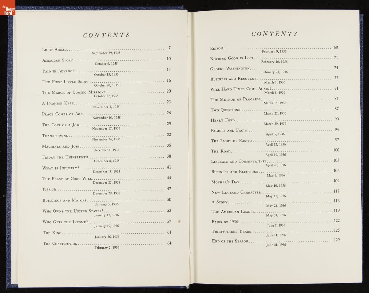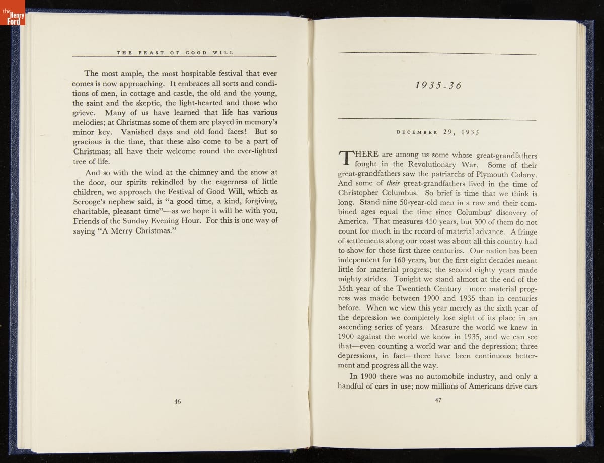 Launched in 1934, the Ford Sunday Evening Hour radio program featured classical music, guest soloists and conductors, and a weekly talk during intermission. Henry Ford asked his friend and advisor William J. Cameron to write and deliver these messages. Cameron, who composed the anti-Semitic articles for The Dearborn Independent, now peddled softer populist views--avoiding extremes and any direct attacks on politicians, ethnic groups, or Wall Street financiers.
