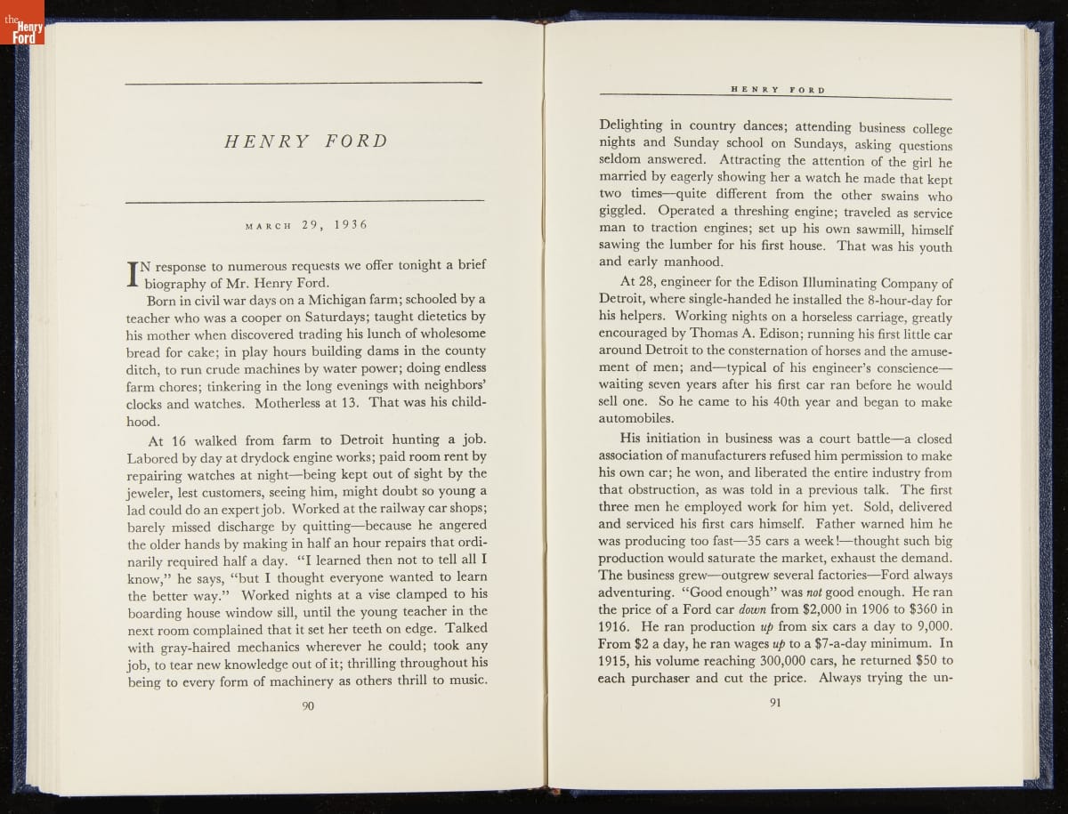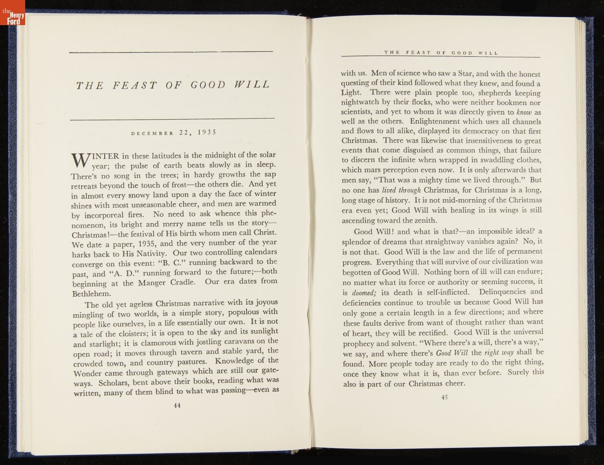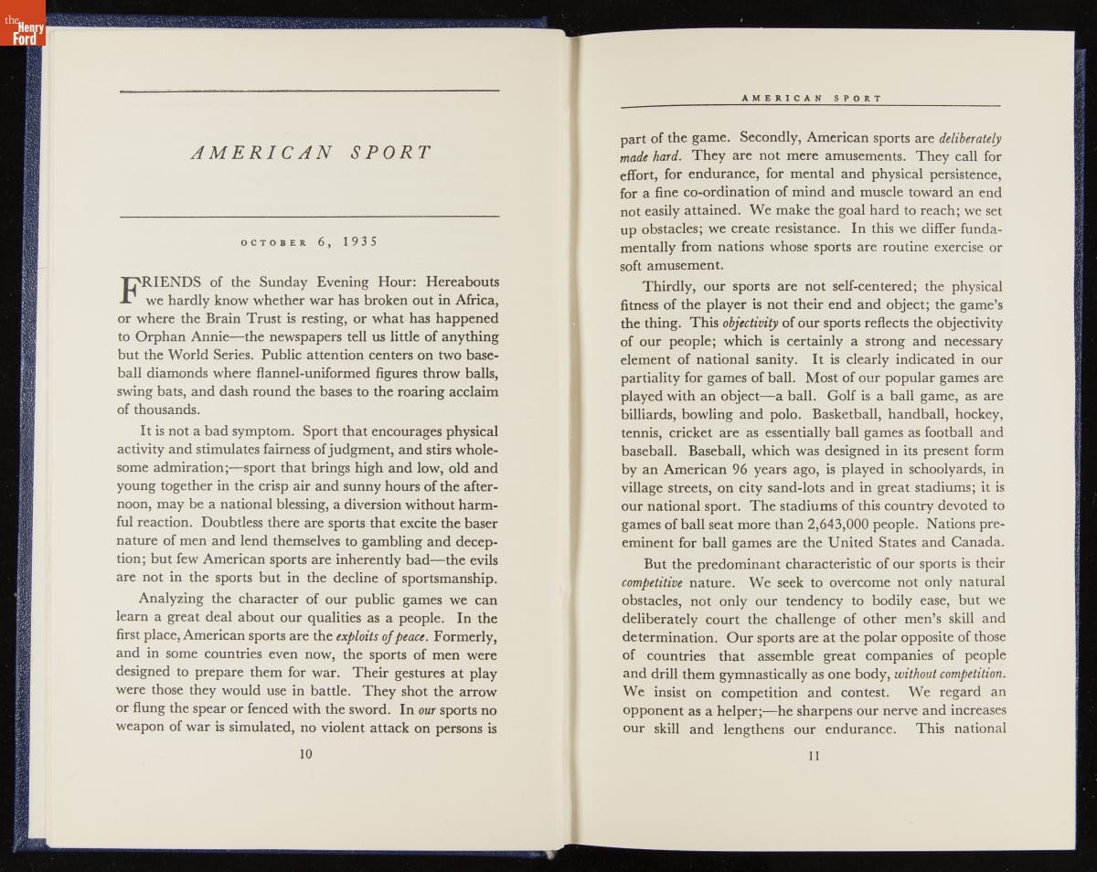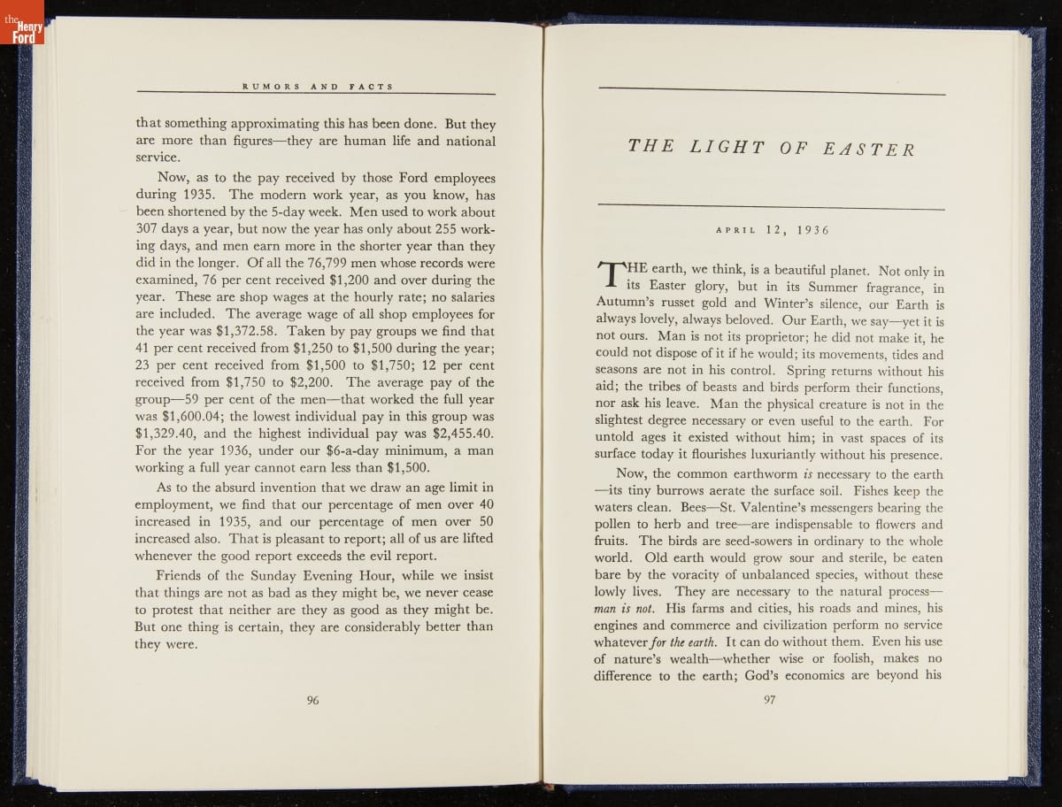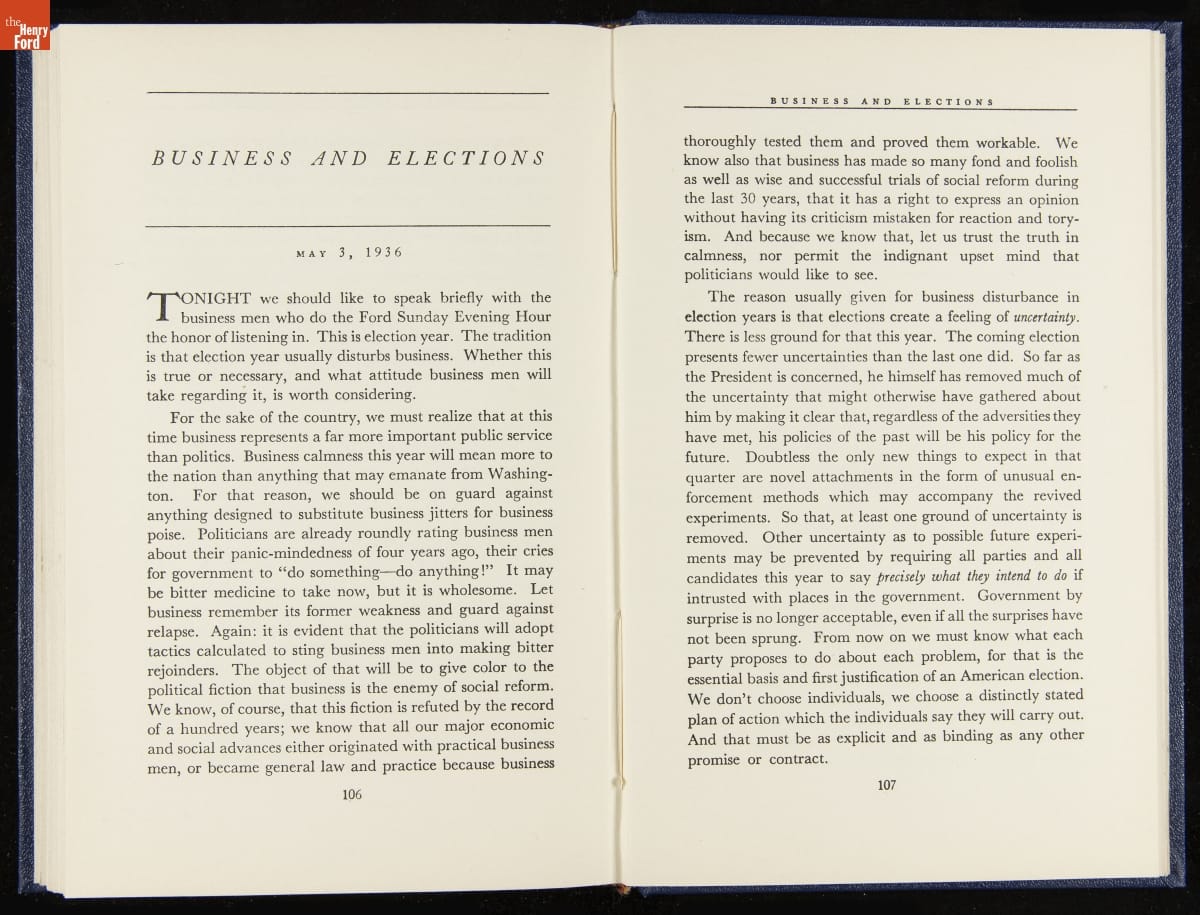 Launched in 1934, the Ford Sunday Evening Hour radio program featured classical music, guest soloists and conductors, and a weekly talk during intermission. Henry Ford asked his friend and advisor William J. Cameron to write and deliver these messages. Cameron, who composed the anti-Semitic articles for The Dearborn Independent, now peddled softer populist views--avoiding extremes and any direct attacks on politicians, ethnic groups, or Wall Street financiers.