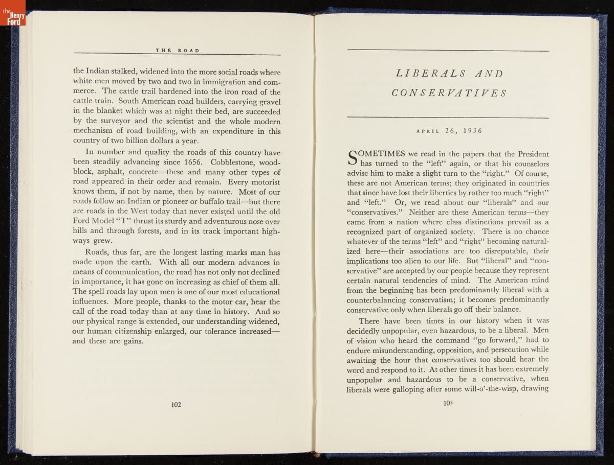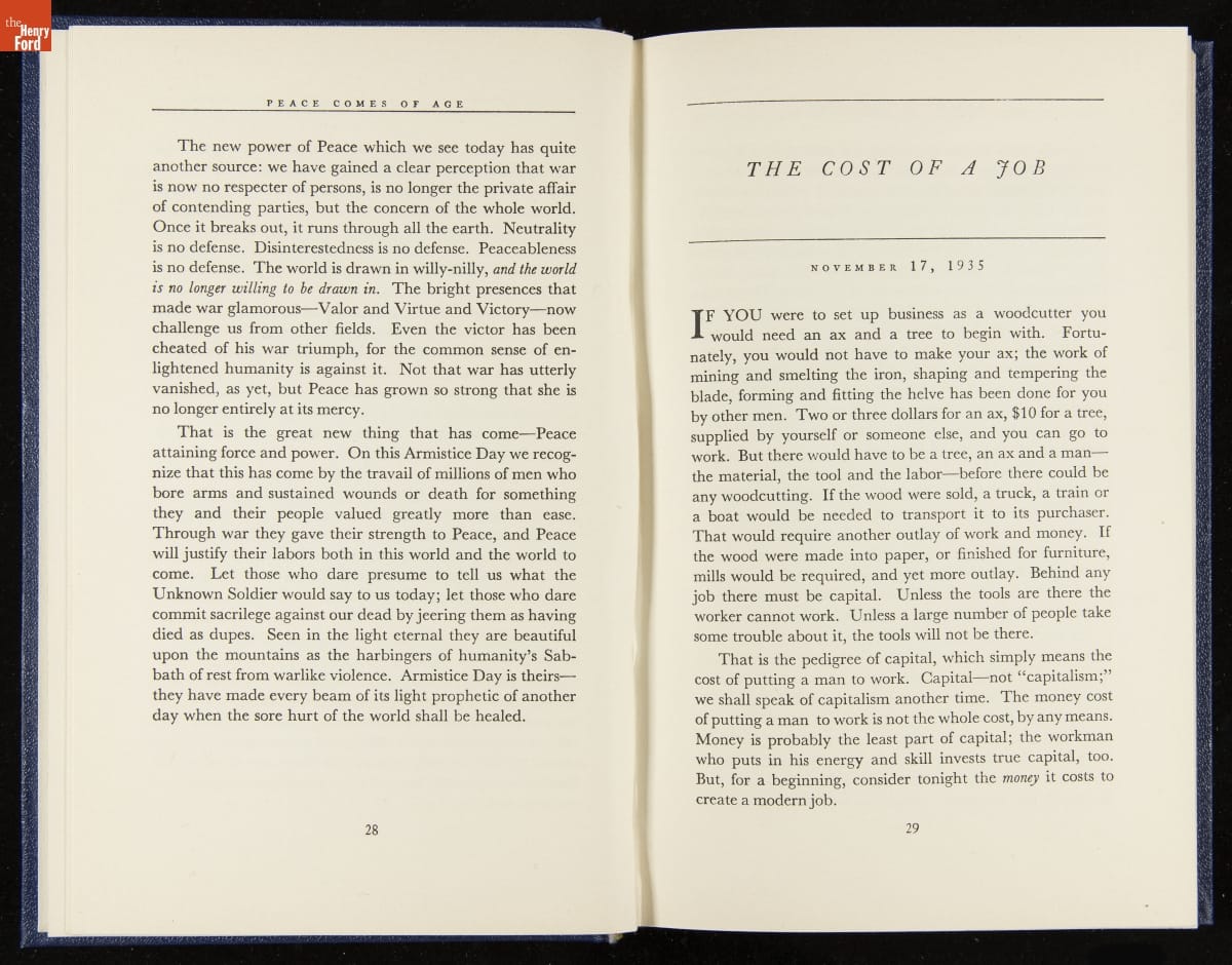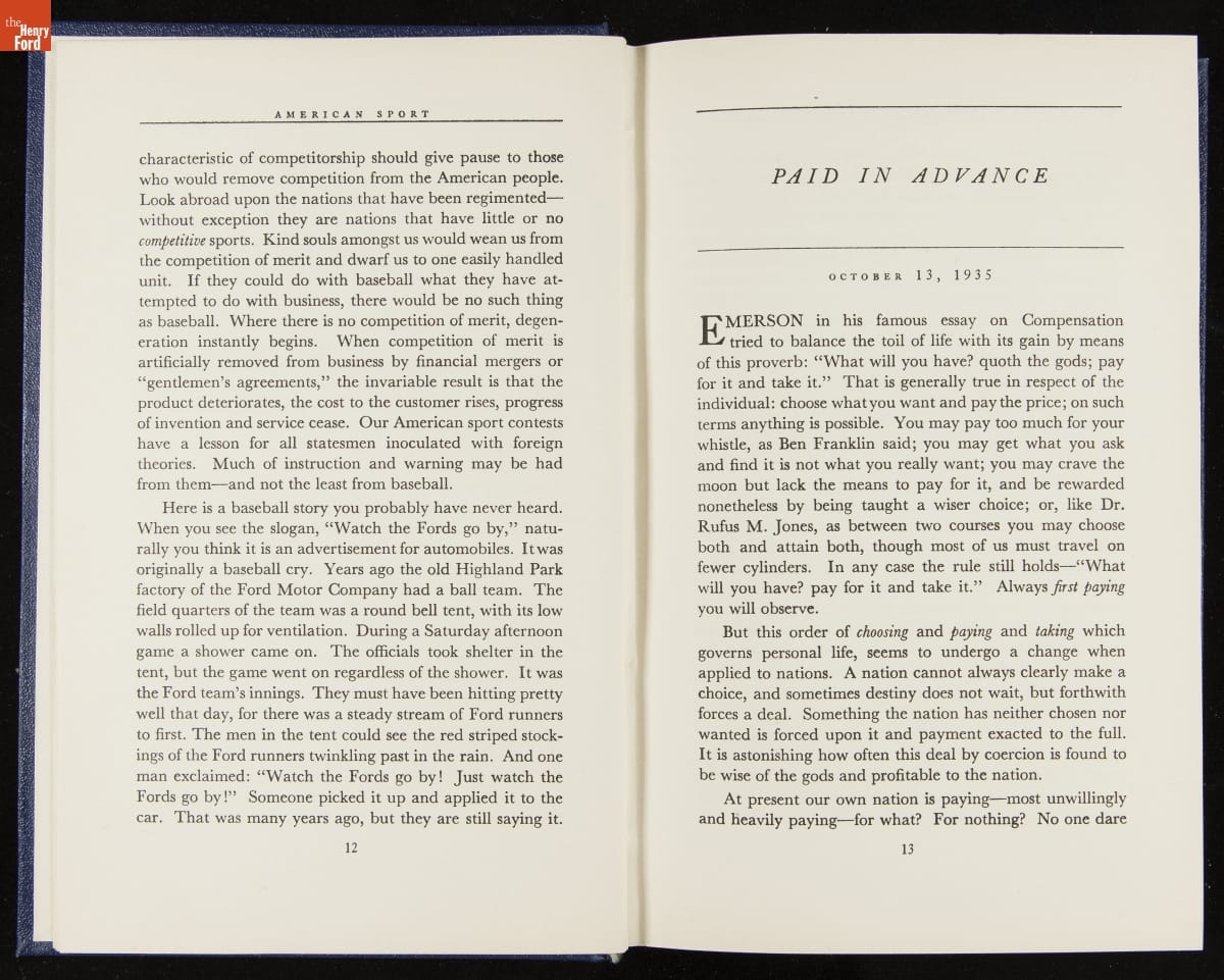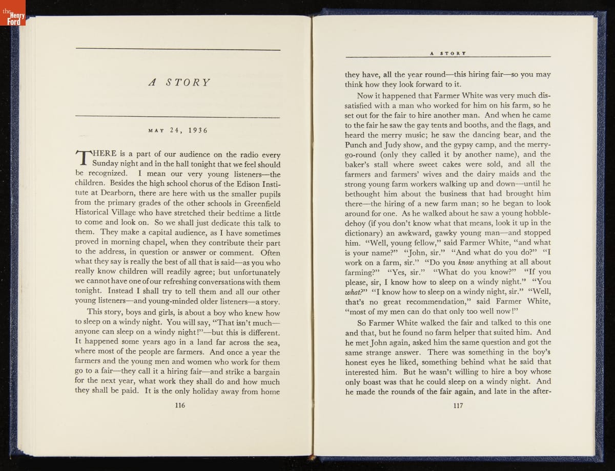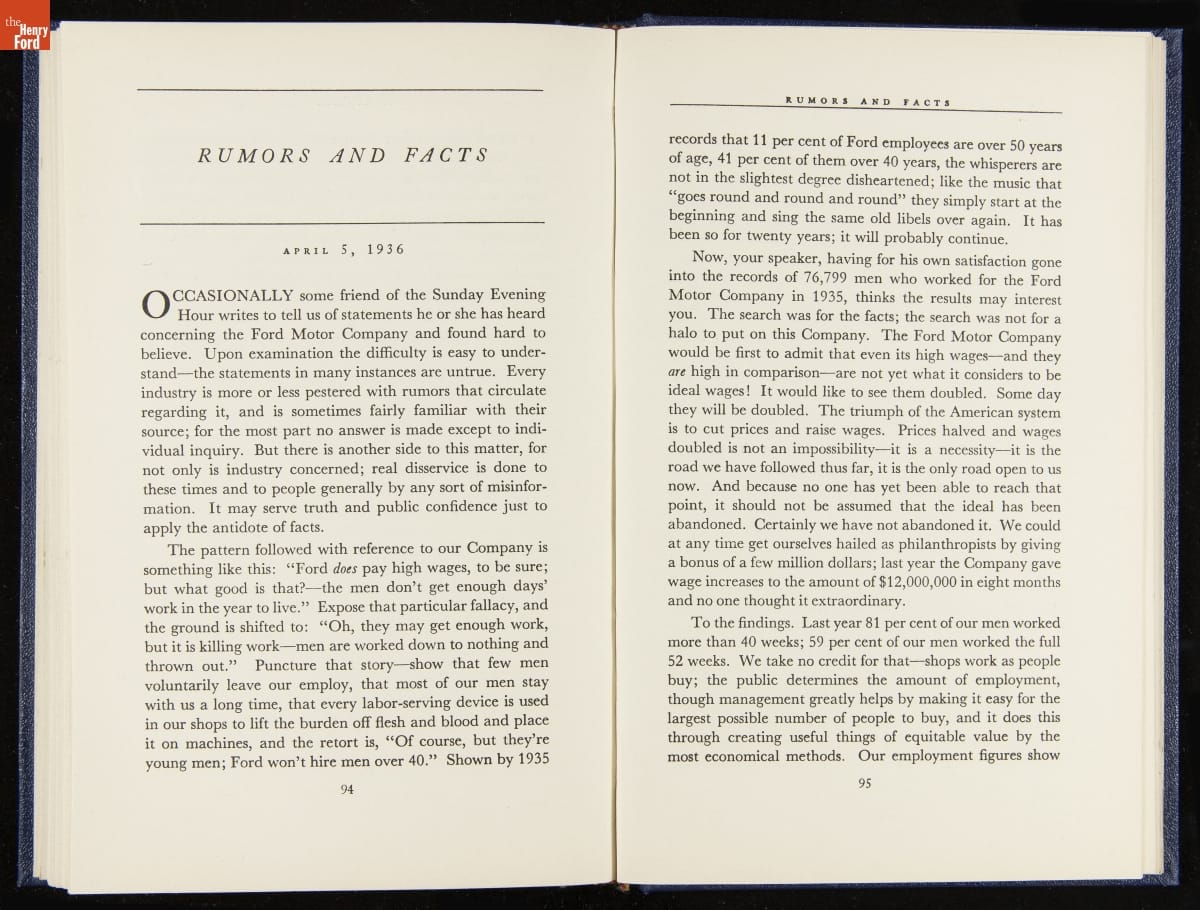 Launched in 1934, the Ford Sunday Evening Hour radio program featured classical music, guest soloists and conductors, and a weekly talk during intermission. Henry Ford asked his friend and advisor William J. Cameron to write and deliver these messages. Cameron, who composed the anti-Semitic articles for The Dearborn Independent, now peddled softer populist views--avoiding extremes and any direct attacks on politicians, ethnic groups, or Wall Street financiers.