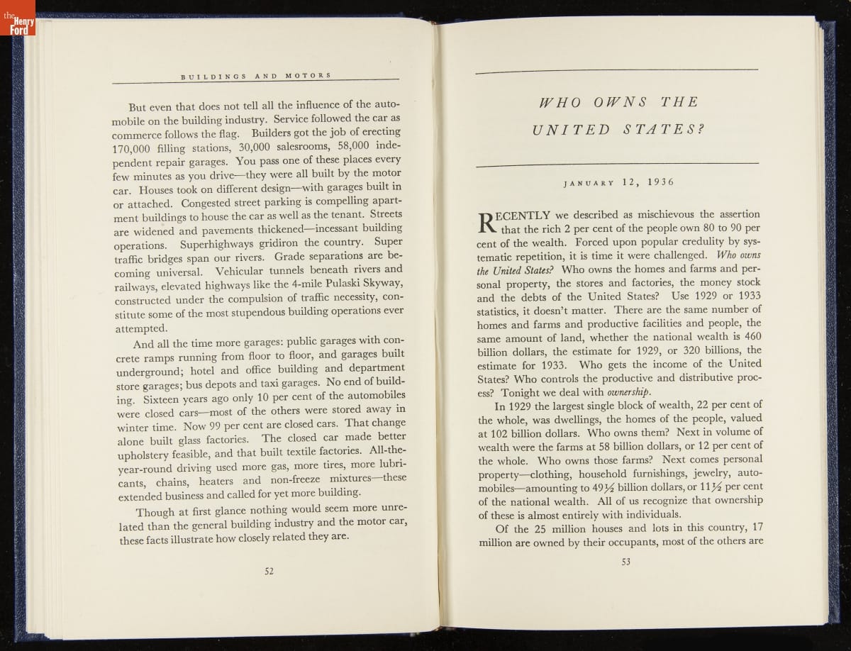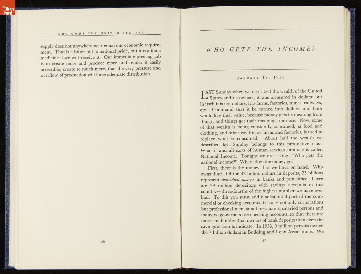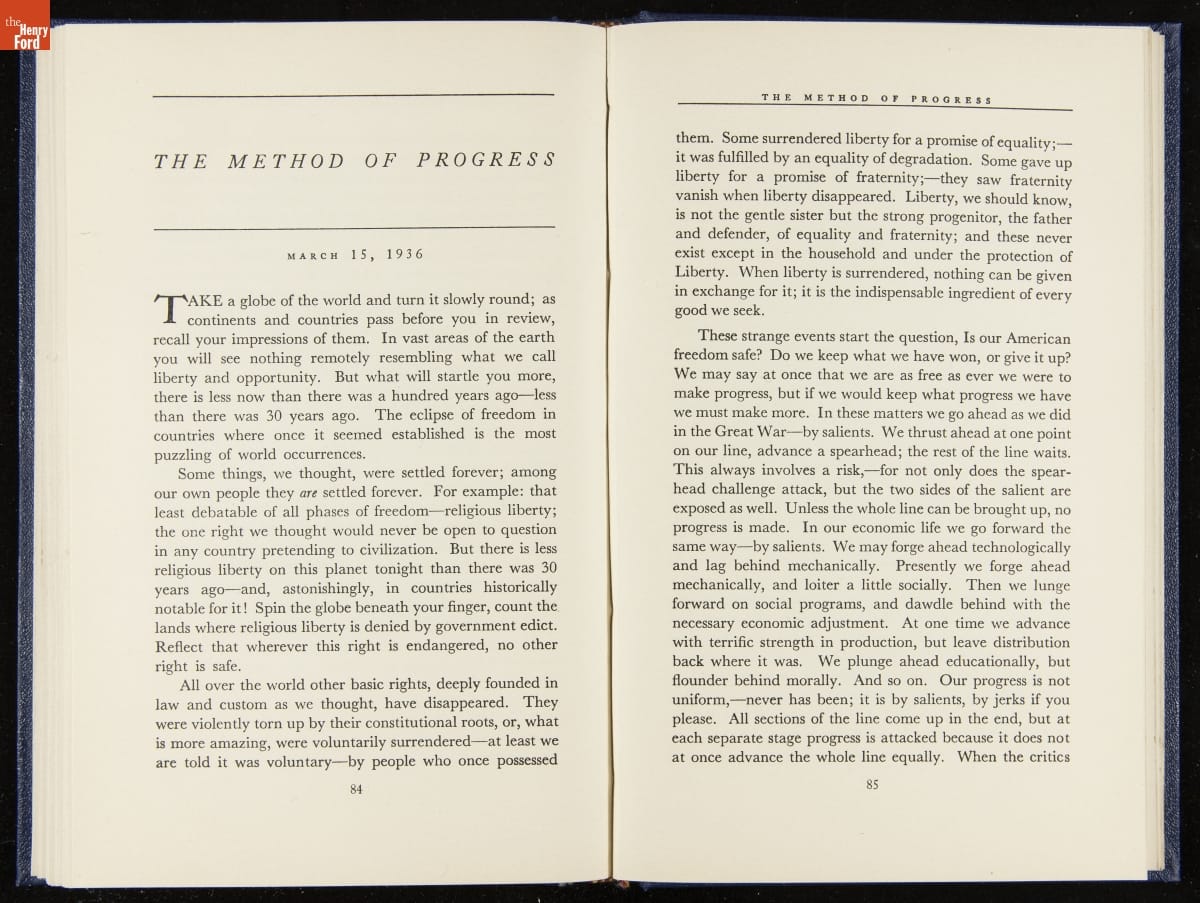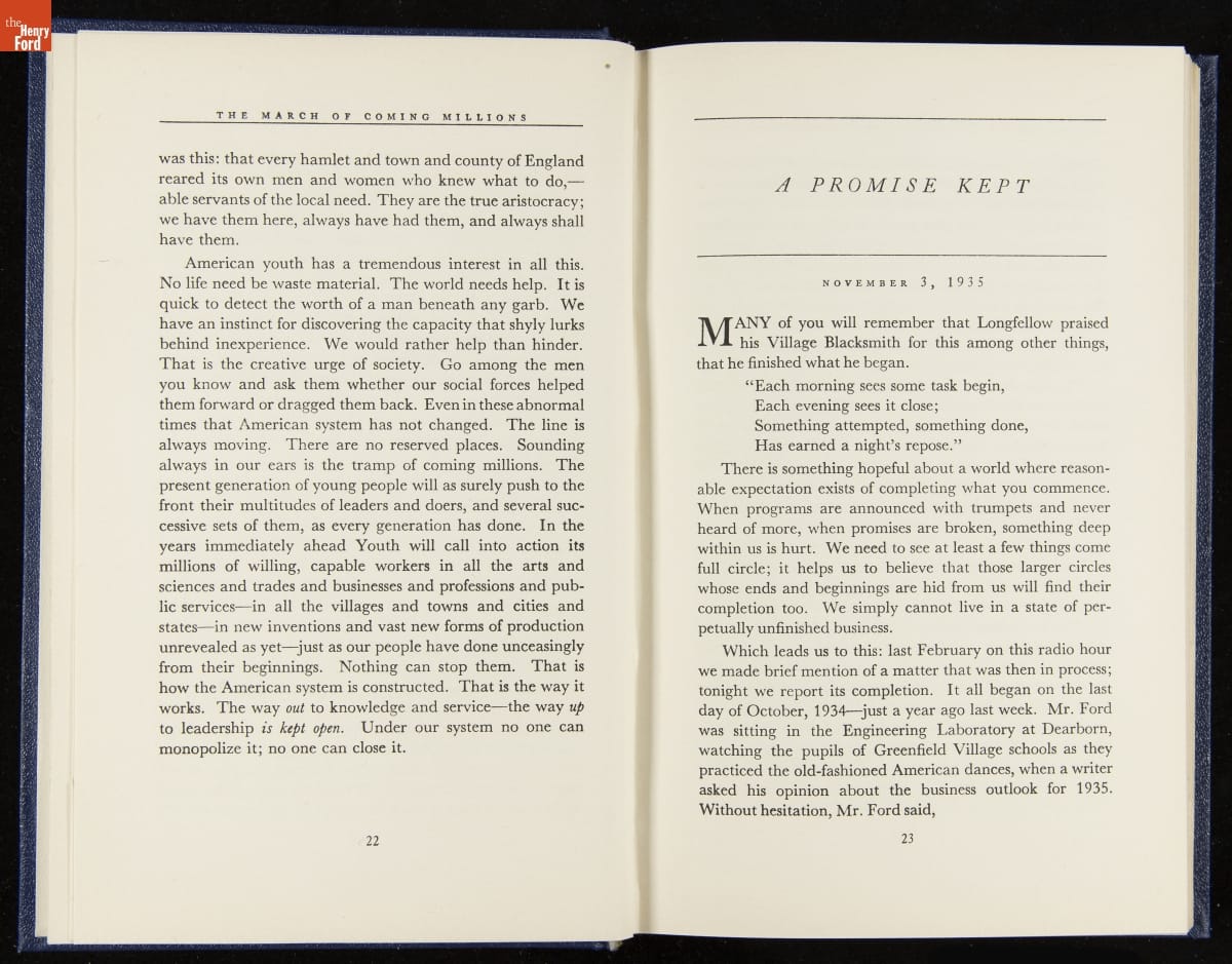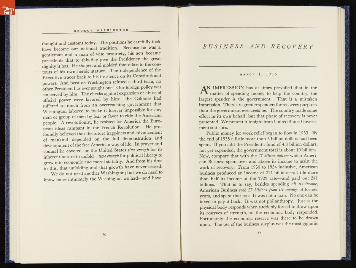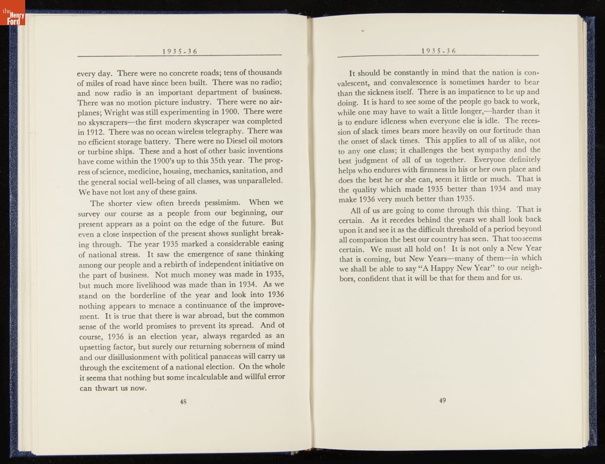 Launched in 1934, the Ford Sunday Evening Hour radio program featured classical music, guest soloists and conductors, and a weekly talk during intermission. Henry Ford asked his friend and advisor William J. Cameron to write and deliver these messages. Cameron, who composed the anti-Semitic articles for The Dearborn Independent, now peddled softer populist views--avoiding extremes and any direct attacks on politicians, ethnic groups, or Wall Street financiers.