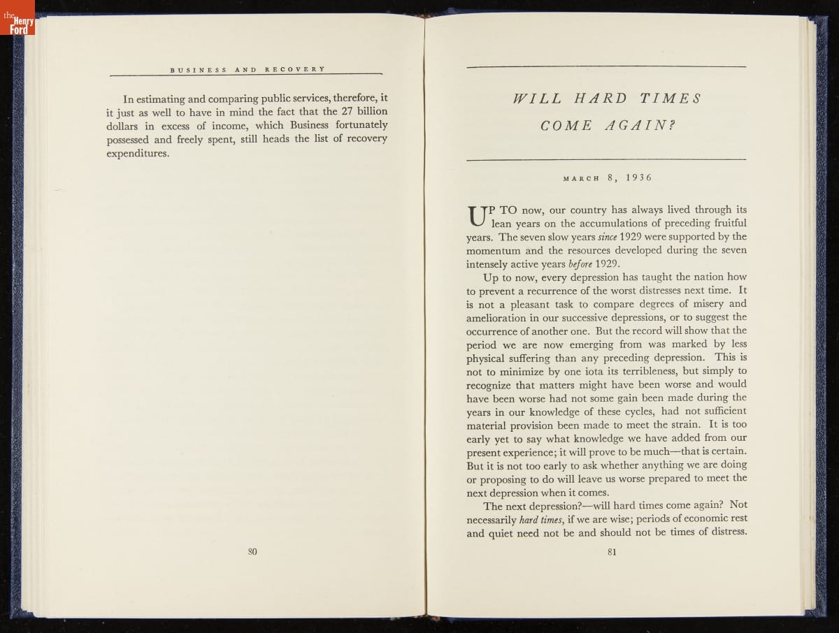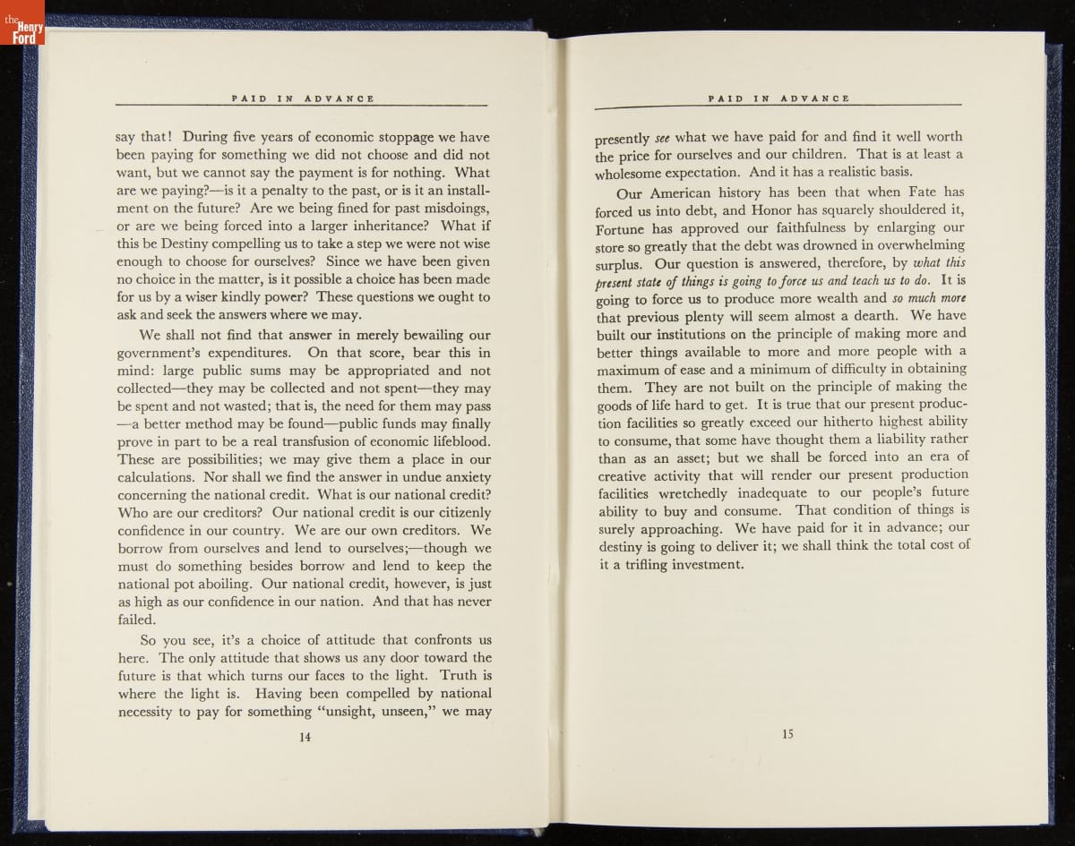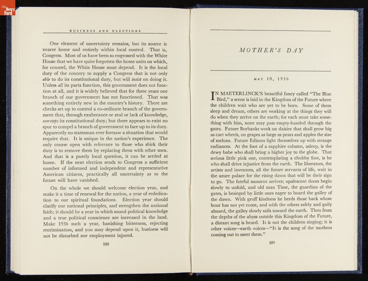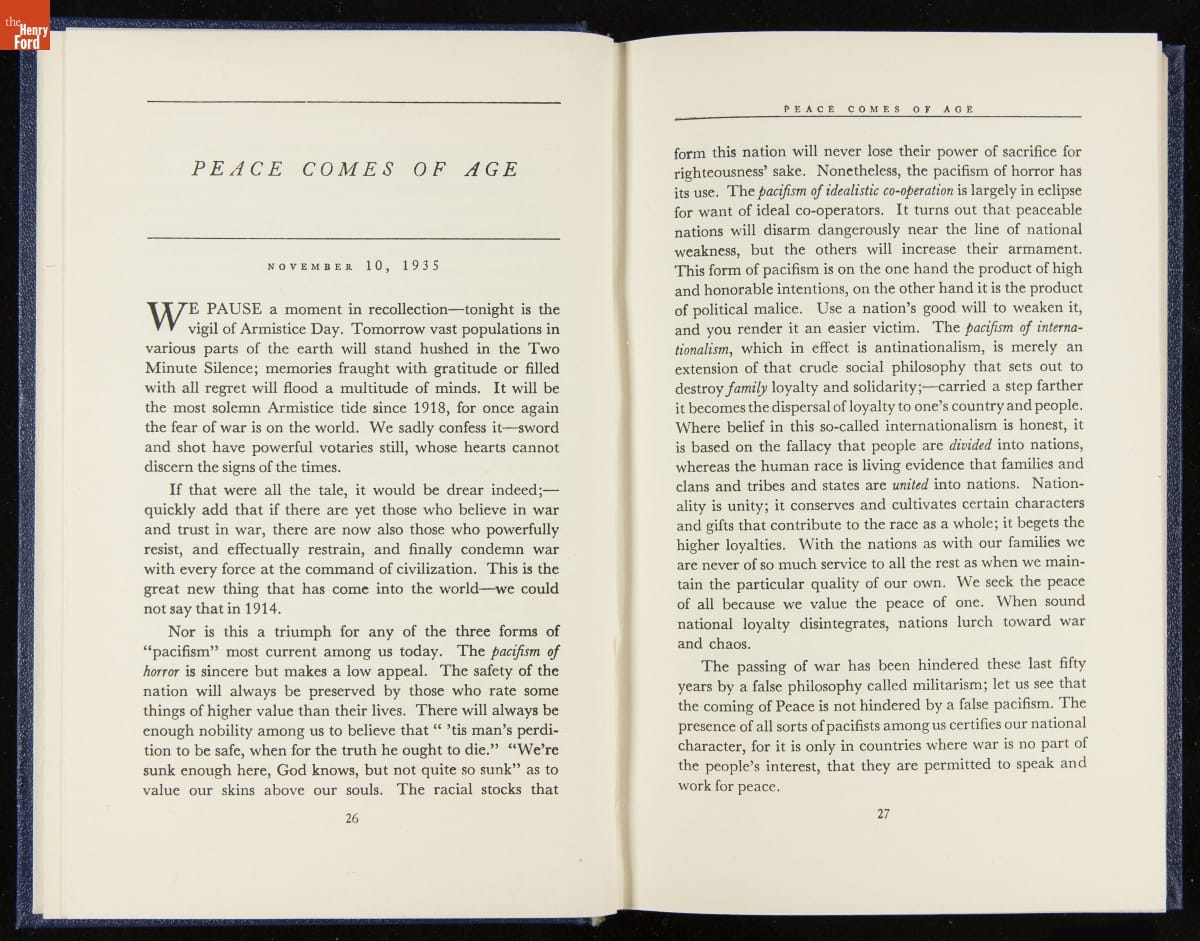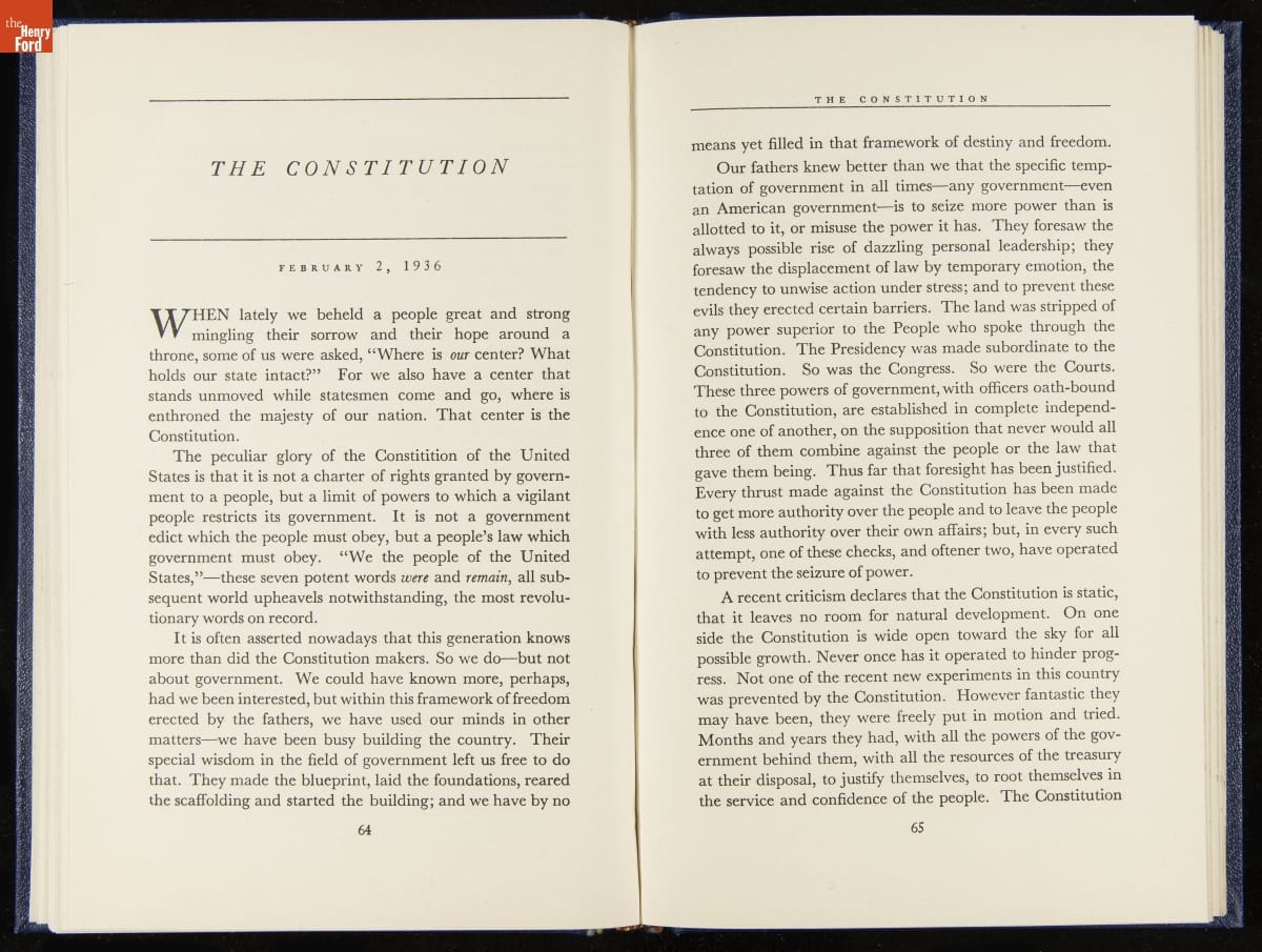 Launched in 1934, the Ford Sunday Evening Hour radio program featured classical music, guest soloists and conductors, and a weekly talk during intermission. Henry Ford asked his friend and advisor William J. Cameron to write and deliver these messages. Cameron, who composed the anti-Semitic articles for The Dearborn Independent, now peddled softer populist views--avoiding extremes and any direct attacks on politicians, ethnic groups, or Wall Street financiers.