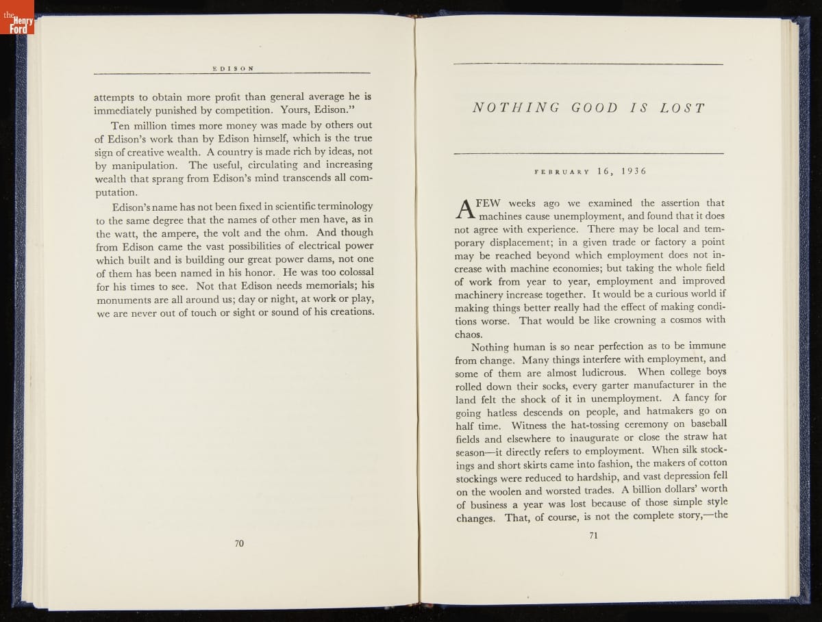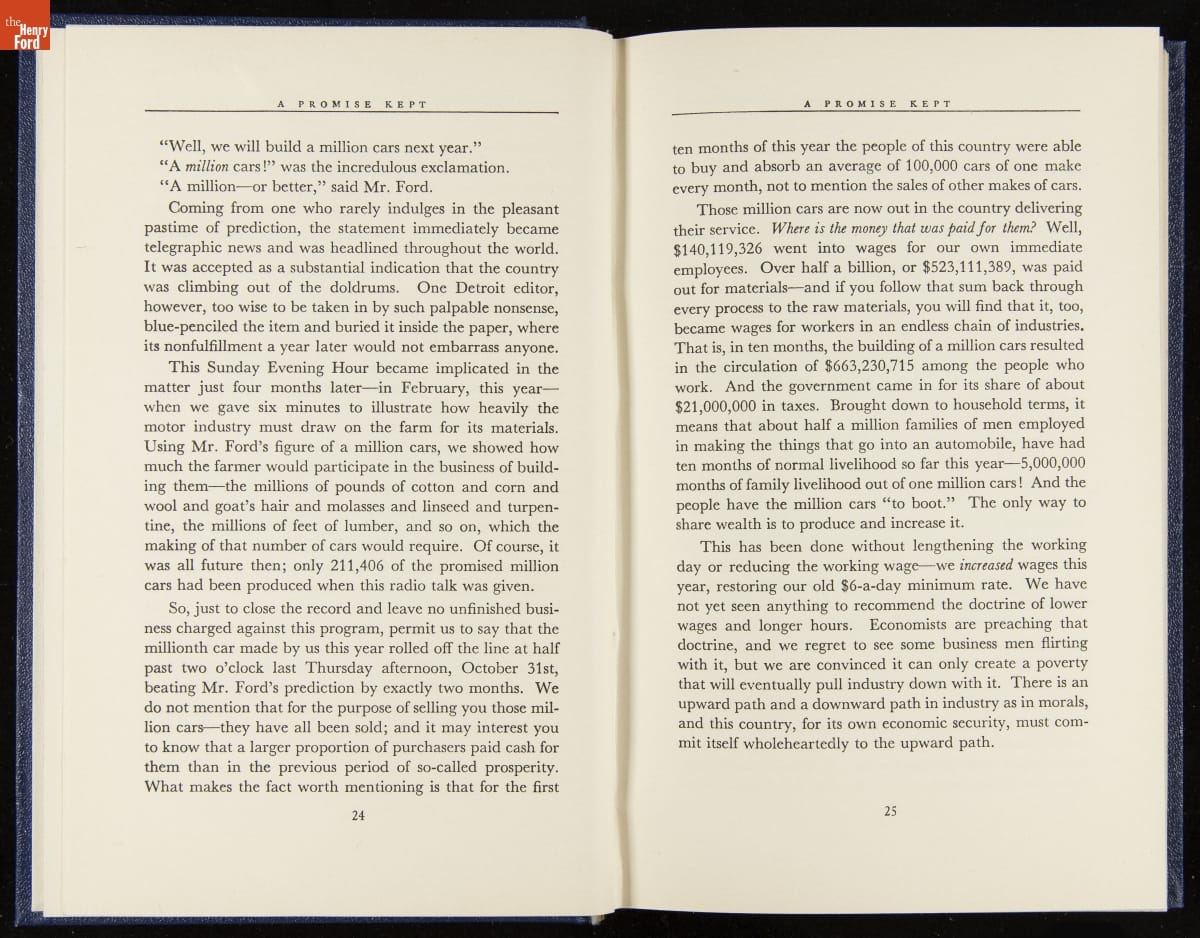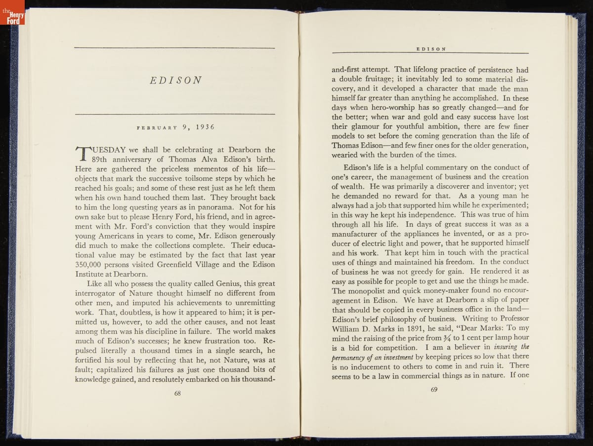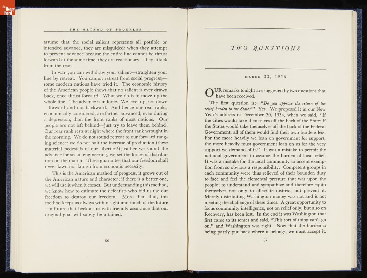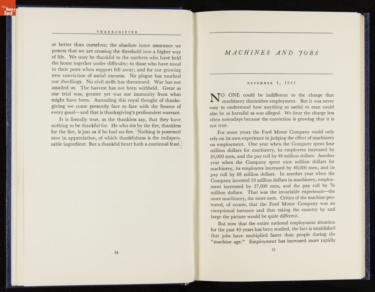 Launched in 1934, the Ford Sunday Evening Hour radio program featured classical music, guest soloists and conductors, and a weekly talk during intermission. Henry Ford asked his friend and advisor William J. Cameron to write and deliver these messages. Cameron, who composed the anti-Semitic articles for The Dearborn Independent, now peddled softer populist views--avoiding extremes and any direct attacks on politicians, ethnic groups, or Wall Street financiers.