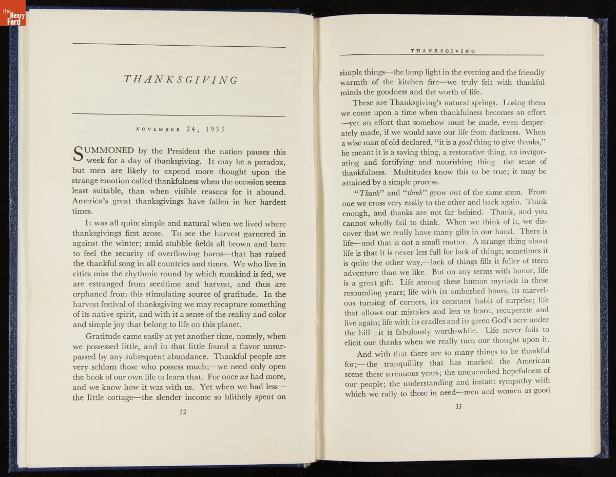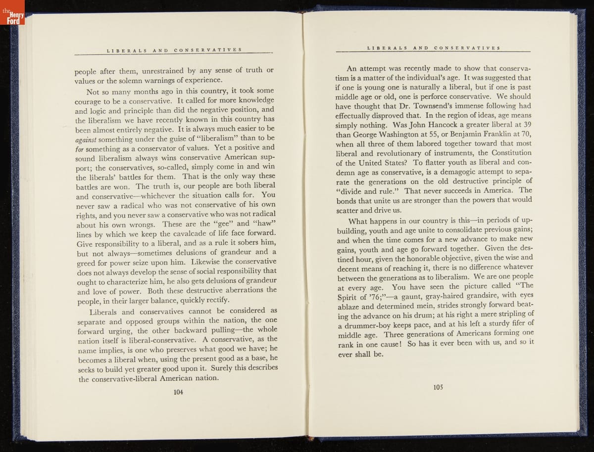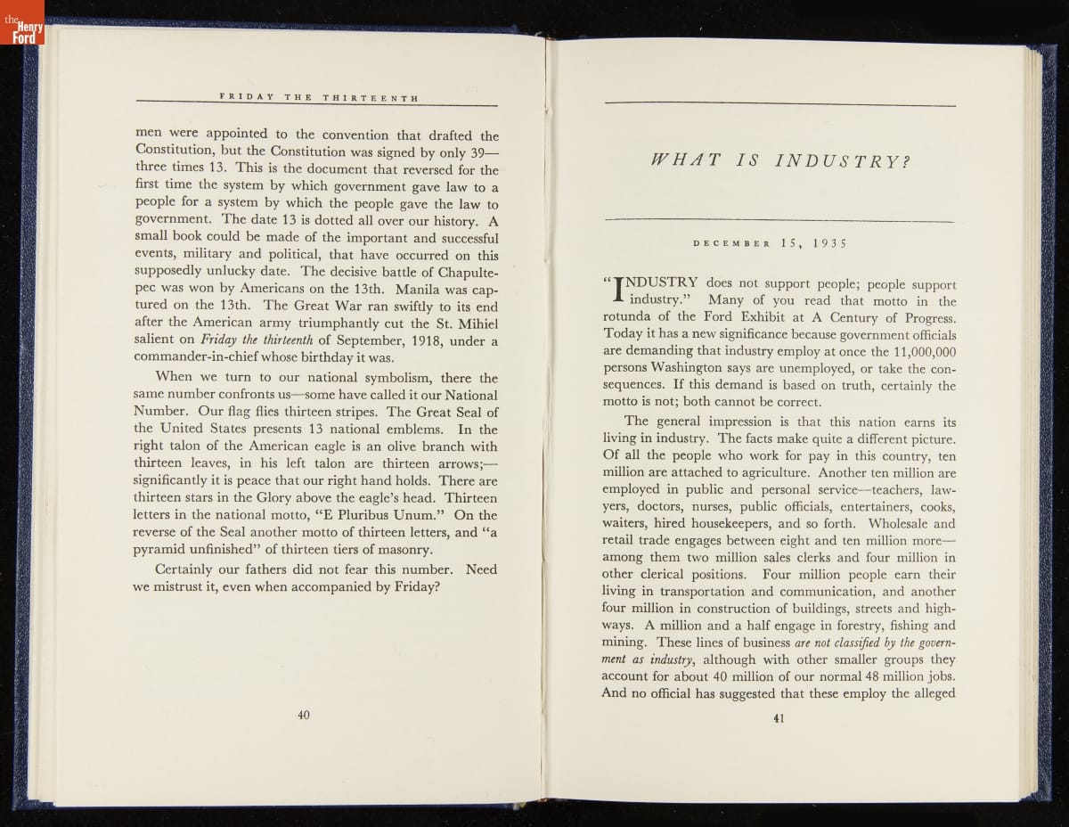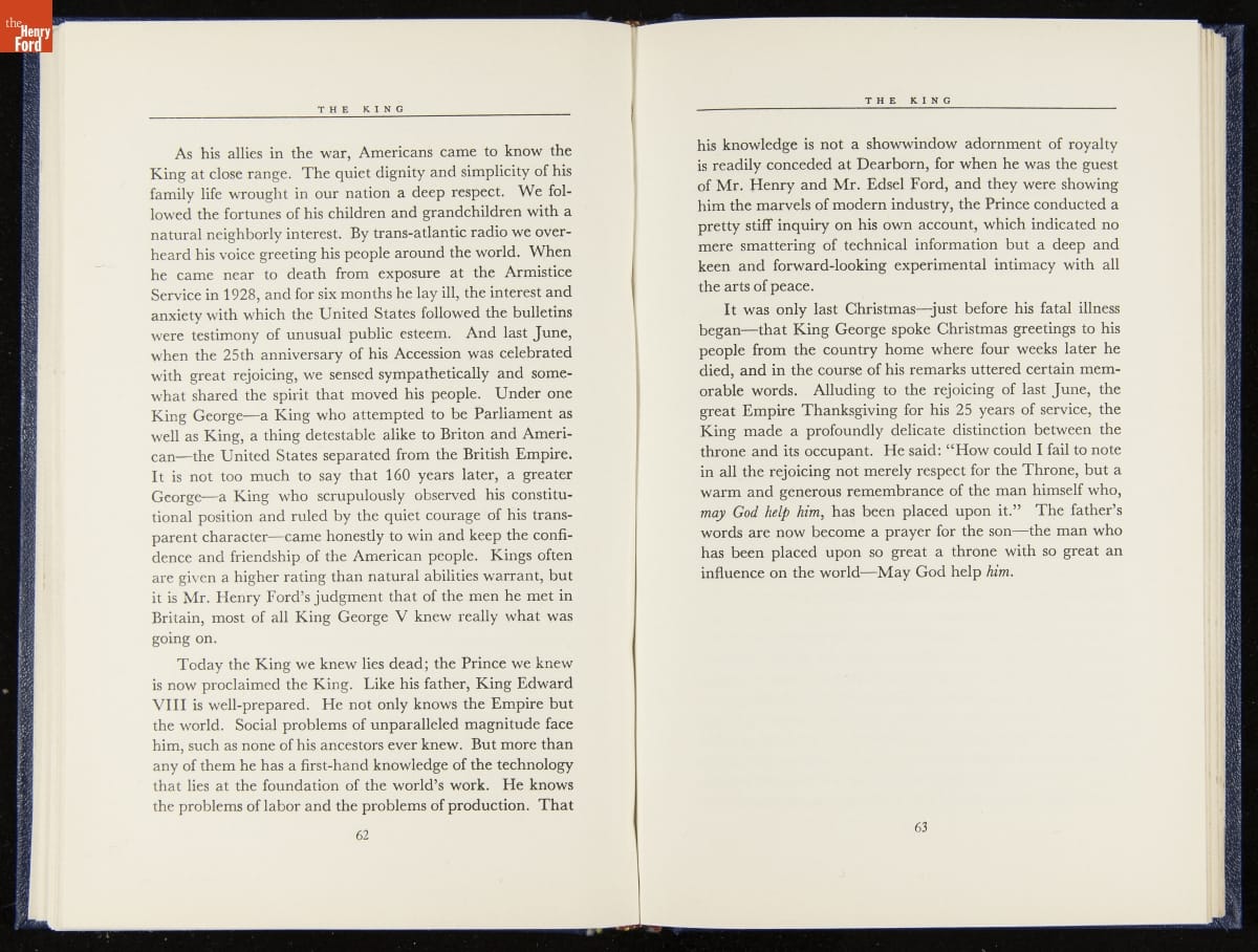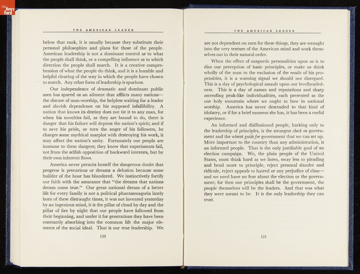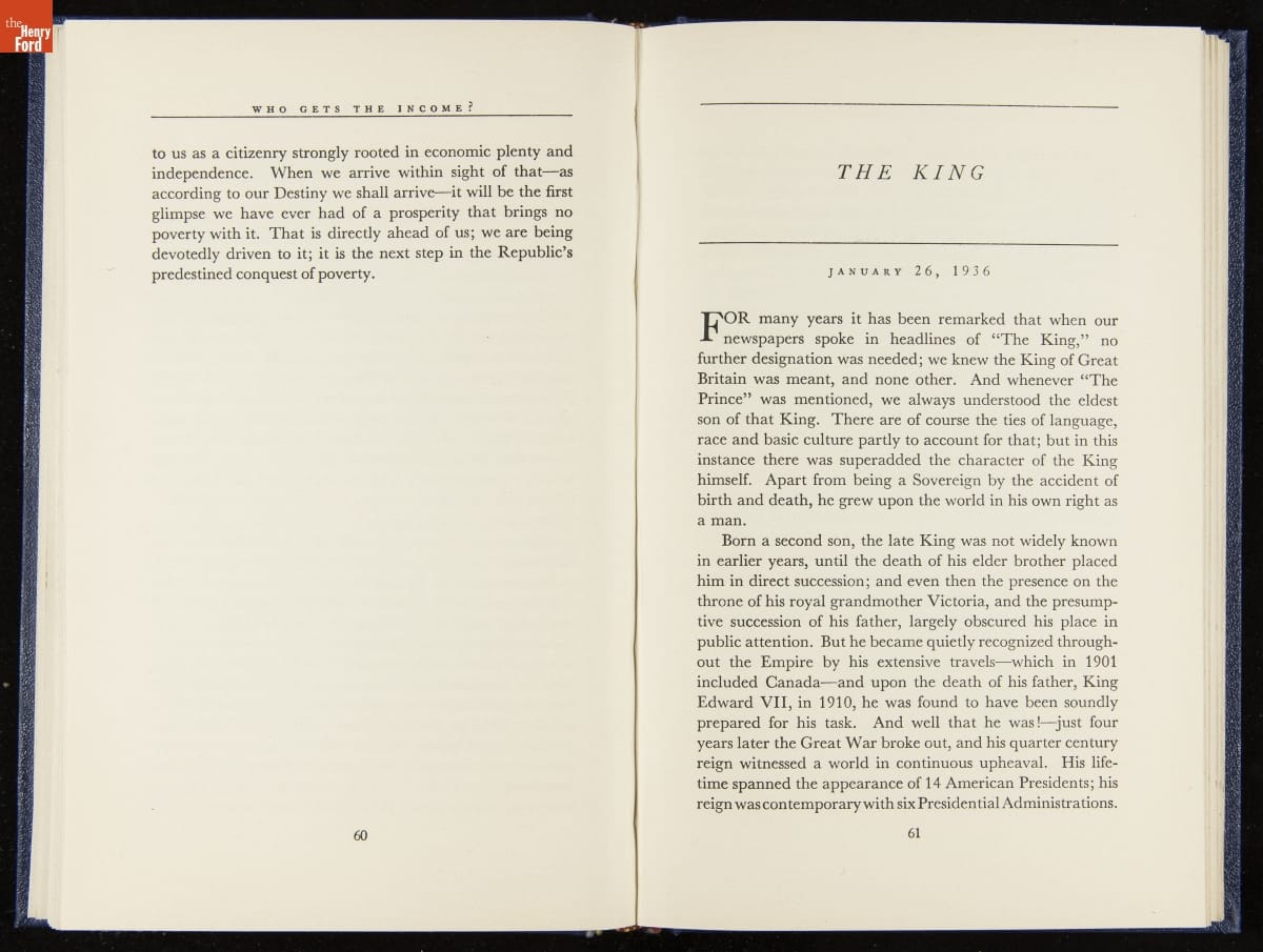 Launched in 1934, the Ford Sunday Evening Hour radio program featured classical music, guest soloists and conductors, and a weekly talk during intermission. Henry Ford asked his friend and advisor William J. Cameron to write and deliver these messages. Cameron, who composed the anti-Semitic articles for The Dearborn Independent, now peddled softer populist views--avoiding extremes and any direct attacks on politicians, ethnic groups, or Wall Street financiers.