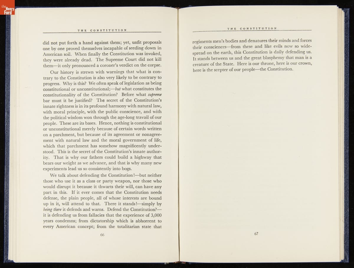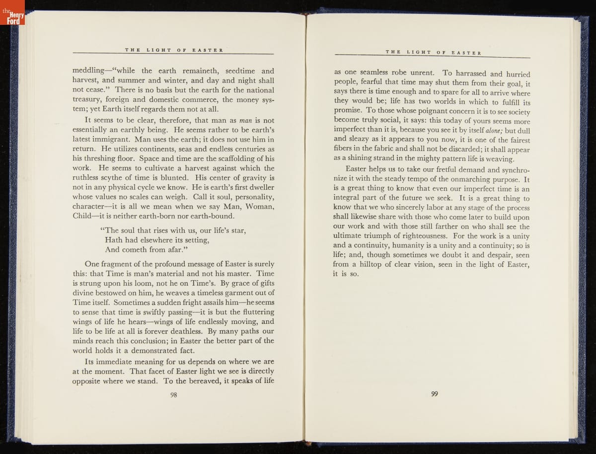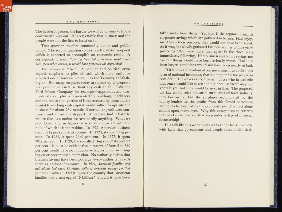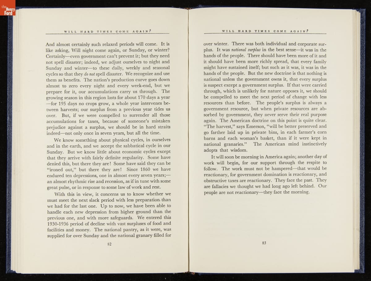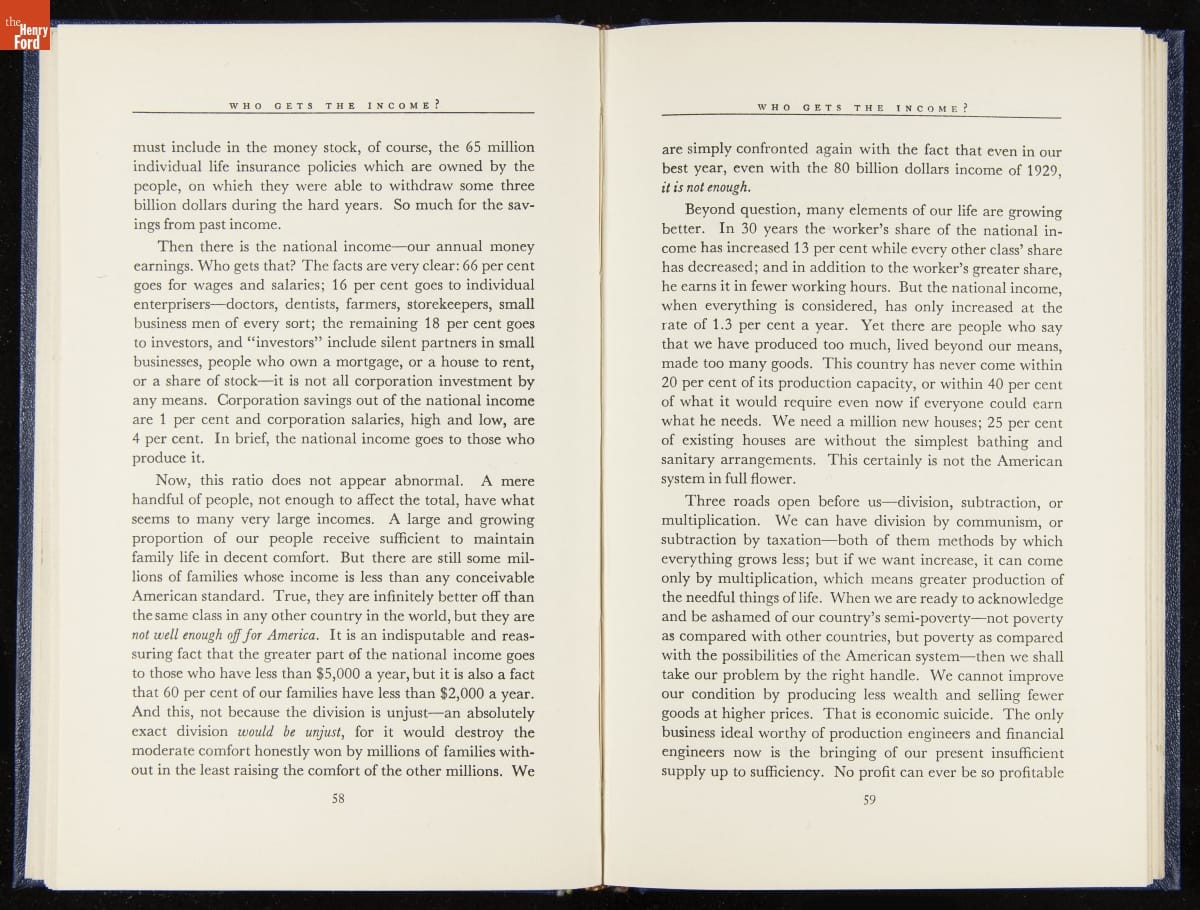 Launched in 1934, the Ford Sunday Evening Hour radio program featured classical music, guest soloists and conductors, and a weekly talk during intermission. Henry Ford asked his friend and advisor William J. Cameron to write and deliver these messages. Cameron, who composed the anti-Semitic articles for The Dearborn Independent, now peddled softer populist views--avoiding extremes and any direct attacks on politicians, ethnic groups, or Wall Street financiers.
