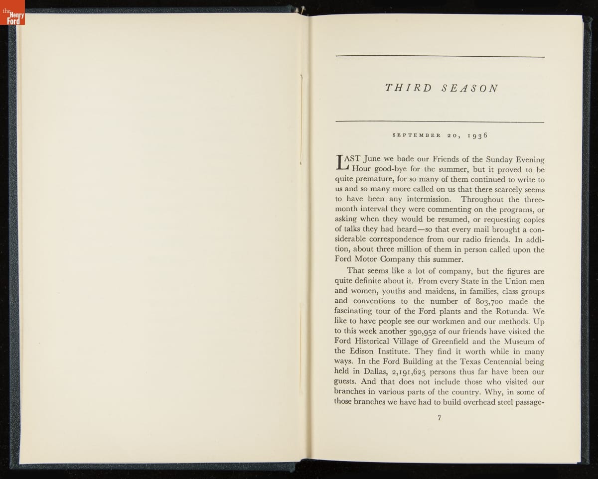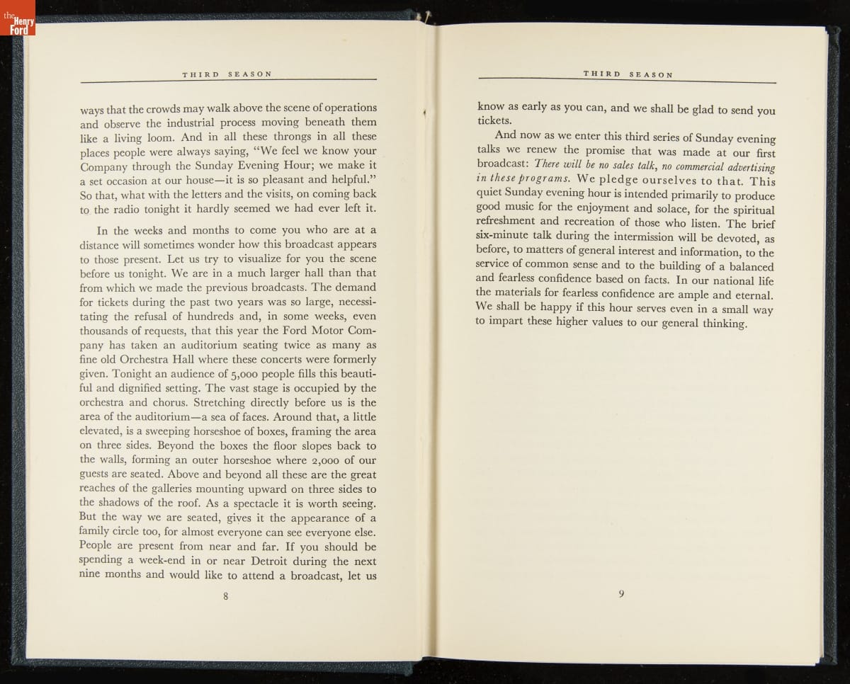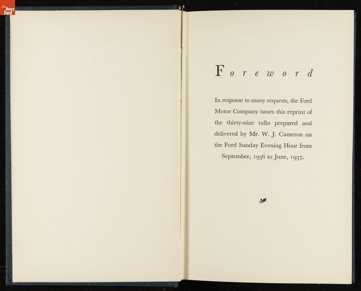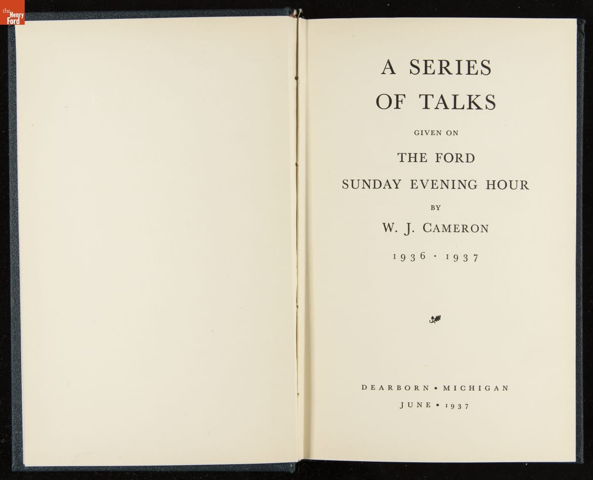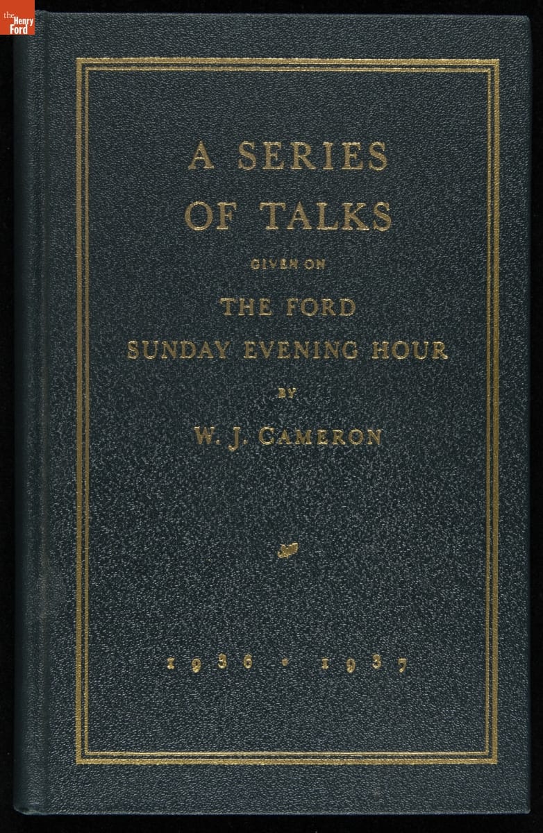 Launched in 1934, the Ford Sunday Evening Hour radio program featured classical music, guest soloists and conductors, and a weekly talk during intermission. Henry Ford asked his friend and advisor William J. Cameron to write and deliver these messages. Cameron, who composed the anti-Semitic articles for The Dearborn Independent, now peddled softer populist views--avoiding extremes and any direct attacks on politicians, ethnic groups, or Wall Street financiers.