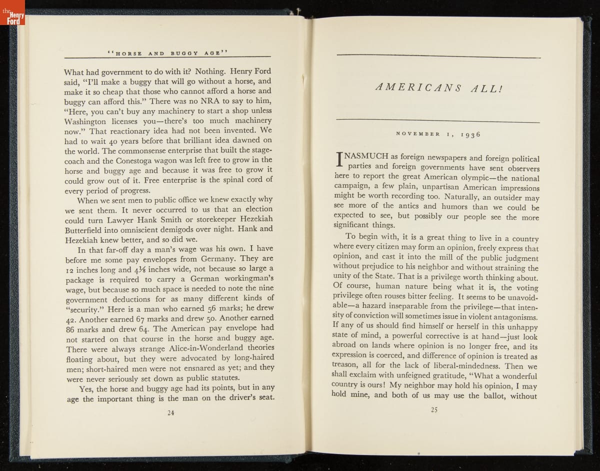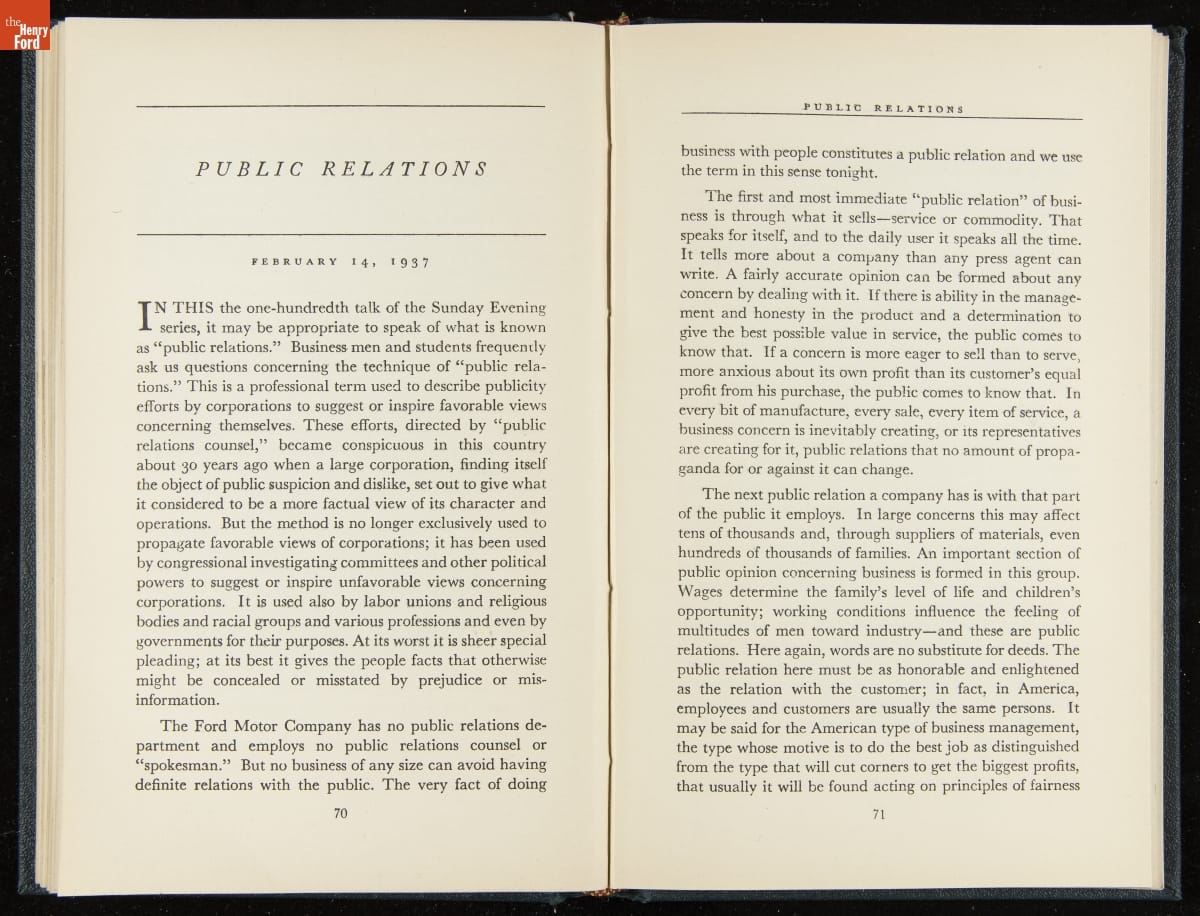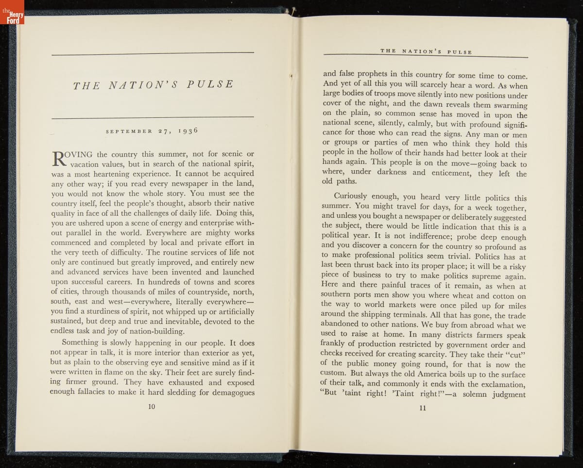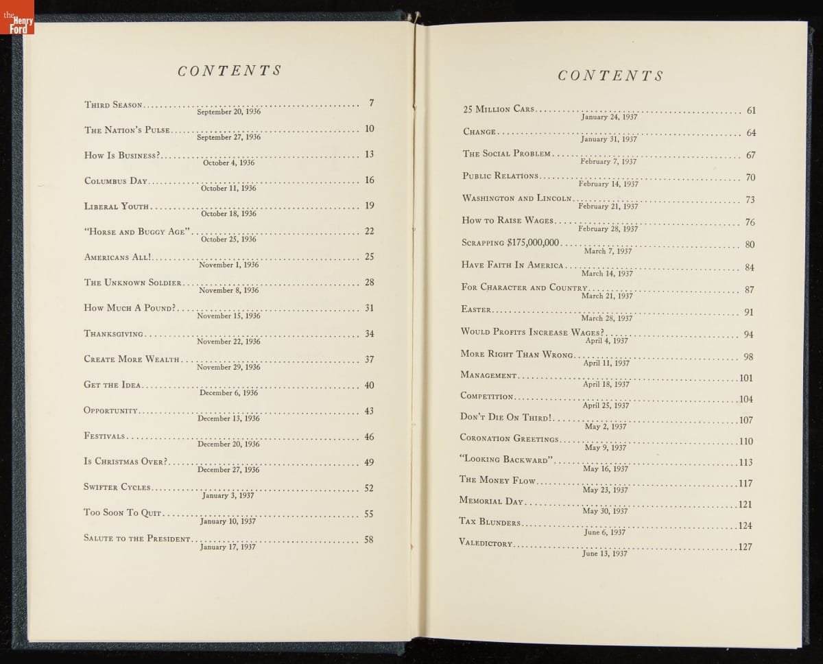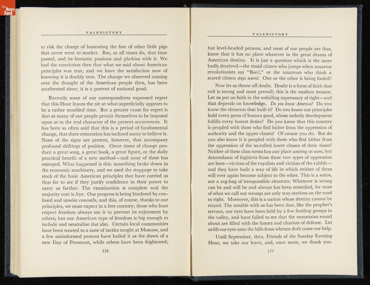 Launched in 1934, the Ford Sunday Evening Hour radio program featured classical music, guest soloists and conductors, and a weekly talk during intermission. Henry Ford asked his friend and advisor William J. Cameron to write and deliver these messages. Cameron, who composed the anti-Semitic articles for The Dearborn Independent, now peddled softer populist views--avoiding extremes and any direct attacks on politicians, ethnic groups, or Wall Street financiers.