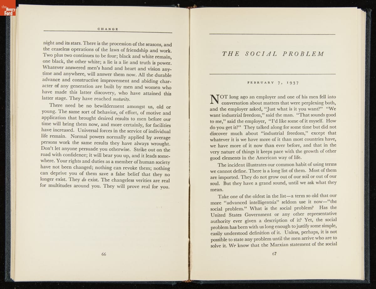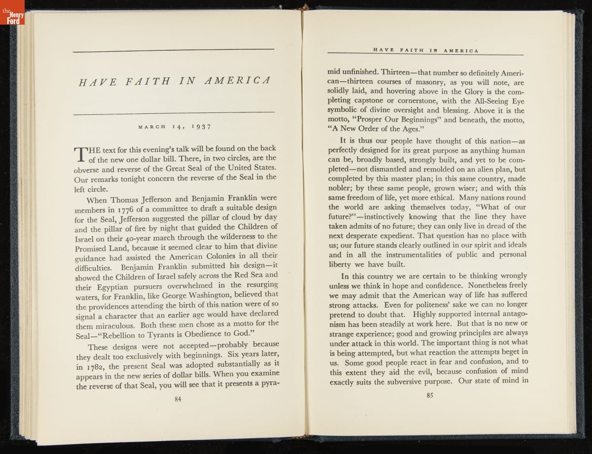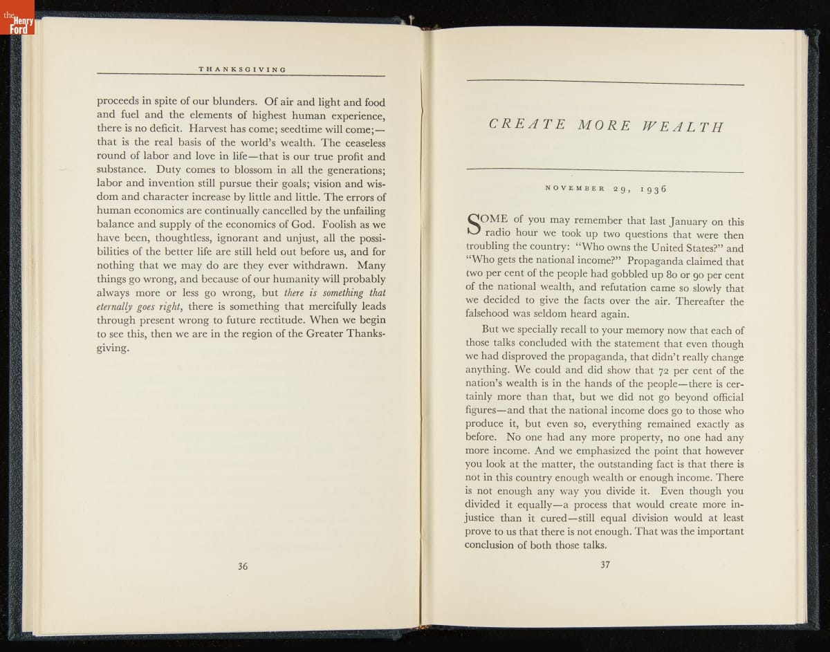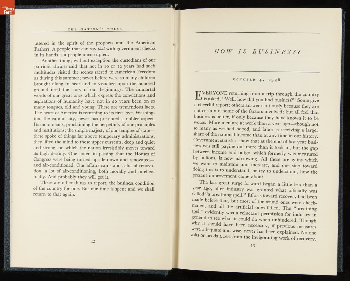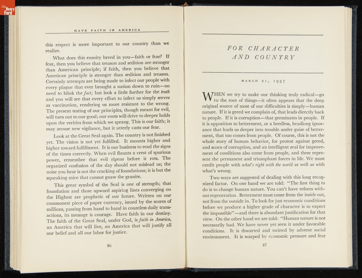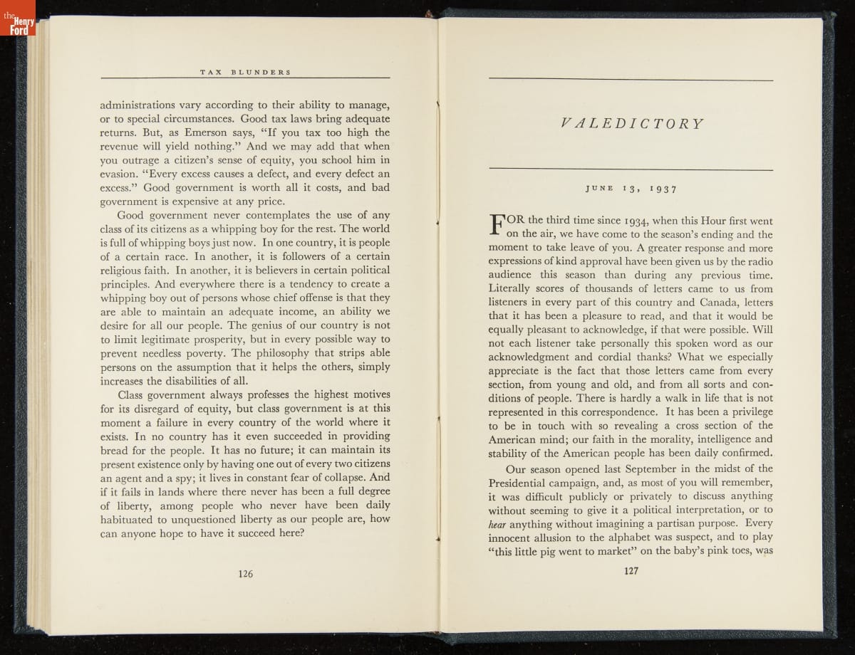 Launched in 1934, the Ford Sunday Evening Hour radio program featured classical music, guest soloists and conductors, and a weekly talk during intermission. Henry Ford asked his friend and advisor William J. Cameron to write and deliver these messages. Cameron, who composed the anti-Semitic articles for The Dearborn Independent, now peddled softer populist views--avoiding extremes and any direct attacks on politicians, ethnic groups, or Wall Street financiers.