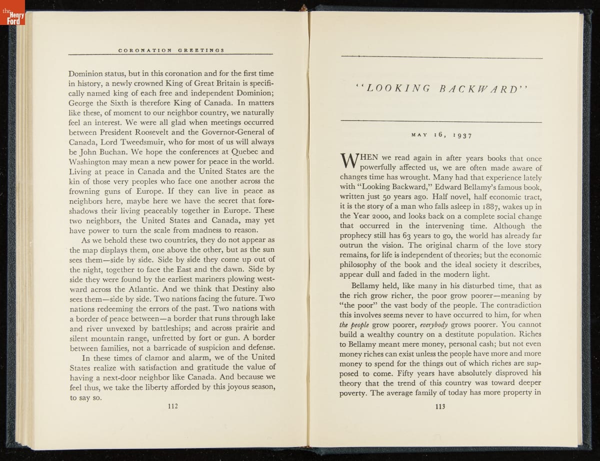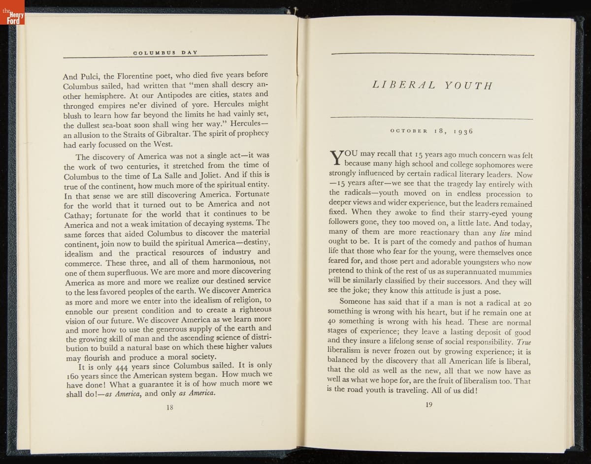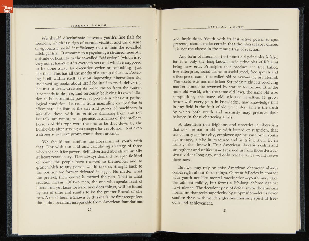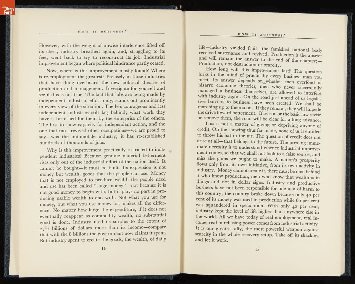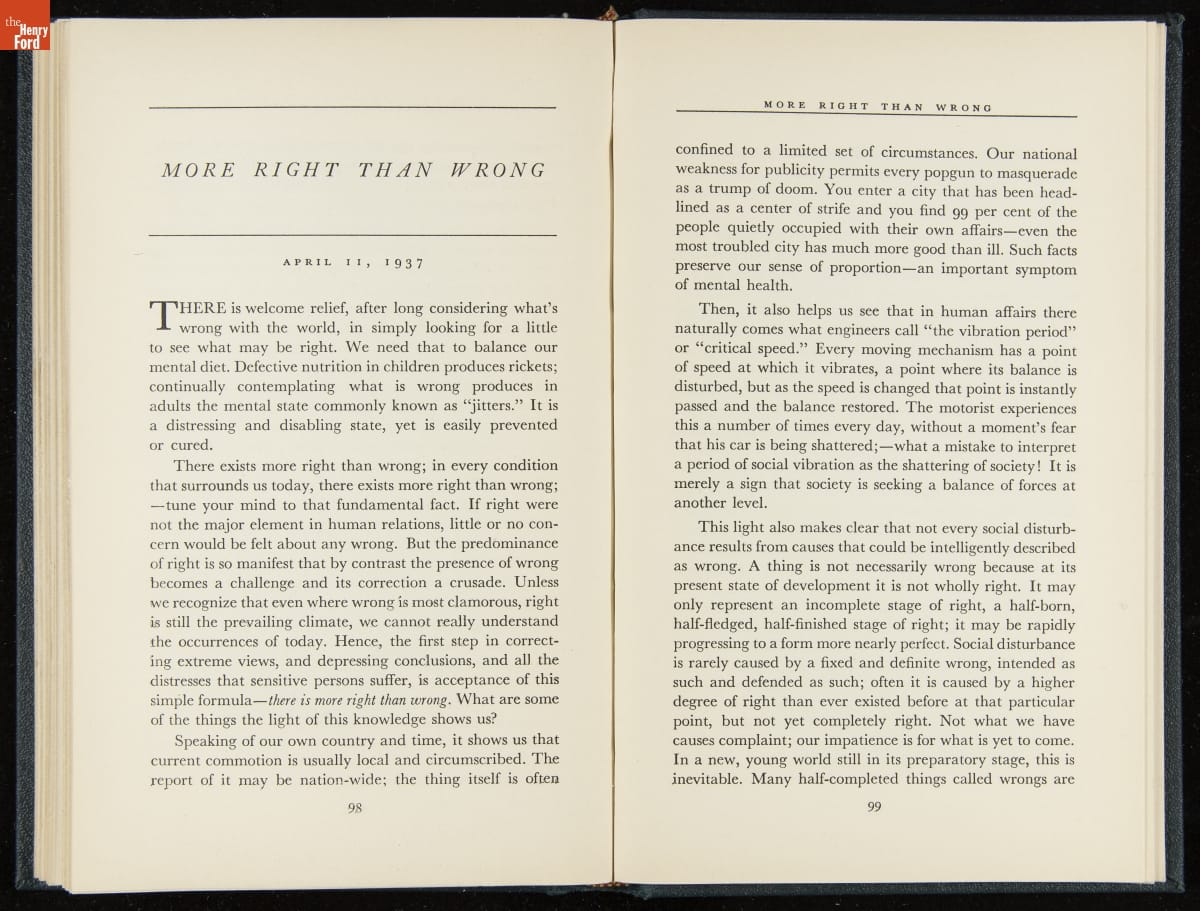 Launched in 1934, the Ford Sunday Evening Hour radio program featured classical music, guest soloists and conductors, and a weekly talk during intermission. Henry Ford asked his friend and advisor William J. Cameron to write and deliver these messages. Cameron, who composed the anti-Semitic articles for The Dearborn Independent, now peddled softer populist views--avoiding extremes and any direct attacks on politicians, ethnic groups, or Wall Street financiers.