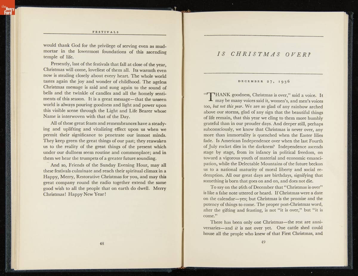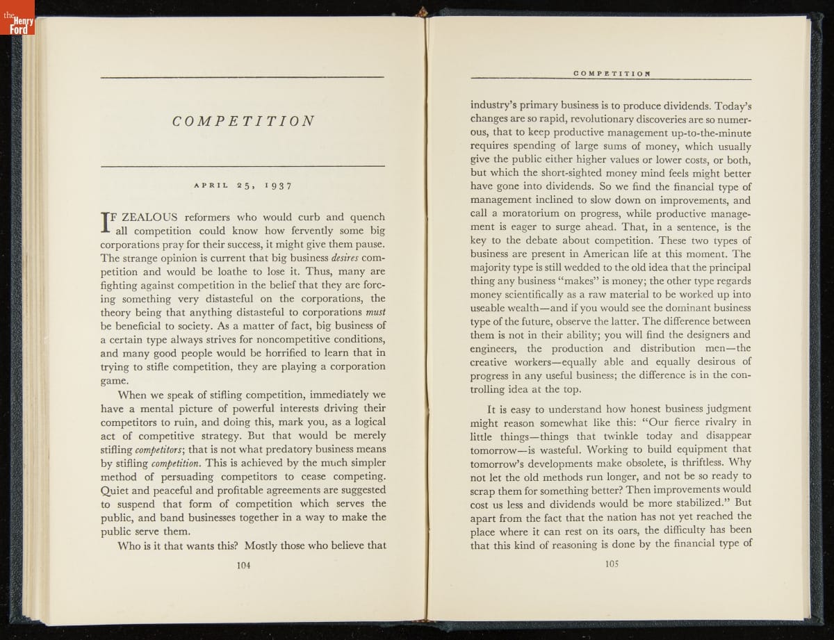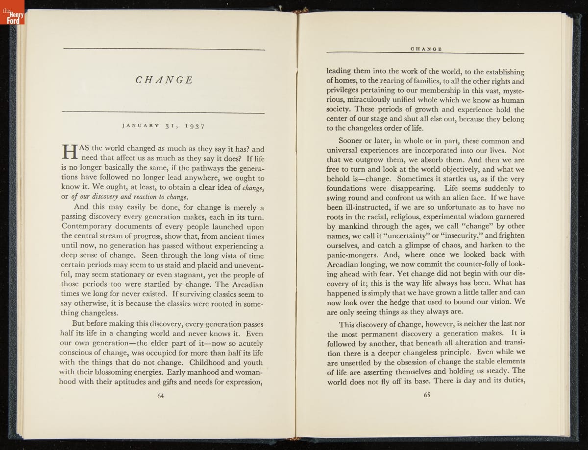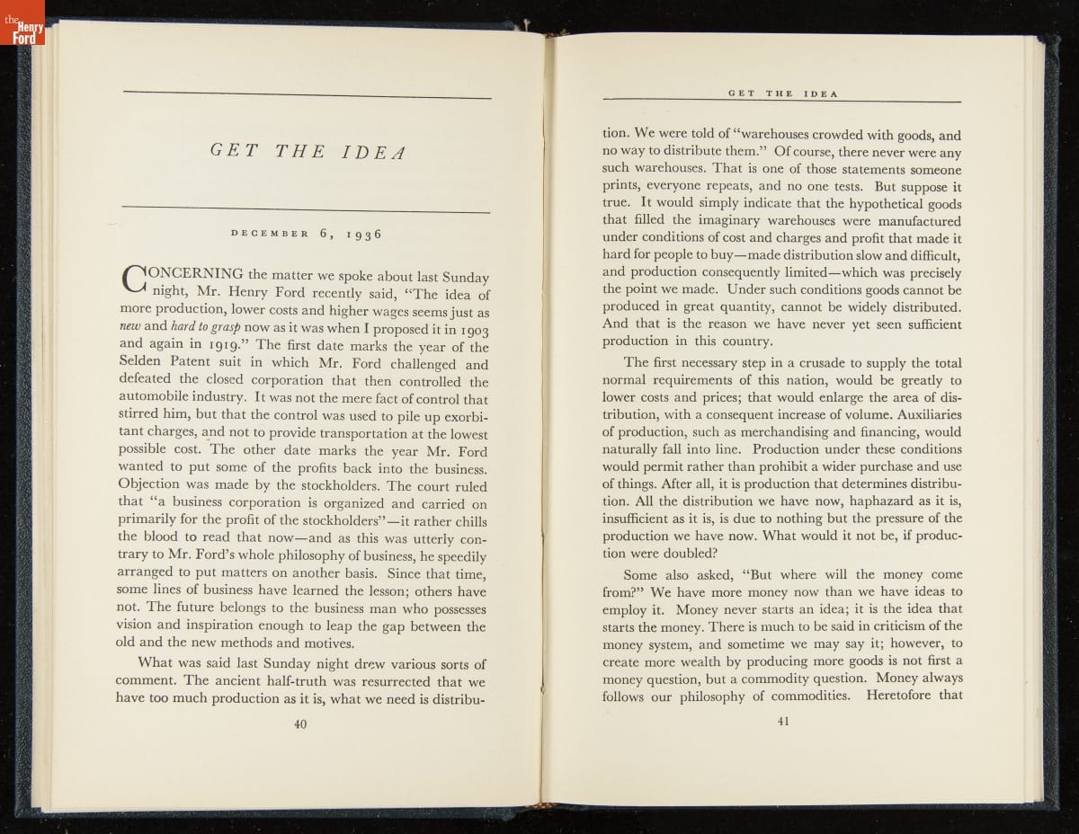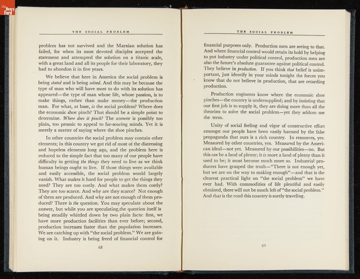 Launched in 1934, the Ford Sunday Evening Hour radio program featured classical music, guest soloists and conductors, and a weekly talk during intermission. Henry Ford asked his friend and advisor William J. Cameron to write and deliver these messages. Cameron, who composed the anti-Semitic articles for The Dearborn Independent, now peddled softer populist views--avoiding extremes and any direct attacks on politicians, ethnic groups, or Wall Street financiers.